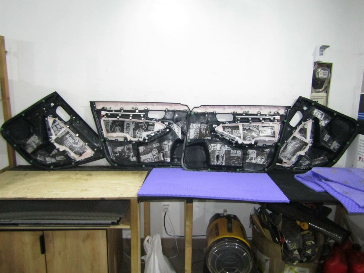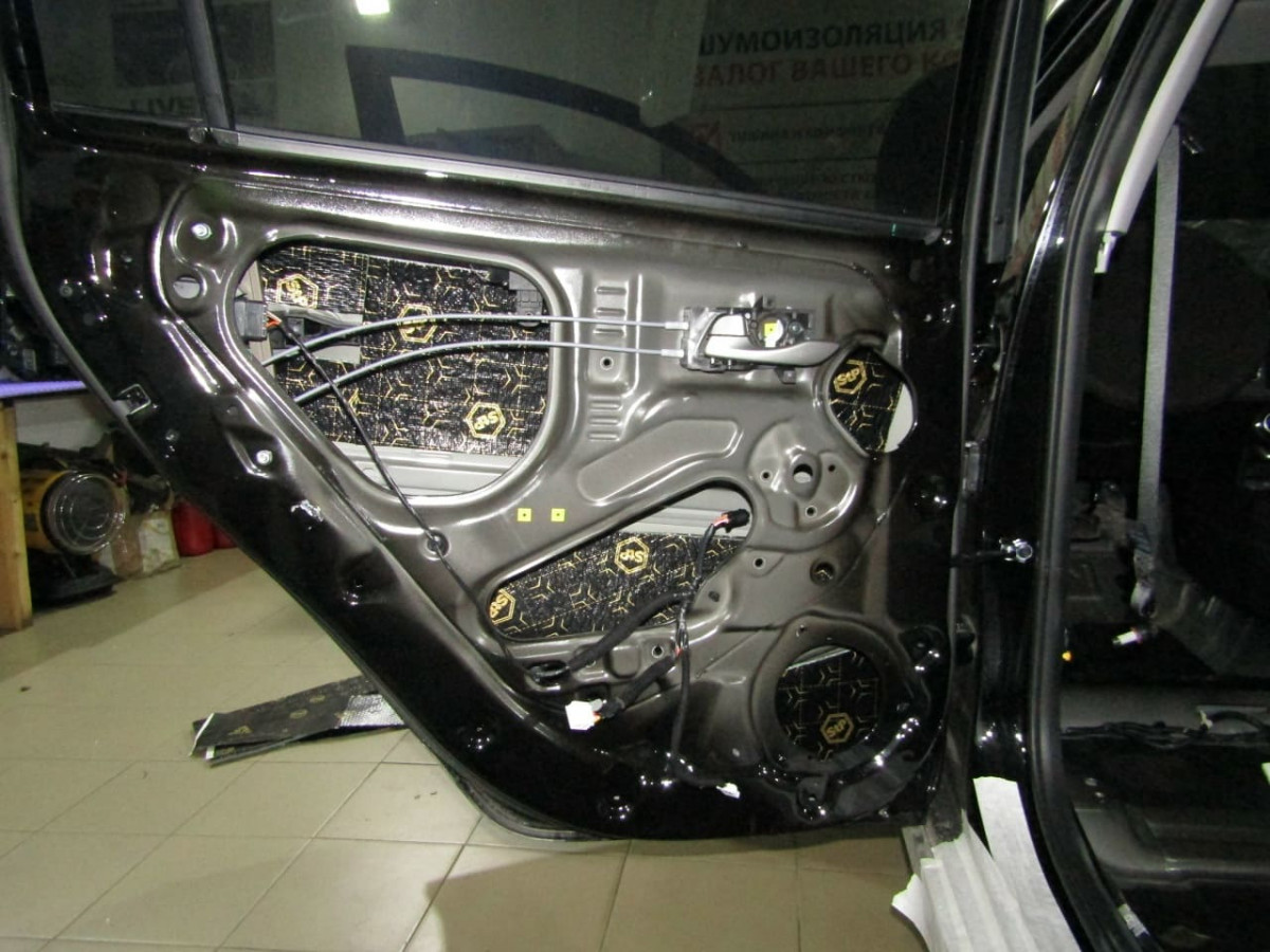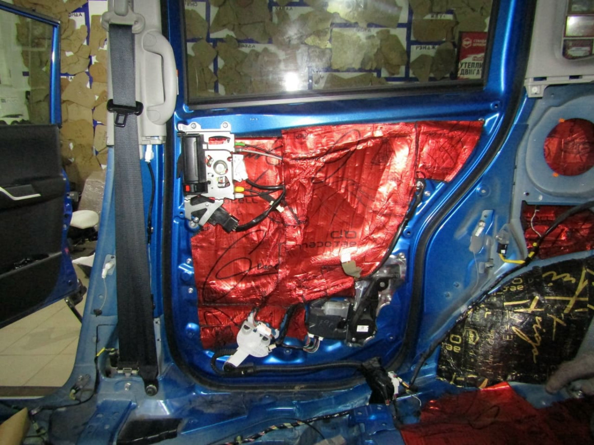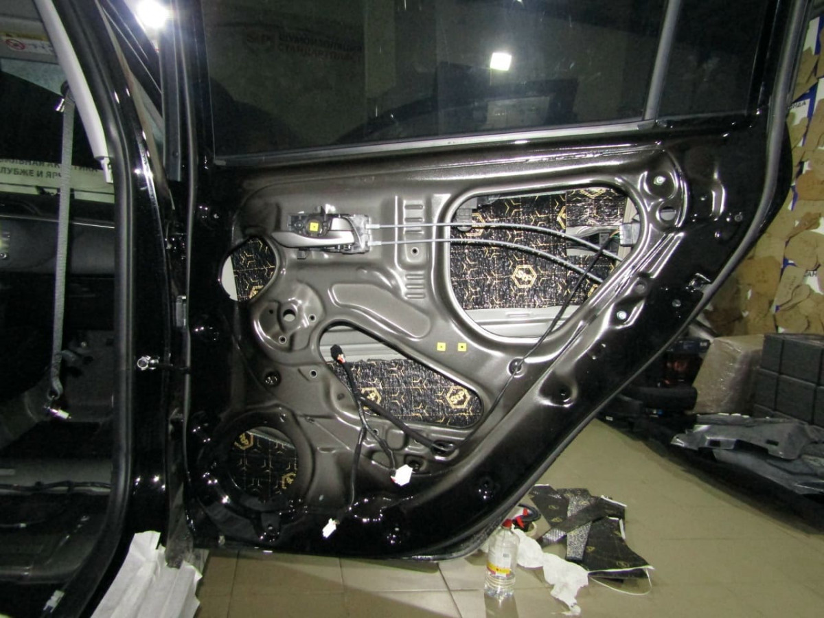 После обезжиривания фольгированного слоя вибродемпфера устанавливается второй слой из STP Bromo, выполняющий функции шумопоглощения и дополнительной виброизоляции. На завершающем этапе специалисты устанавливают обшивки на место.