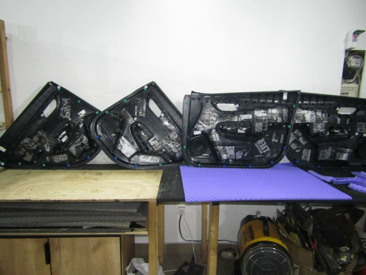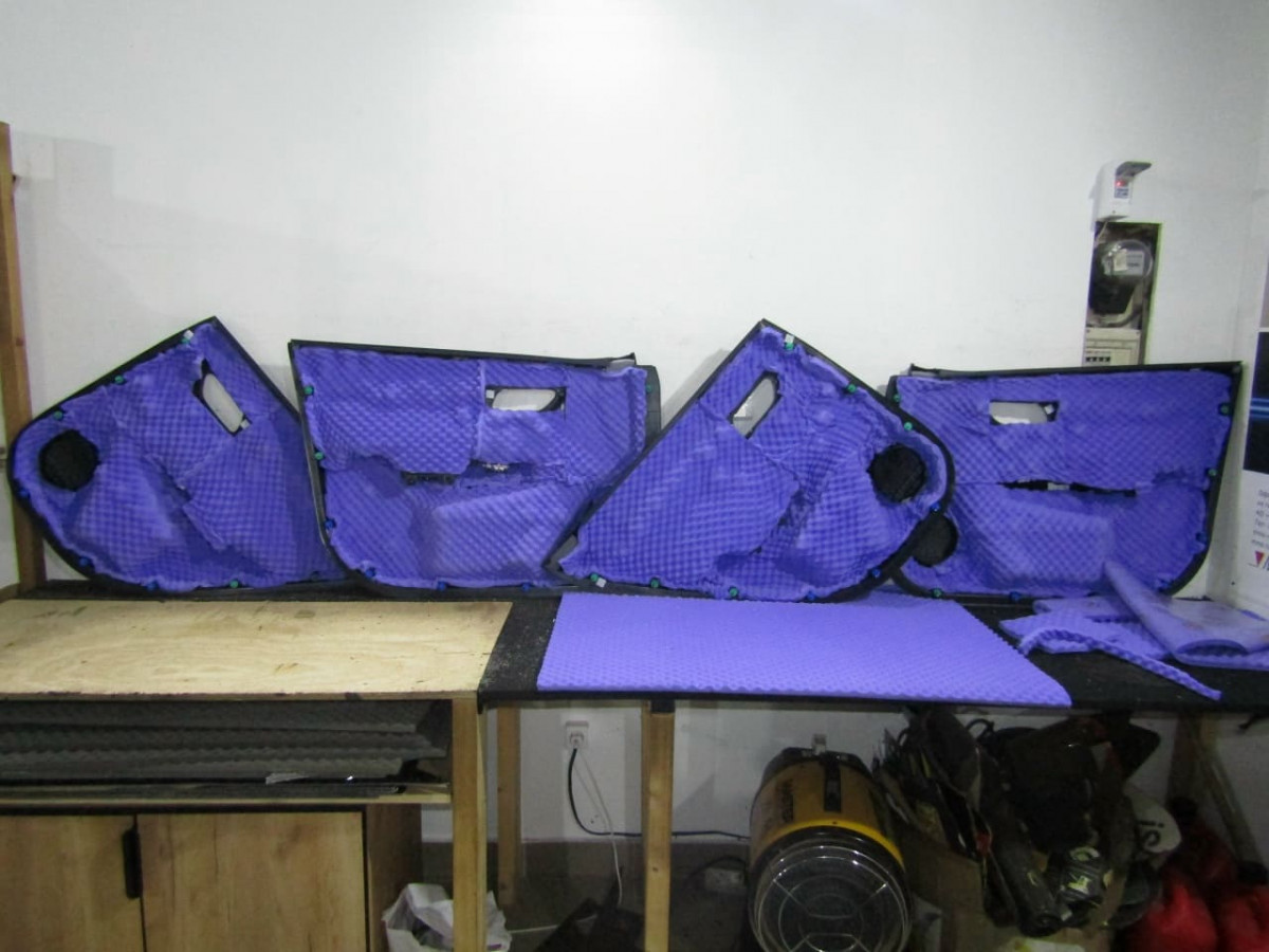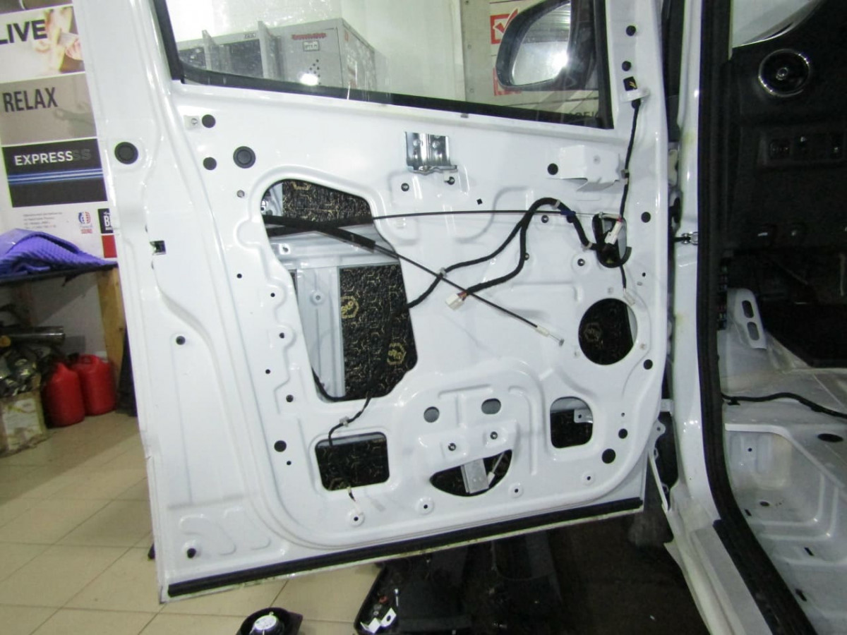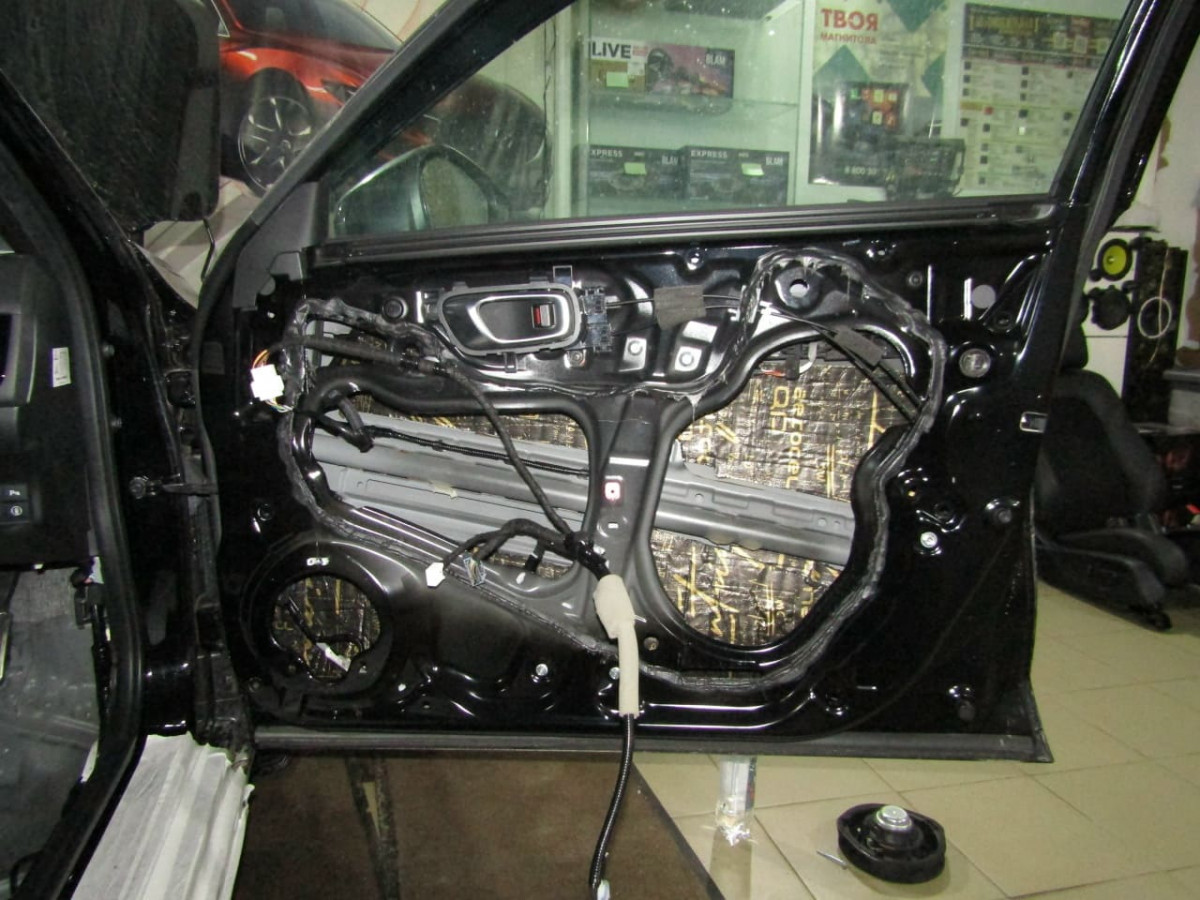 После обезжиривания фольгированного слоя вибродемпфера устанавливается второй слой из STP Bromo, выполняющий функции шумопоглощения и дополнительной виброизоляции. На завершающем этапе специалисты устанавливают обшивки на место.
