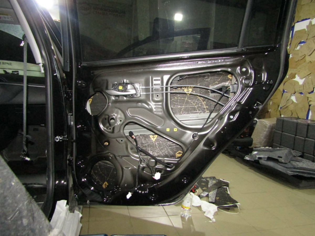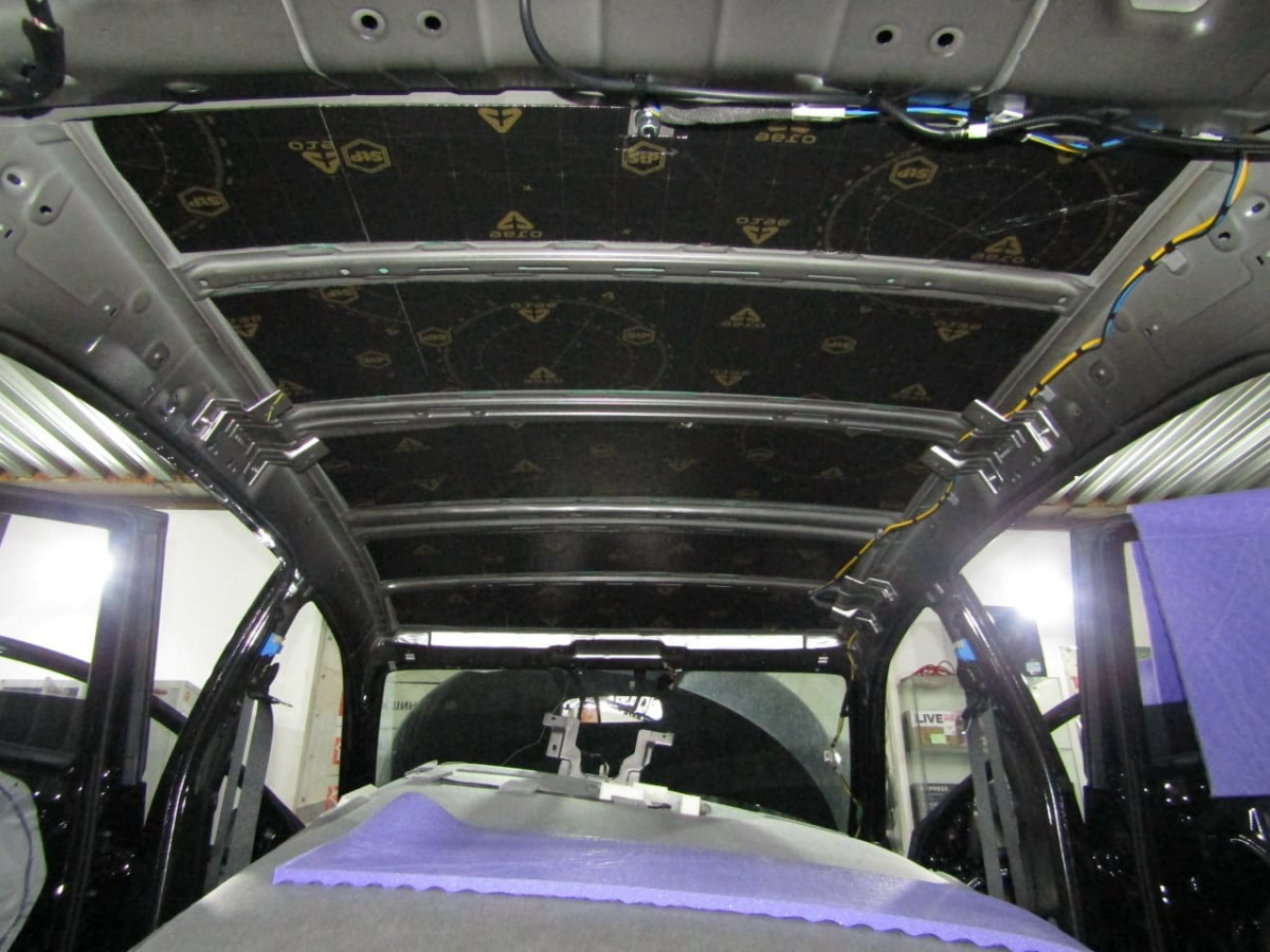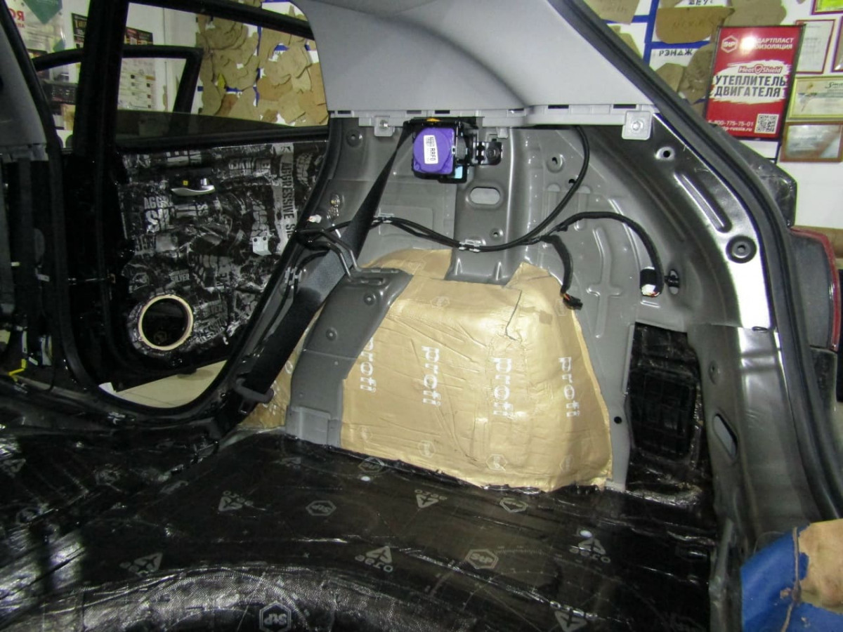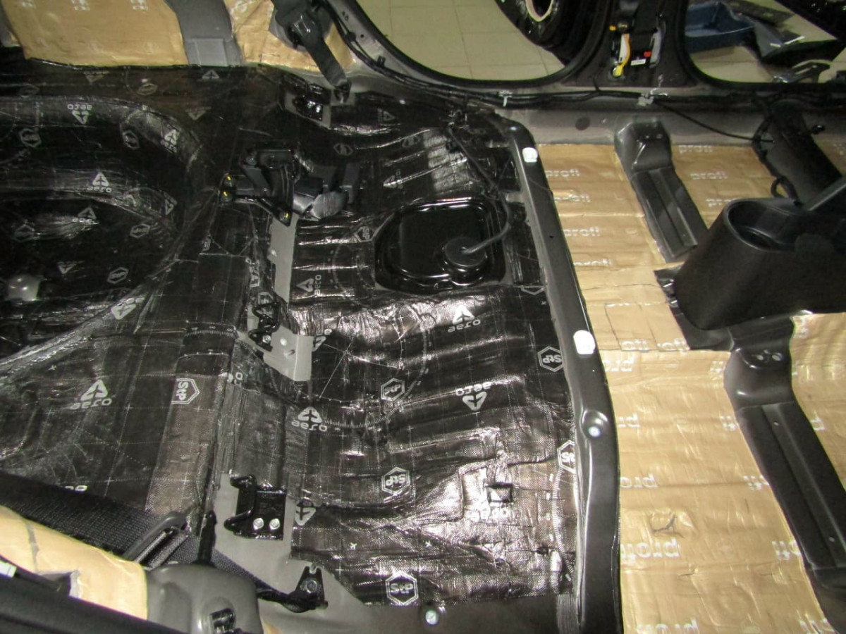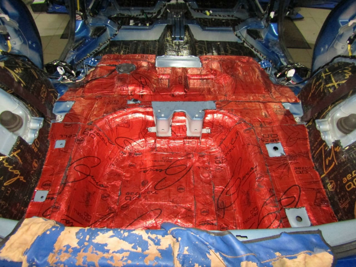 Обработка арок ‒ достаточно сложный, многоэтапный процесс. Чтобы получить доступ к металлу, специалистам необходимо разобрать багажный отдел и пол салона. Также металл очищают и обезжиривают. Первым устанавливается толстый и плотный вибродемпфер STP Aerocell Intrigo. Этот слой гасит вибрации и не дает им распространяться на другие части кузова. Для плотного прилегания материал прикатывается тяжелым валиком.