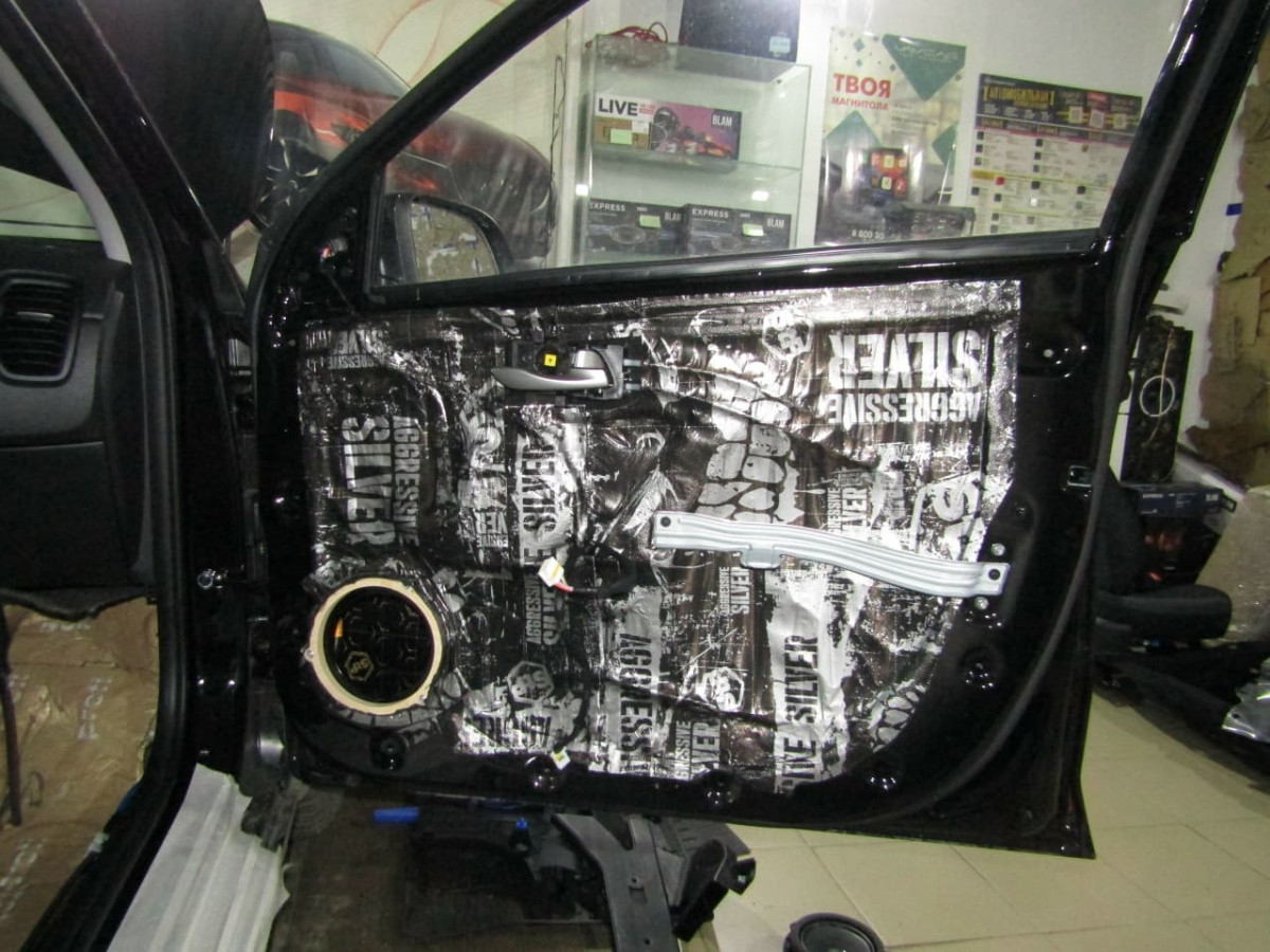 После установки вибродемпфера начинается работа с пластиковой обшивкой. Проклеивают виброизолятором STP Silver и шумопоглотителем STP Biplast Premium. Установка этих материалов позволяет полностью устранить резонансы и предотвратить проникновение внешних звуков.