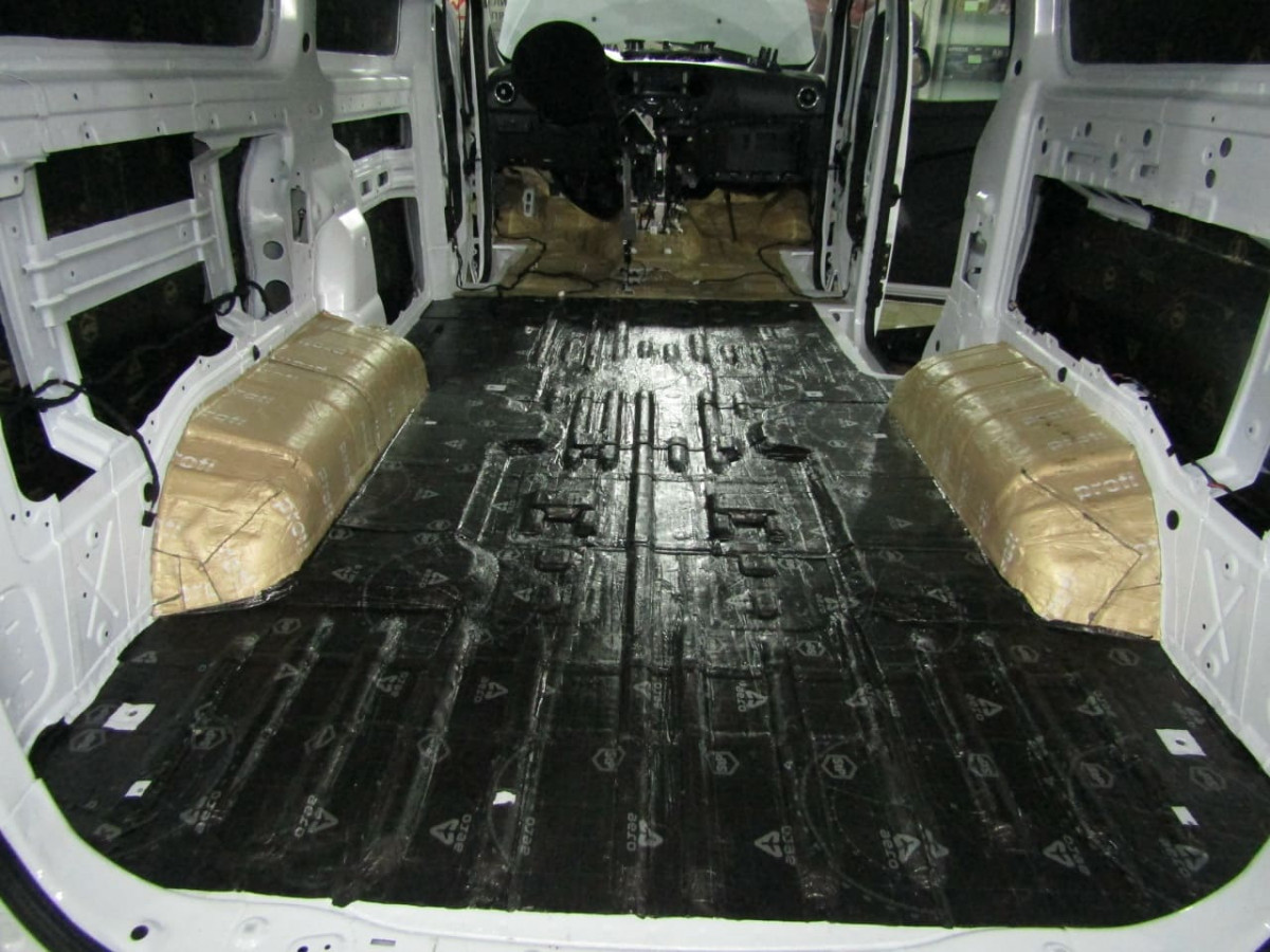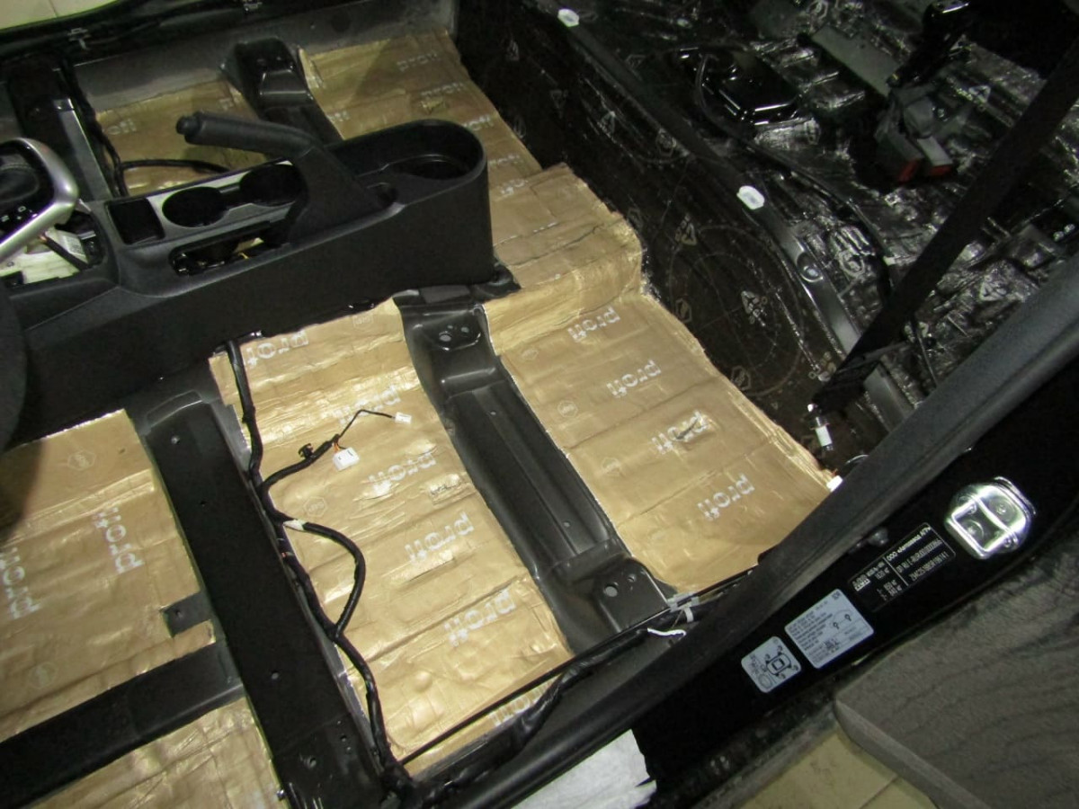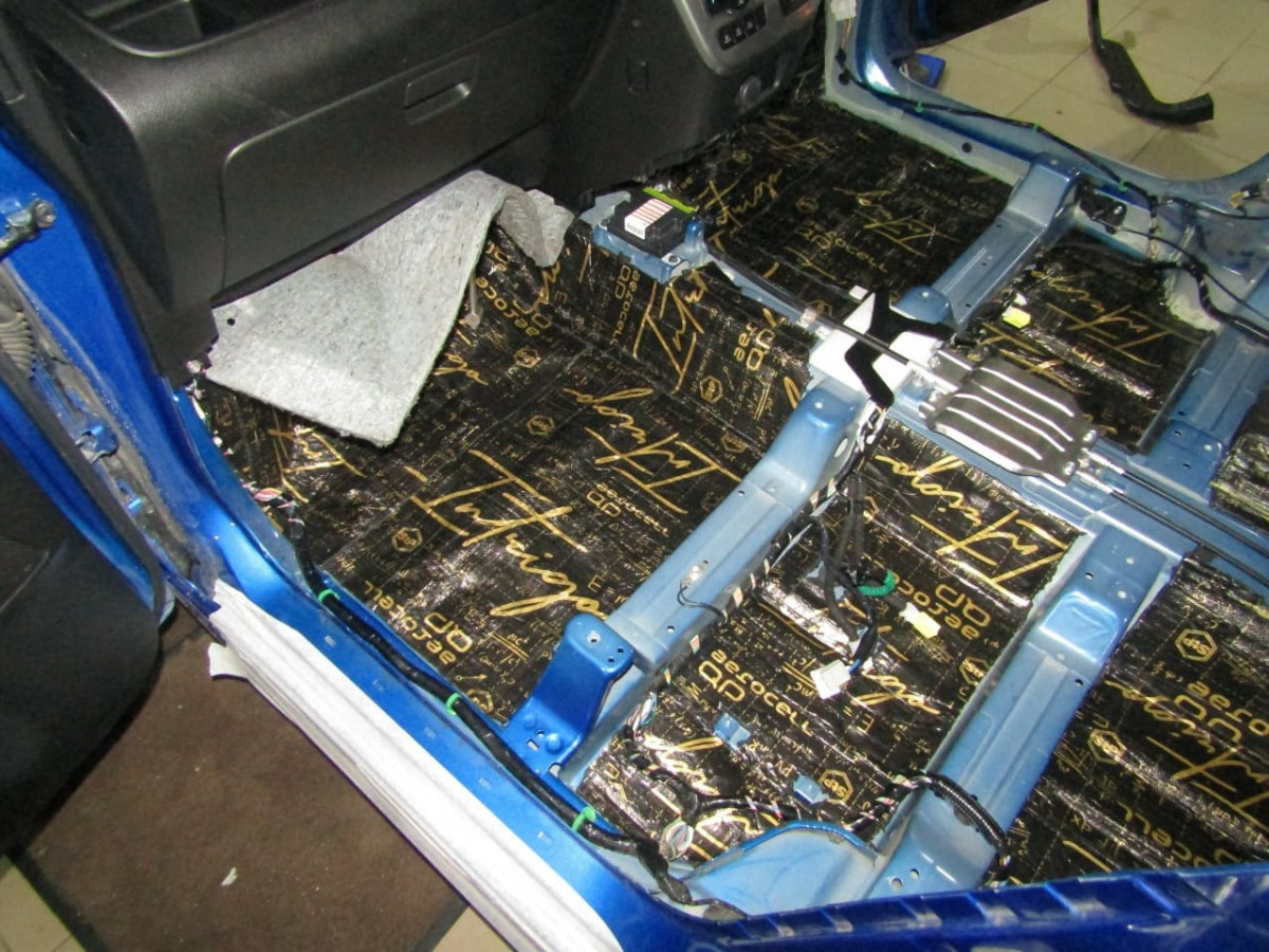 Шумоизоляция днища начинается с разборки салона. Специалисты демонтируют и выносят: сиденья, центральную консоль, ковролиновую обшивку. Далее они проверяют наличие штатной шумоизоляции, ее качество и степень адгезии. Остатки материалов чаще всего приходится удалять перед установкой новых листов.