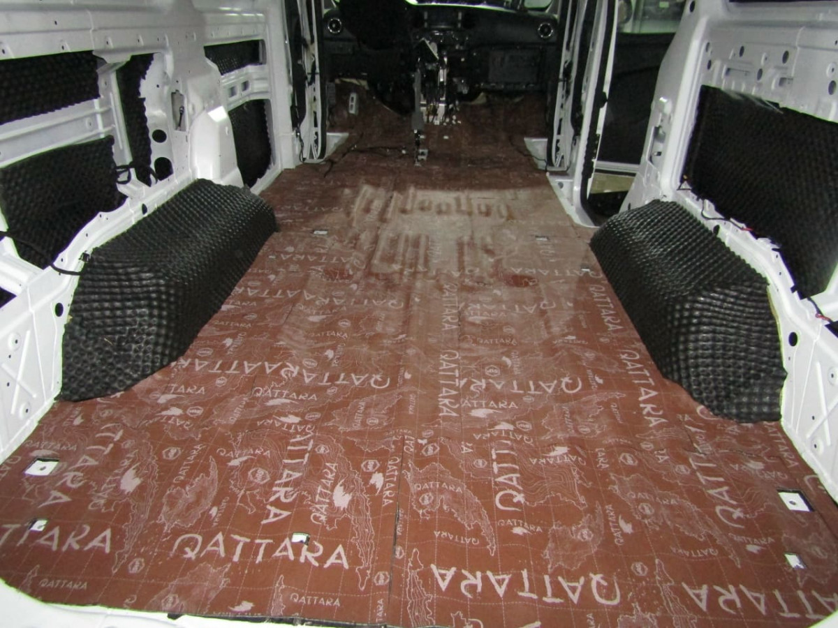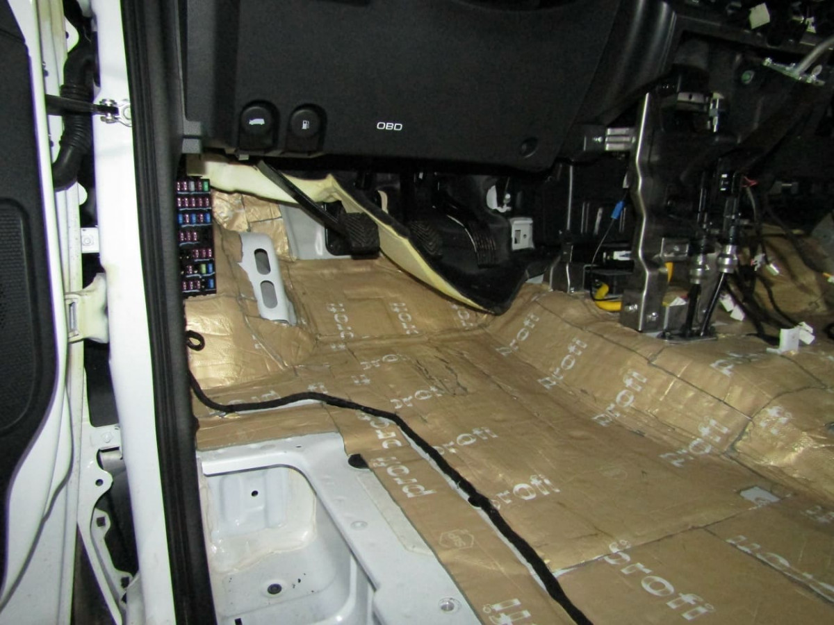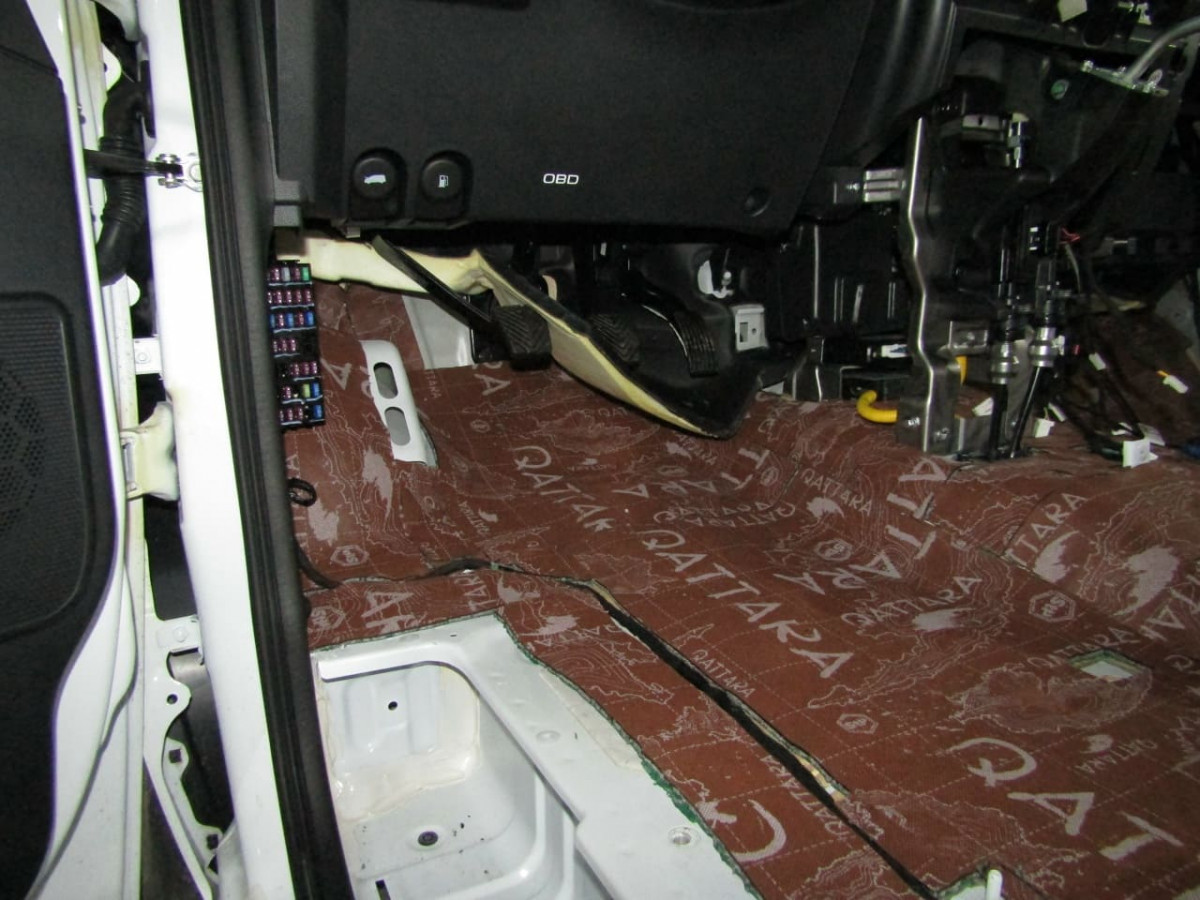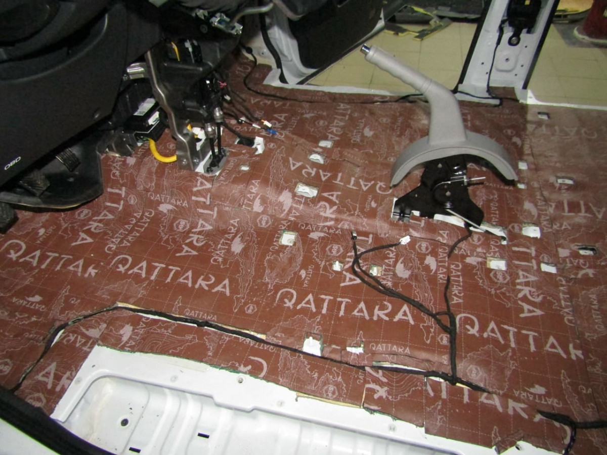 Шумоизоляция днища начинается с разборки салона. Специалисты демонтируют и выносят: сиденья, центральную консоль, ковролиновую обшивку. Далее они проверяют наличие штатной шумоизоляции, ее качество и степень адгезии. Остатки материалов чаще всего приходится удалять перед установкой новых листов.