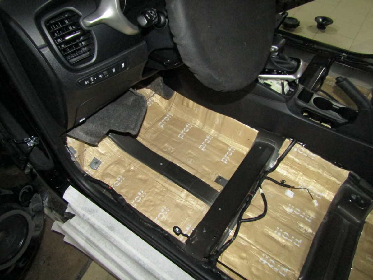 На обрабатываемых областях бывает немало пыли и загрязнений, которые необходимо полностью удалить. После генеральной уборки поверхности обезжиривают и сушат. Теперь можно приступать к укладке виброизоляционного слоя. Для изоляции днища используются высокоэффективные вибродемпферы: STP Aerocell Genio укладывается под задние сиденья, STP Aerocell Intrigo ‒ в передней и задней части пола. Виброизоляция пола избавит от неприятных вибраций, передающихся на ноги водителя и пассажиров.