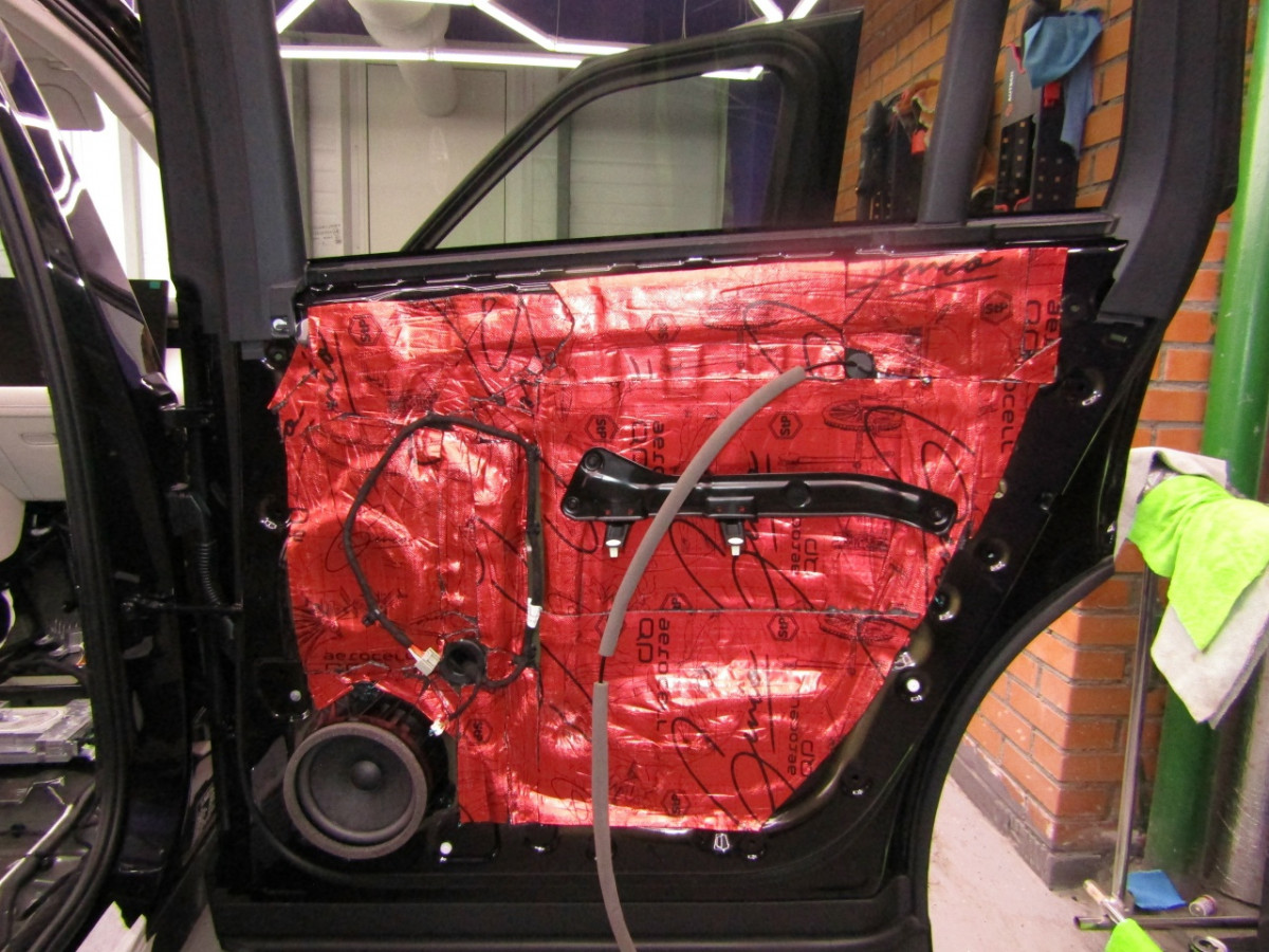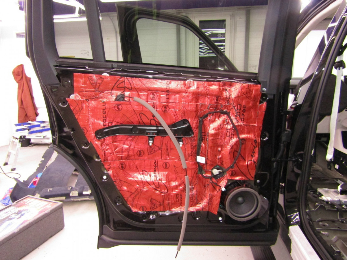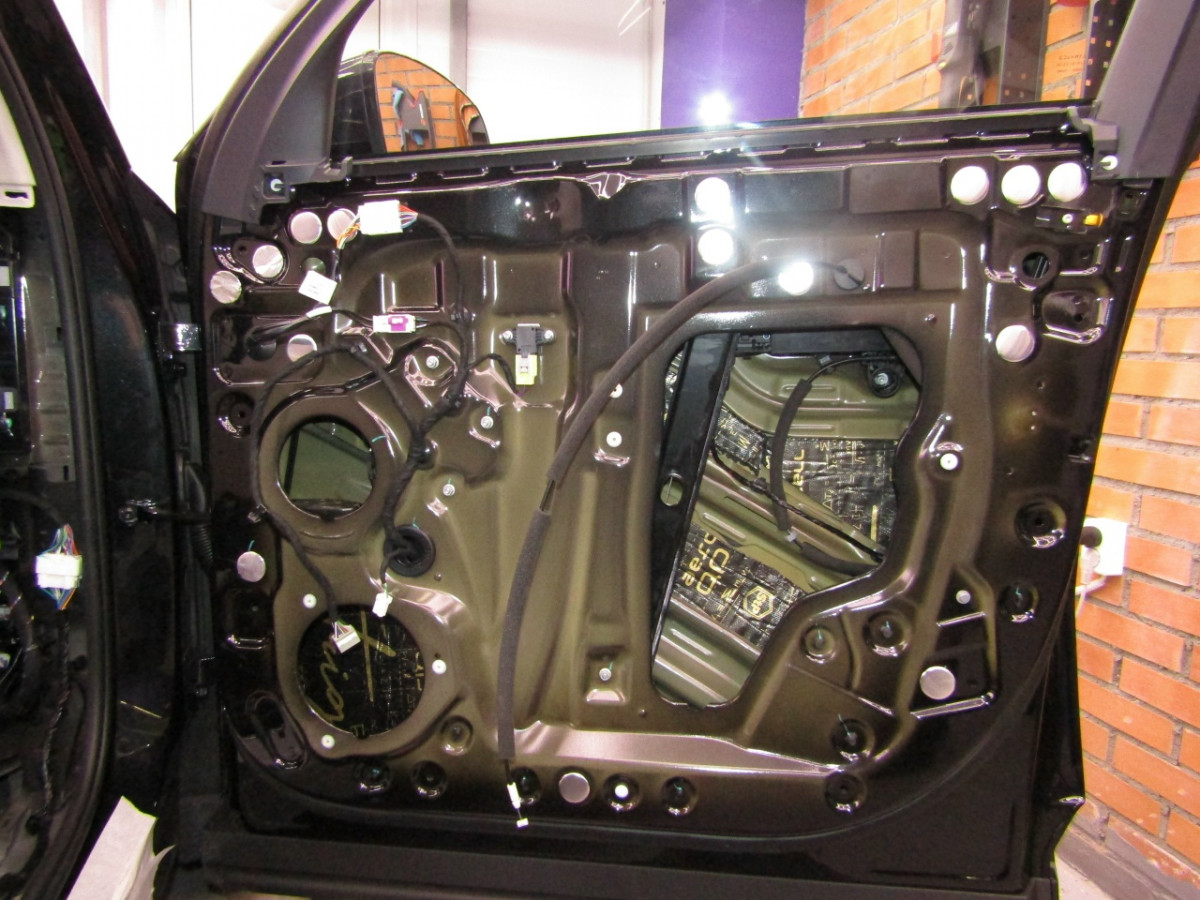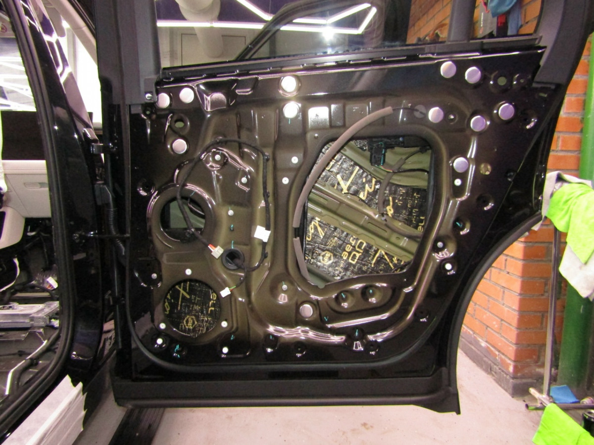 Перед началом шумоизоляции специалисты аккуратно демонтируют дверную обшивку, отключают всю электронику. Далее мастера выполняют стандартные монтажные работы: