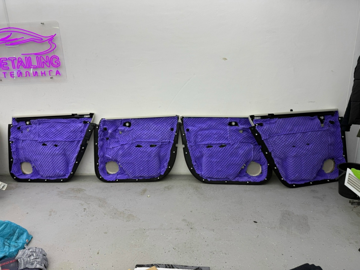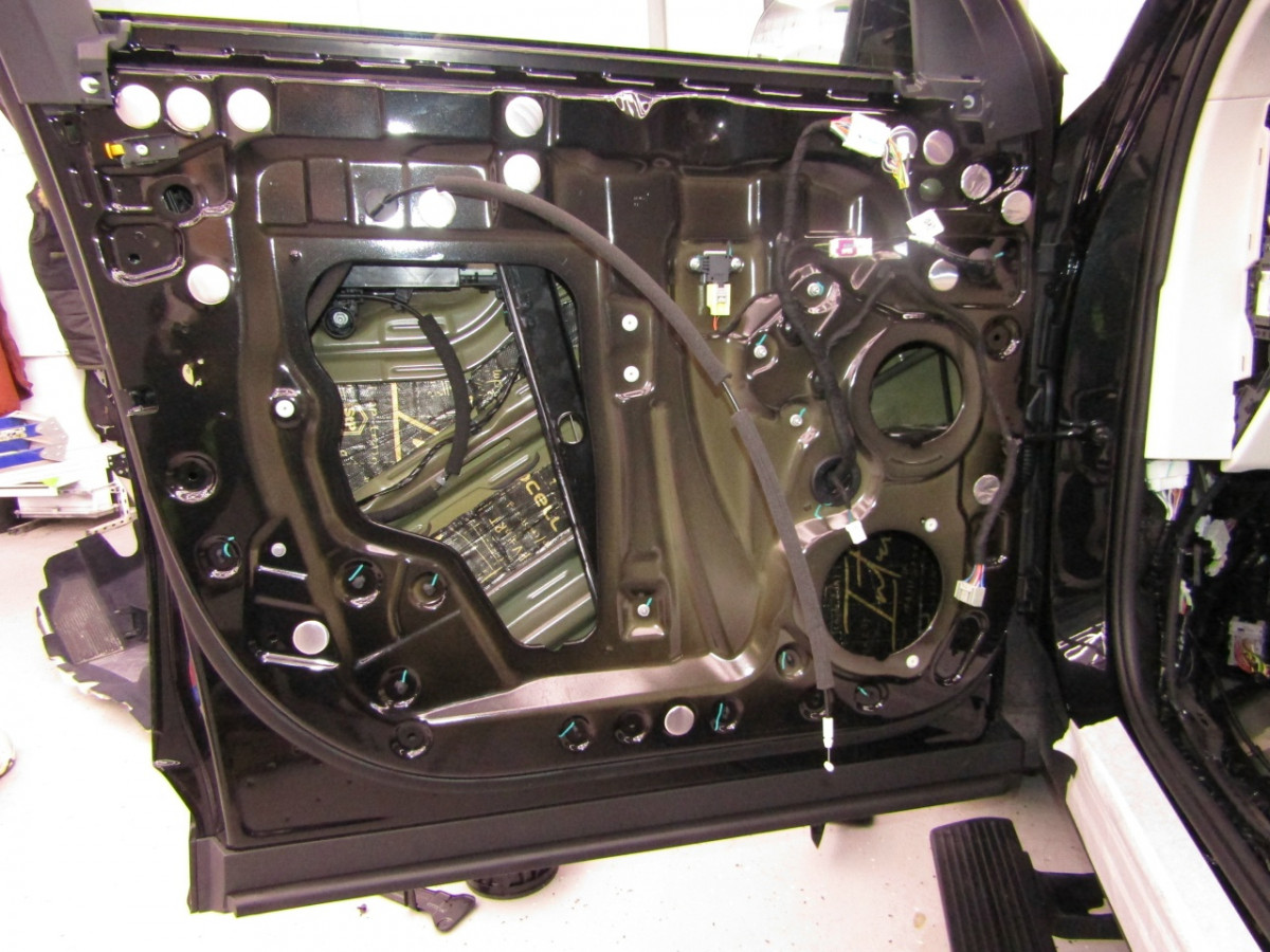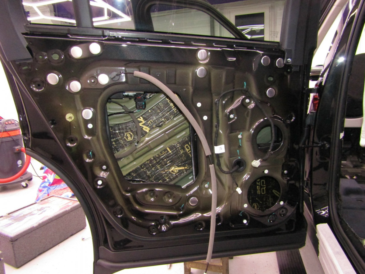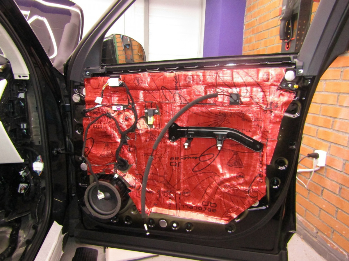 Перед началом шумоизоляции специалисты аккуратно демонтируют дверную обшивку, отключают всю электронику. Далее мастера выполняют стандартные монтажные работы: