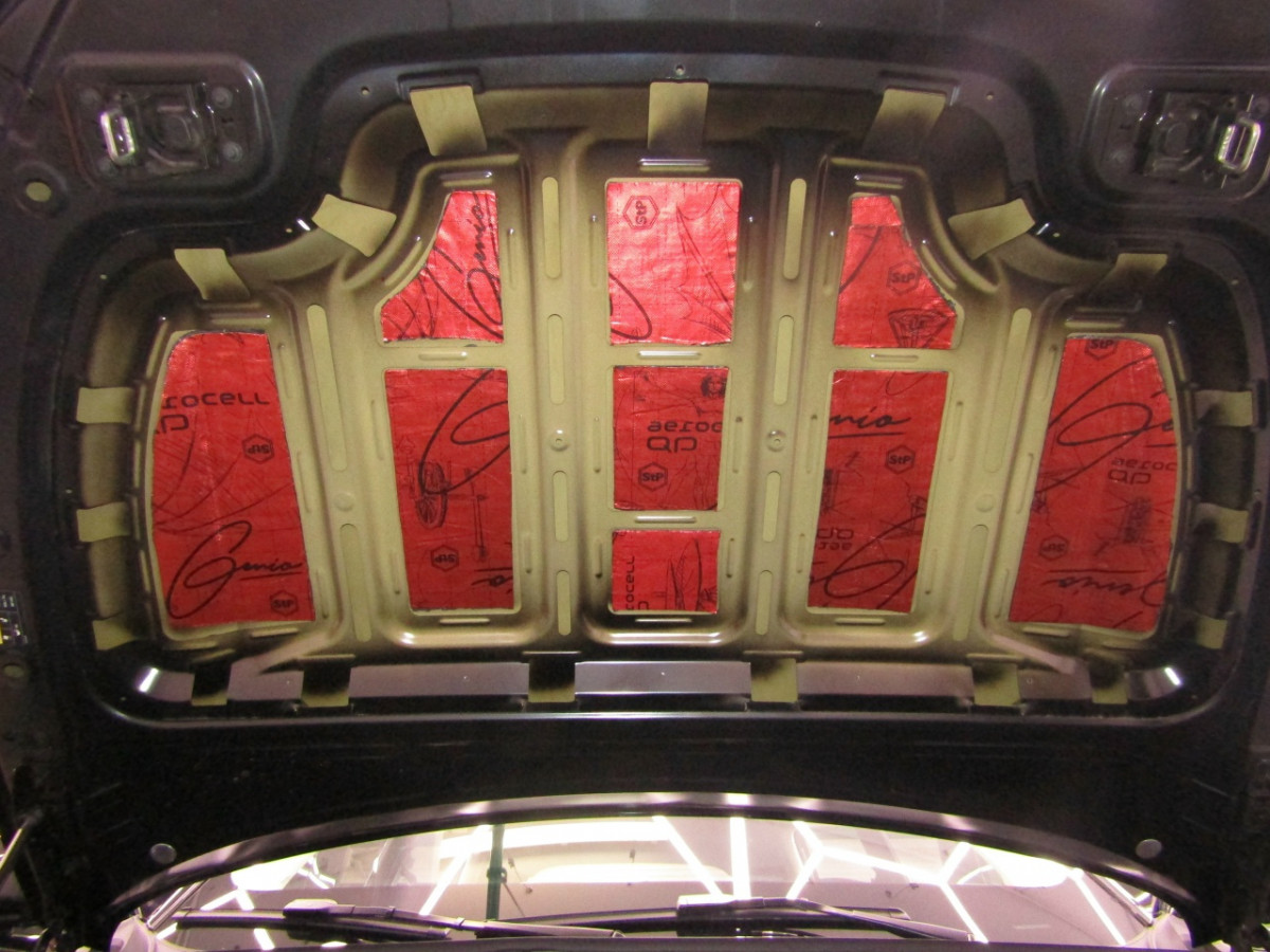 Подготовка начинается с удаления пыли, грязи и масляных пятен, препятствующих нормальной фиксации вибродемпфера. Для придания крышке капота большей прочности и подавления колебаний с внутренней стороны устанавливается уже известный STP Aerocell Genio. Поглощать издаваемые двигателем звуки будет именно этот материал. Это плотный лист с ячеистой структурой и металлизированным слоем. Попадая в поры материала, звук остается в них и со временем рассеивается.