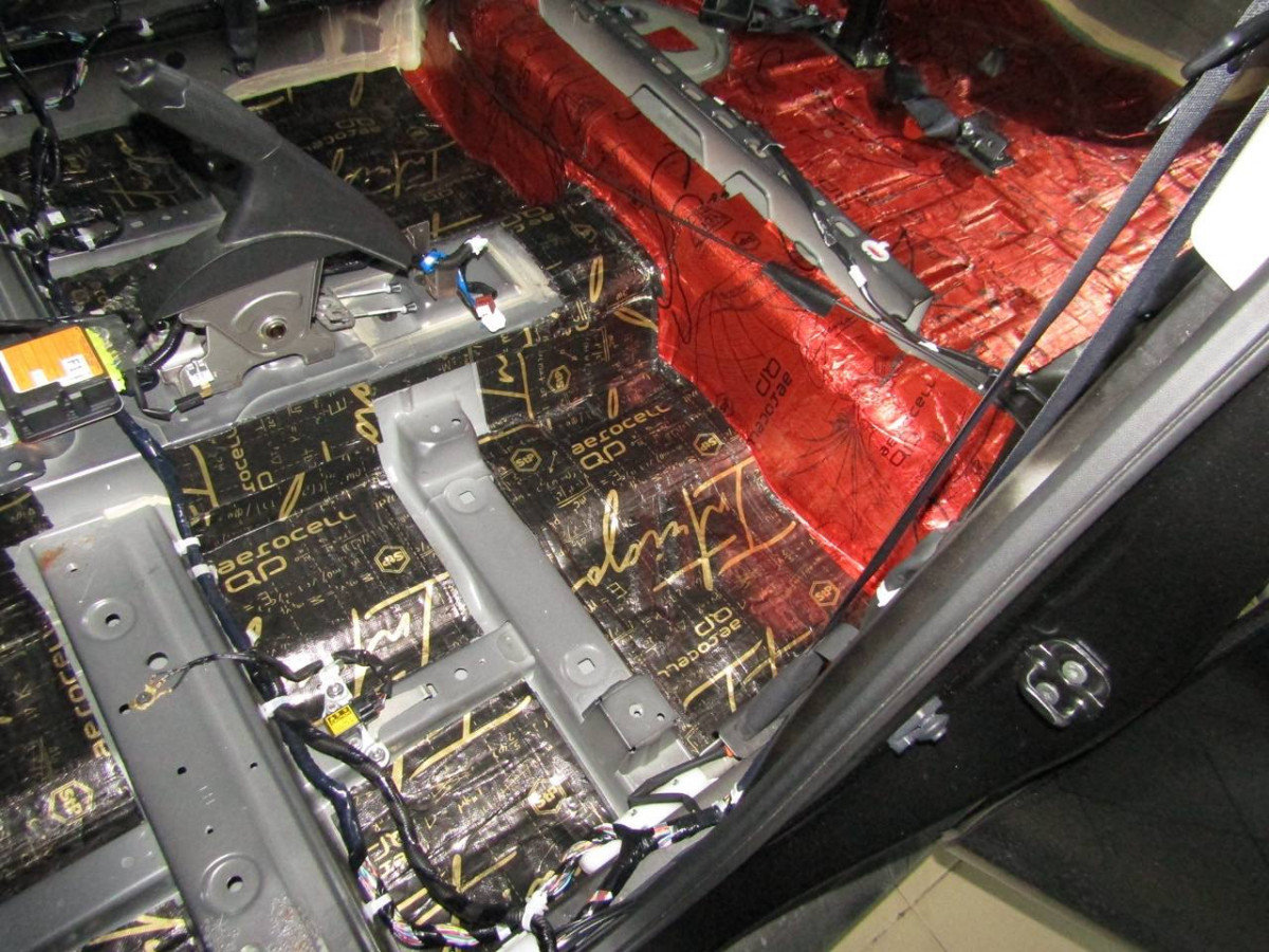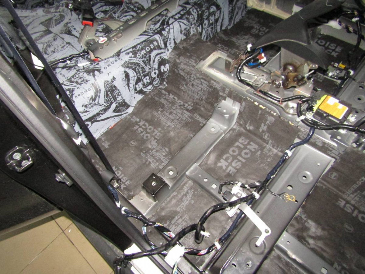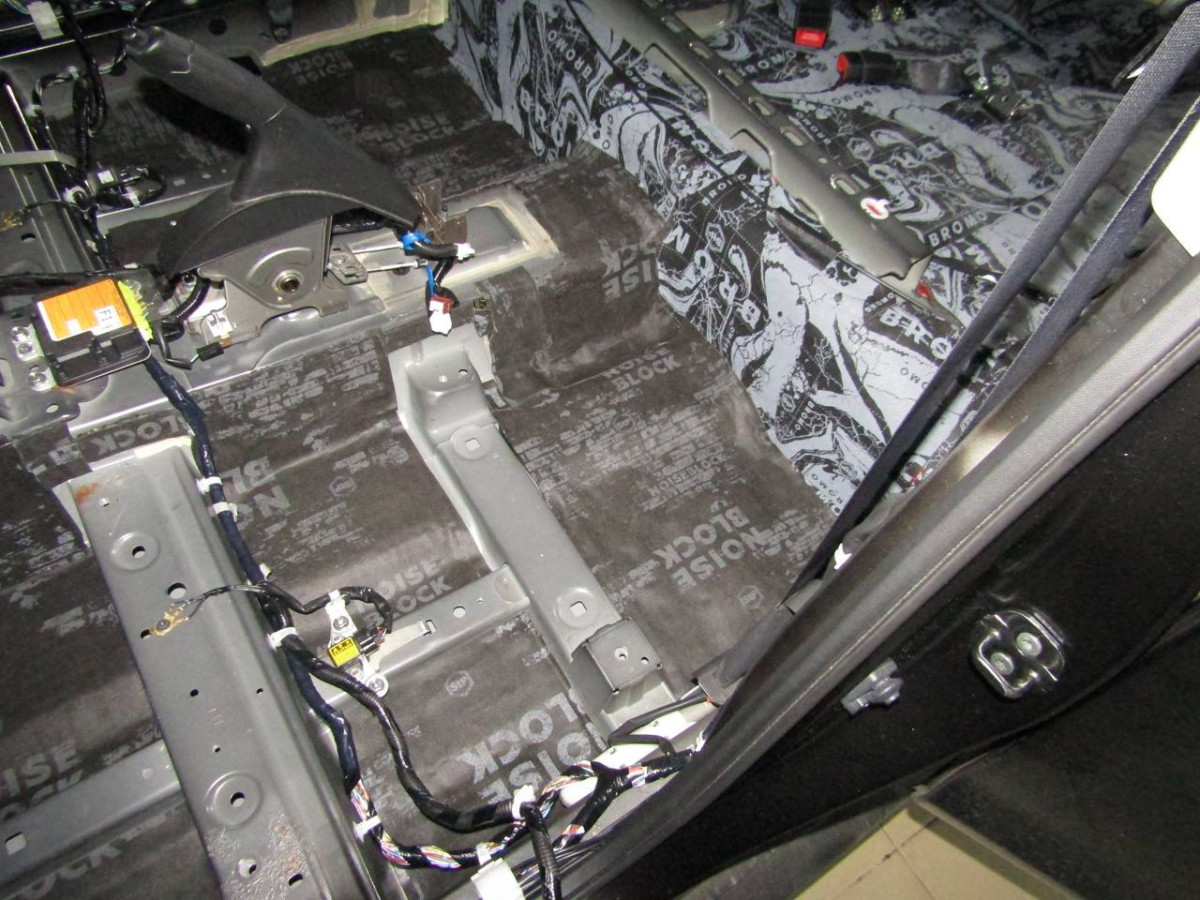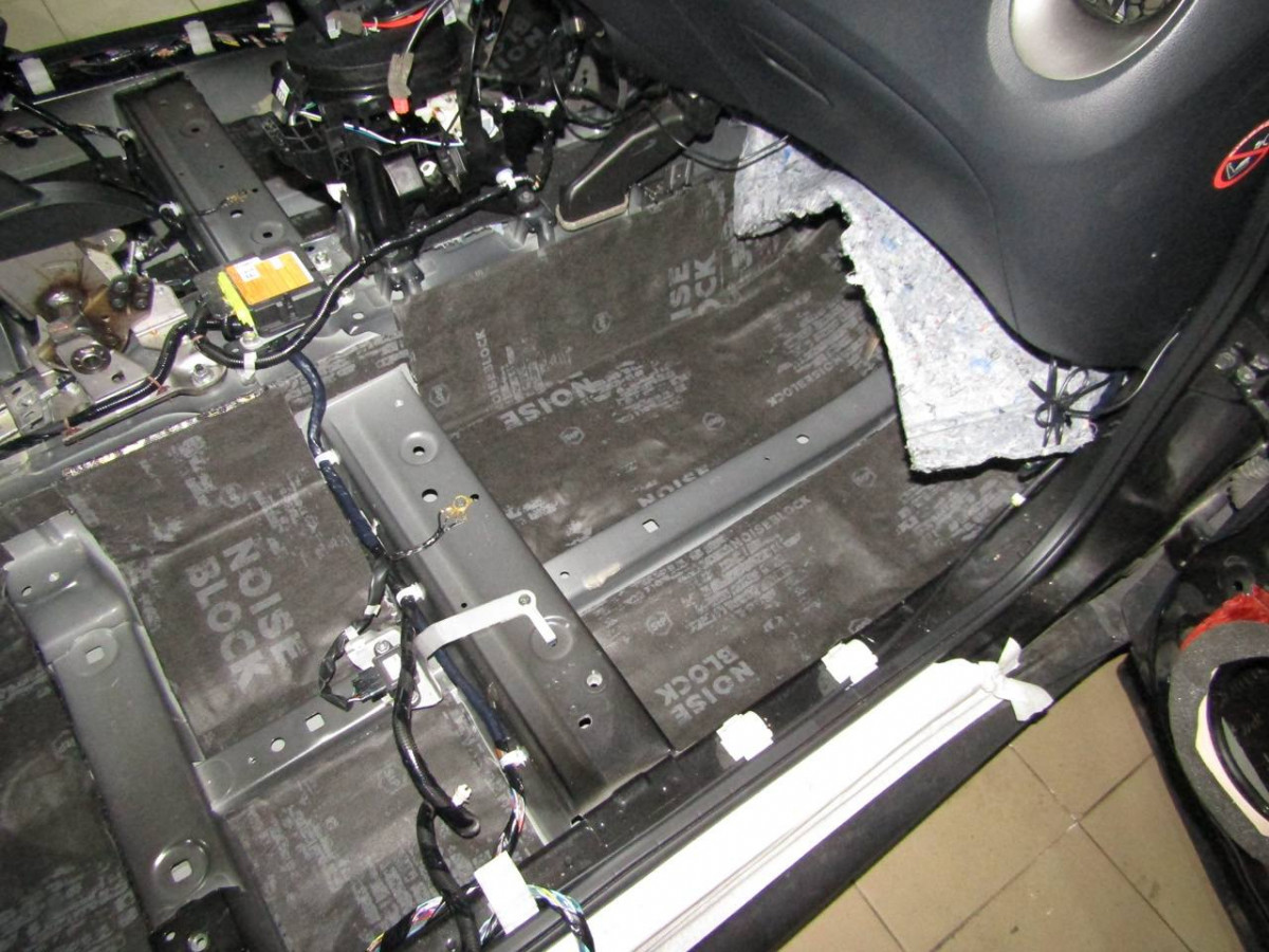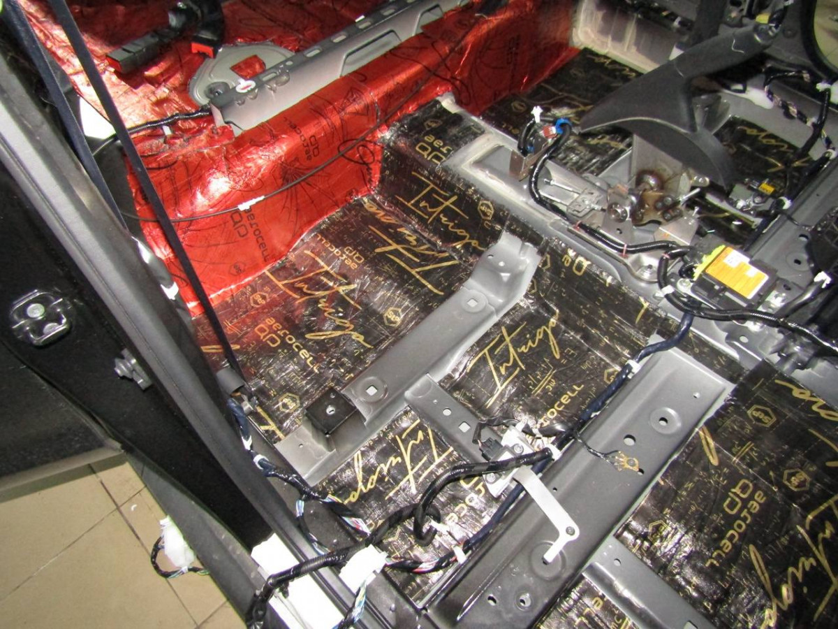 Для обработки днища требуется полный демонтаж салона: специалисты выносят сиденья, снимают обшивку пола. После этого поверхности промываются, очищаются от следов ржавчины и жира. Установка шумоизоляции на днище защищает от проникновения не только шумов, но и холода. Ее основой становится вибродемпфер STP Aerocell Intrigo. Для дополнительной защиты от звуковых волн используется STP Noise Block 2 мм. Такое сочетание избавляет от шуршания шин, звуков выхлопной системы, шума дороги.