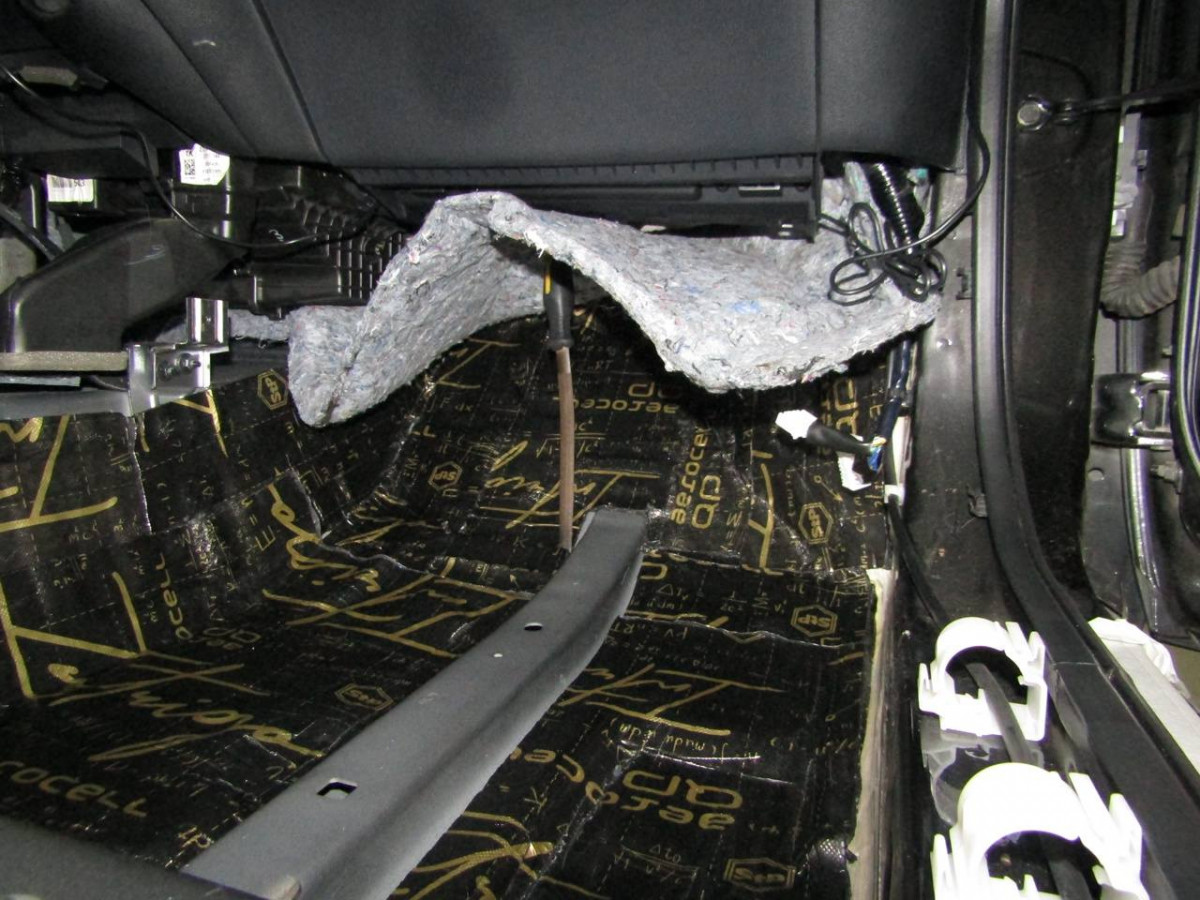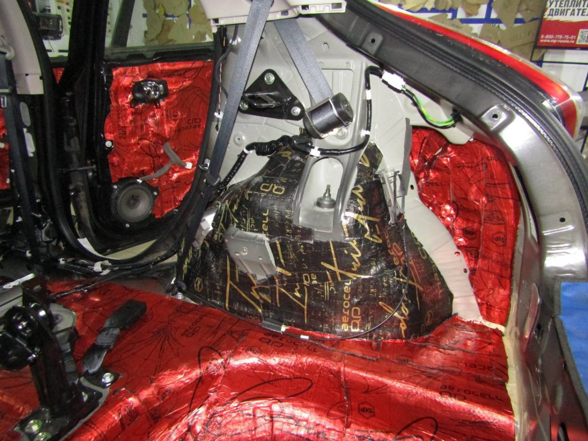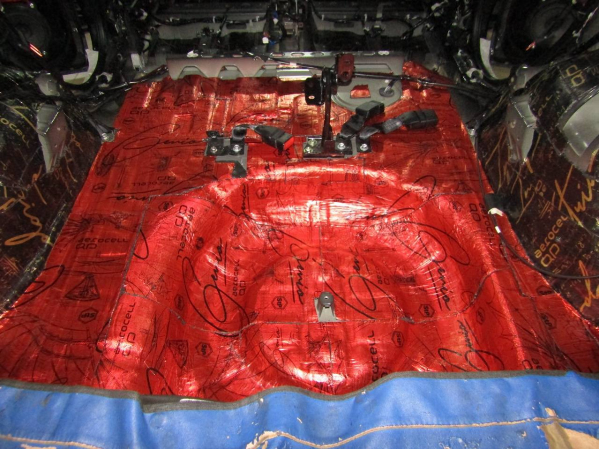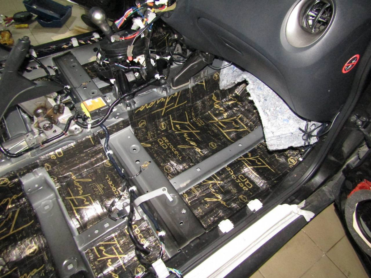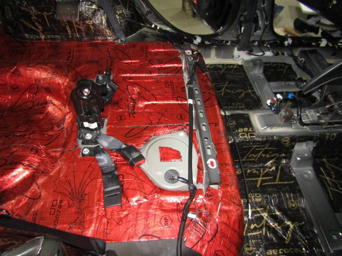 Для обработки днища требуется полный демонтаж салона: специалисты выносят сиденья, снимают обшивку пола. После этого поверхности промываются, очищаются от следов ржавчины и жира. Установка шумоизоляции на днище защищает от проникновения не только шумов, но и холода. Ее основой становится вибродемпфер STP Aerocell Intrigo. Для дополнительной защиты от звуковых волн используется STP Noise Block 2 мм. Такое сочетание избавляет от шуршания шин, звуков выхлопной системы, шума дороги.