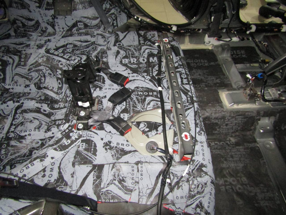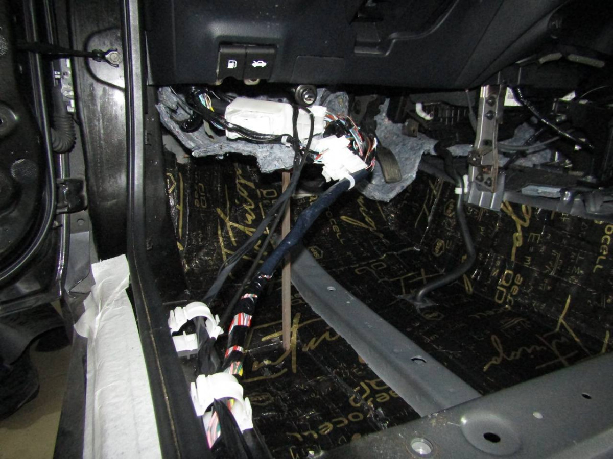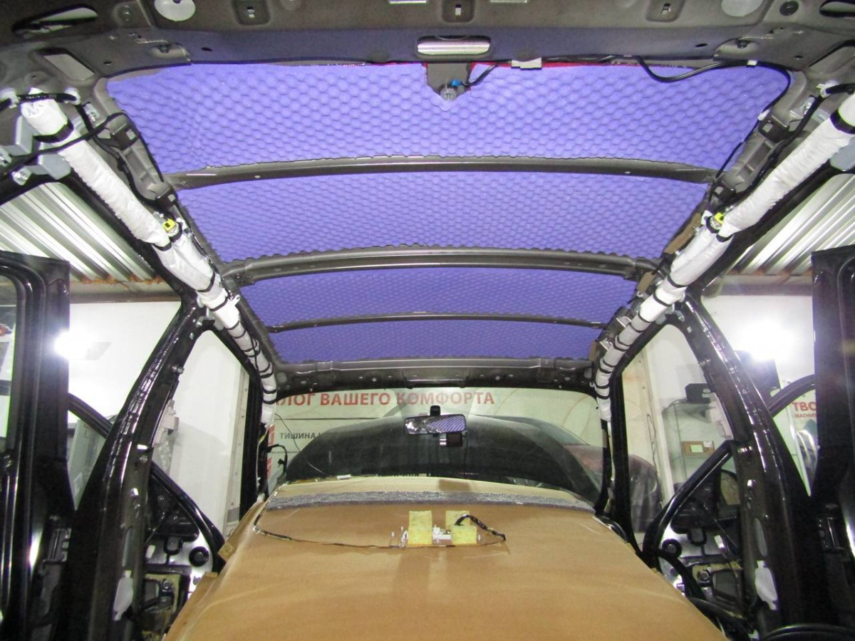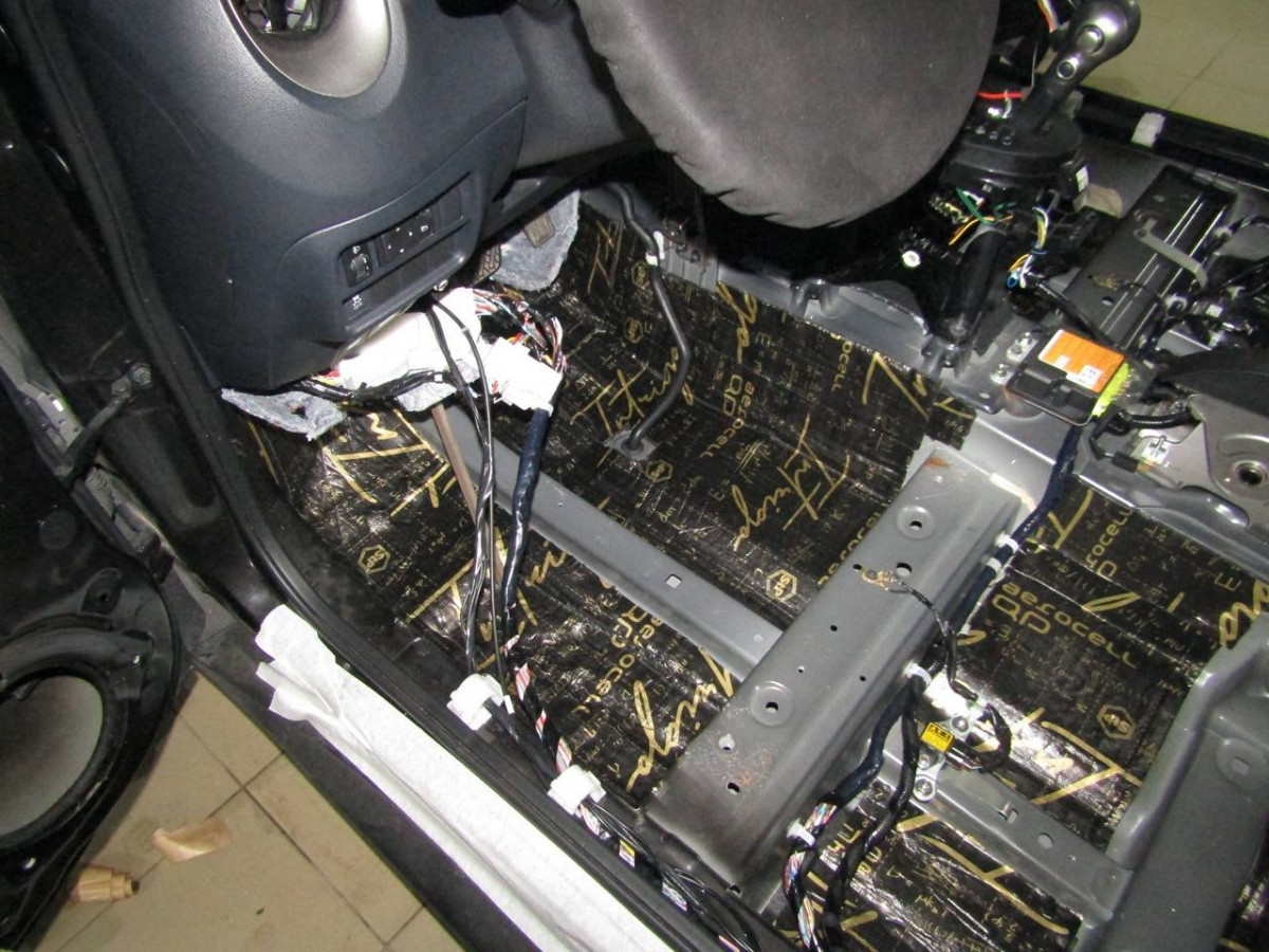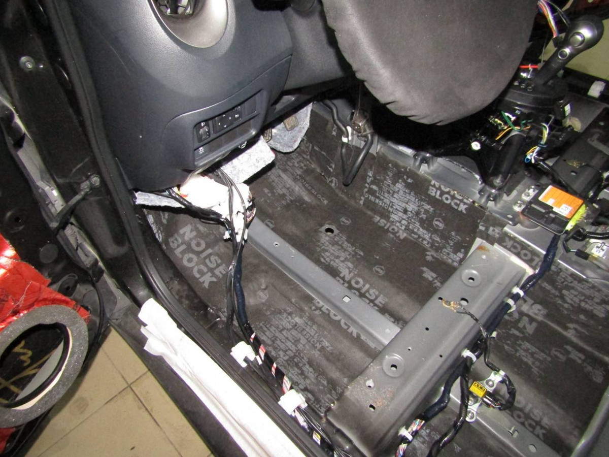 Для обработки днища требуется полный демонтаж салона: специалисты выносят сиденья, снимают обшивку пола. После этого поверхности промываются, очищаются от следов ржавчины и жира. Установка шумоизоляции на днище защищает от проникновения не только шумов, но и холода. Ее основой становится вибродемпфер STP Aerocell Intrigo. Для дополнительной защиты от звуковых волн используется STP Noise Block 2 мм. Такое сочетание избавляет от шуршания шин, звуков выхлопной системы, шума дороги.