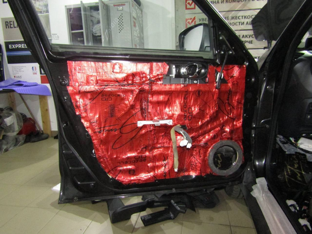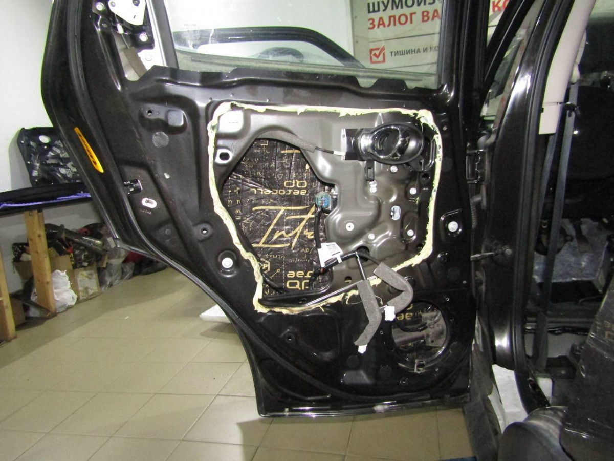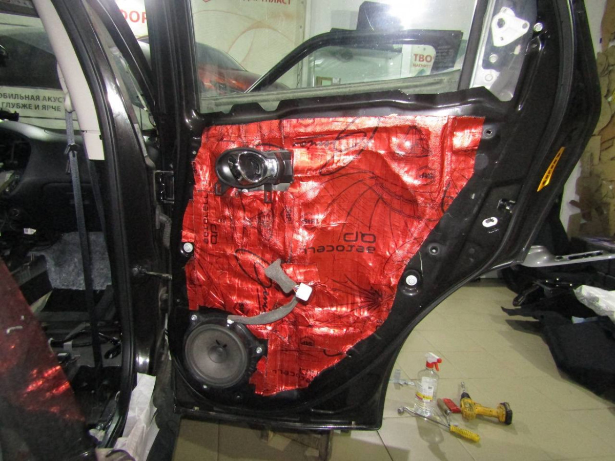 Двери кроссовера необходимо шумоизолировать для устранения колебаний и резонанса, защиты от уличных звуков. На металл устанавливается STP Aerocell Intrigo. Он становится основой для следующих слоев STP Aerocell Genio на закрытие технологических отверстий, STP Silver и Biplast Premium на обшивку двери. Эти материалы устраняют звуки разной громкости и частоты, в том числе неприятные скрипы и стуки.
