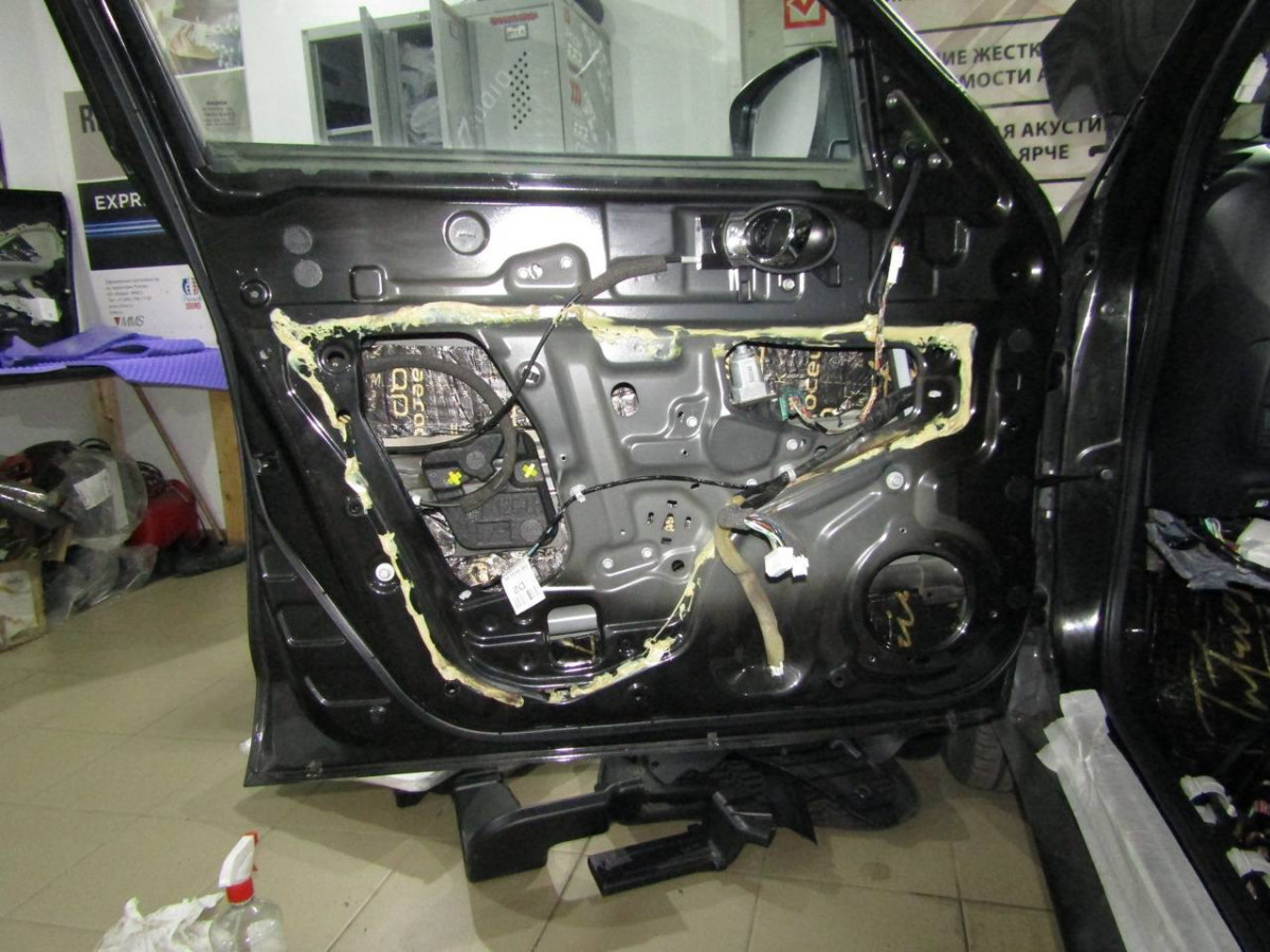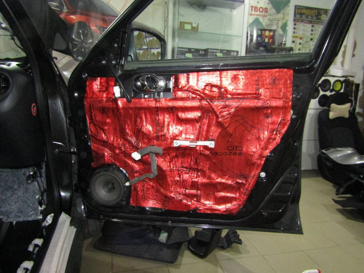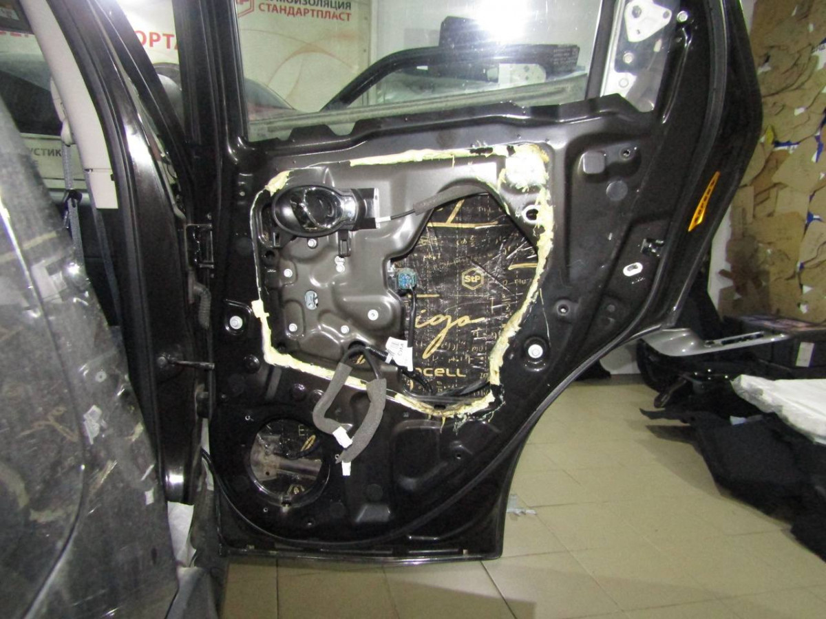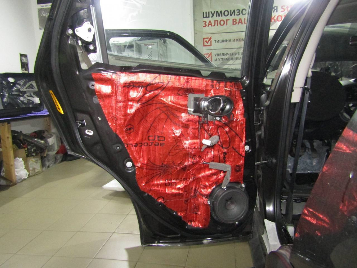 Двери кроссовера необходимо шумоизолировать для устранения колебаний и резонанса, защиты от уличных звуков. На металл устанавливается STP Aerocell Intrigo. Он становится основой для следующих слоев STP Aerocell Genio на закрытие технологических отверстий, STP Silver и Biplast Premium на обшивку двери. Эти материалы устраняют звуки разной громкости и частоты, в том числе неприятные скрипы и стуки.