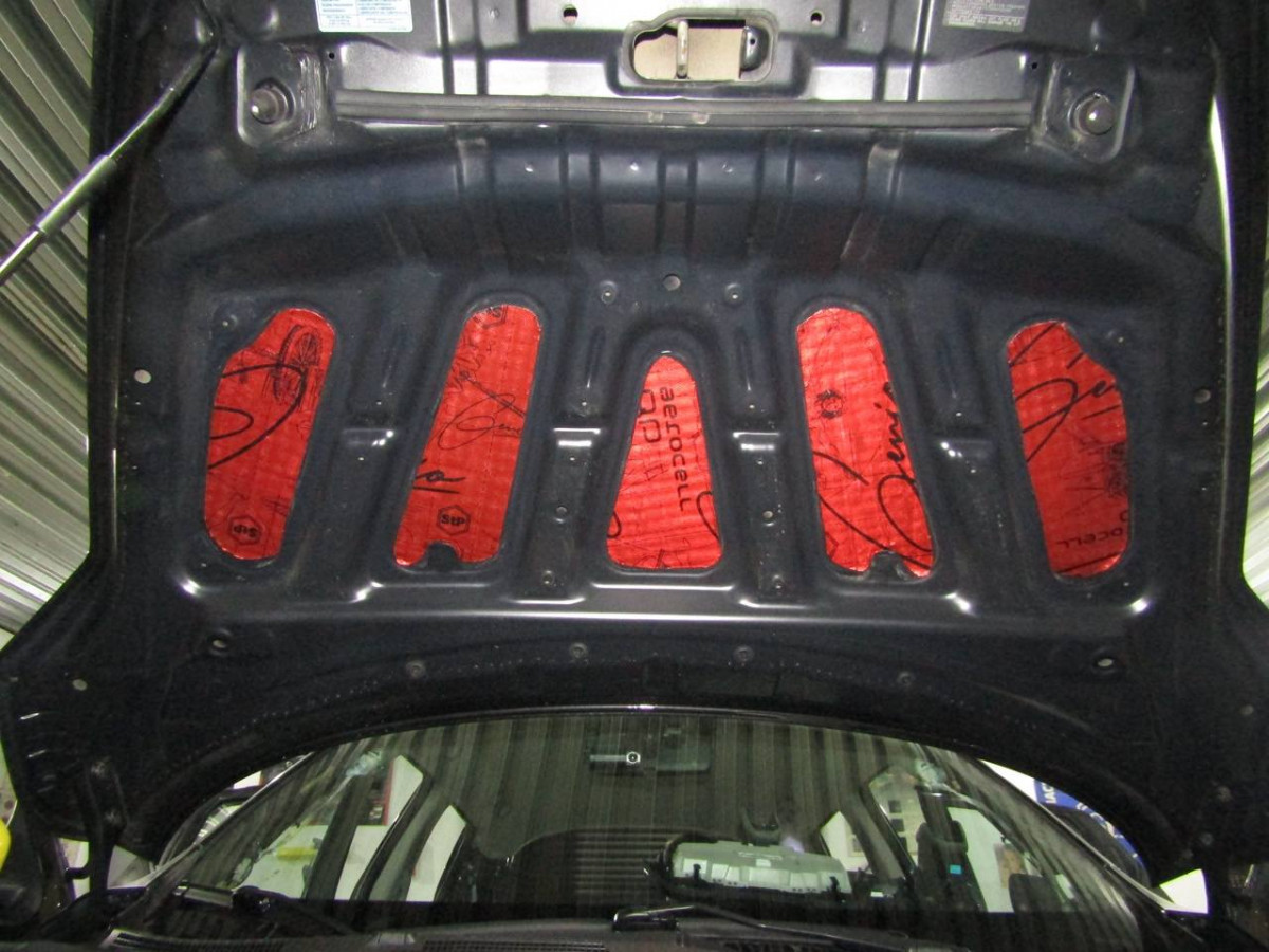 Крышка капота подвержена сильным вибрациям, что приводит к появлению громкого гула в салоне. Установка соответствующих материалов на данный участок помогает избавиться от такой проблемы. Ровные участки между ребрами жесткости очищают от пыли и грязи, обезжиривают.