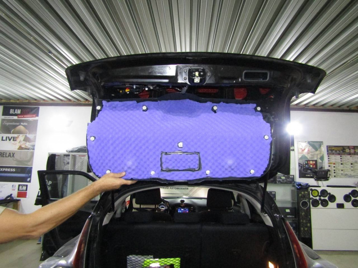 Багажник у Nissan Juke имеет средний объем, несмотря на это, из него в салон проникает большое количество всевозможных звуков. Для шумоизоляции этой области используется сразу 4 вида материалов. На днище устанавливается высокоэффективный вибродемпфер STP Aerocell Genio. Он гасит сильные вибрации, защищает металл от воздействия влаги, прочно фиксируется на поверхностях.