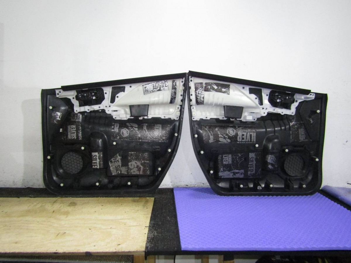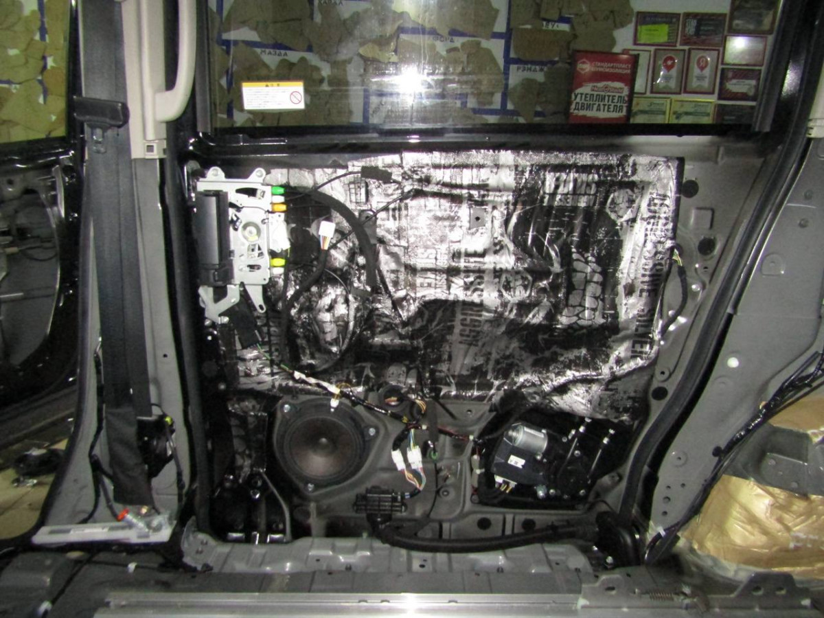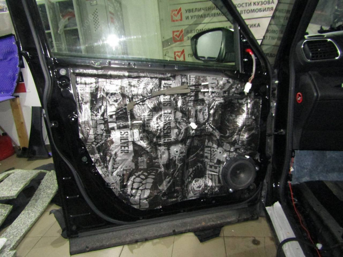 Металл дверей пропускает лишние звуки и вибрирует. Со временем крепления пластиковой накладки расшатываются, создавая дополнительные скрипы. Шумоизоляция избавляет от этих проблем. После разборки двери и подготовки поверхностей устанавливается STP Aero. Поверх укладывается звукопоглотитель Акцент Premium. На неровных участках закрепляется STP Silver. Дверная обшивка также шумоизолируется. Для этого используются Biplast Premium и STP Silver.