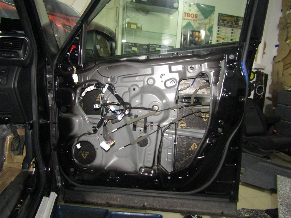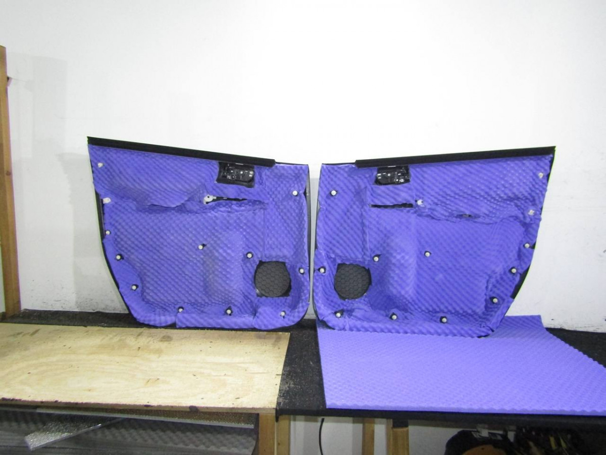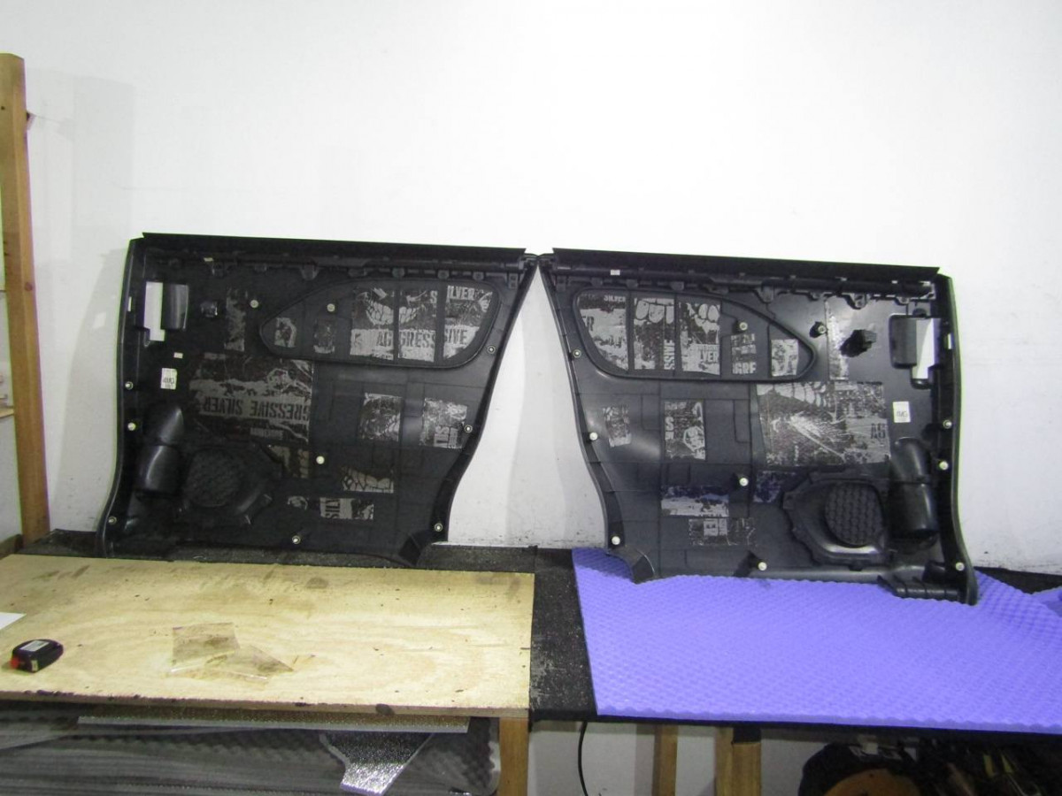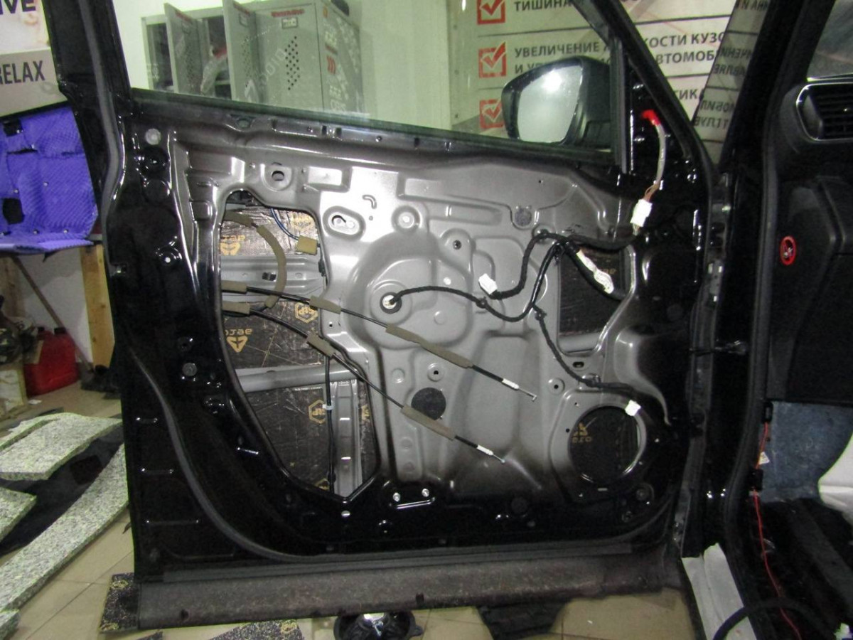 Металл дверей пропускает лишние звуки и вибрирует. Со временем крепления пластиковой накладки расшатываются, создавая дополнительные скрипы. Шумоизоляция избавляет от этих проблем. После разборки двери и подготовки поверхностей устанавливается STP Aero. Поверх укладывается звукопоглотитель Акцент Premium. На неровных участках закрепляется STP Silver. Дверная обшивка также шумоизолируется. Для этого используются Biplast Premium и STP Silver.