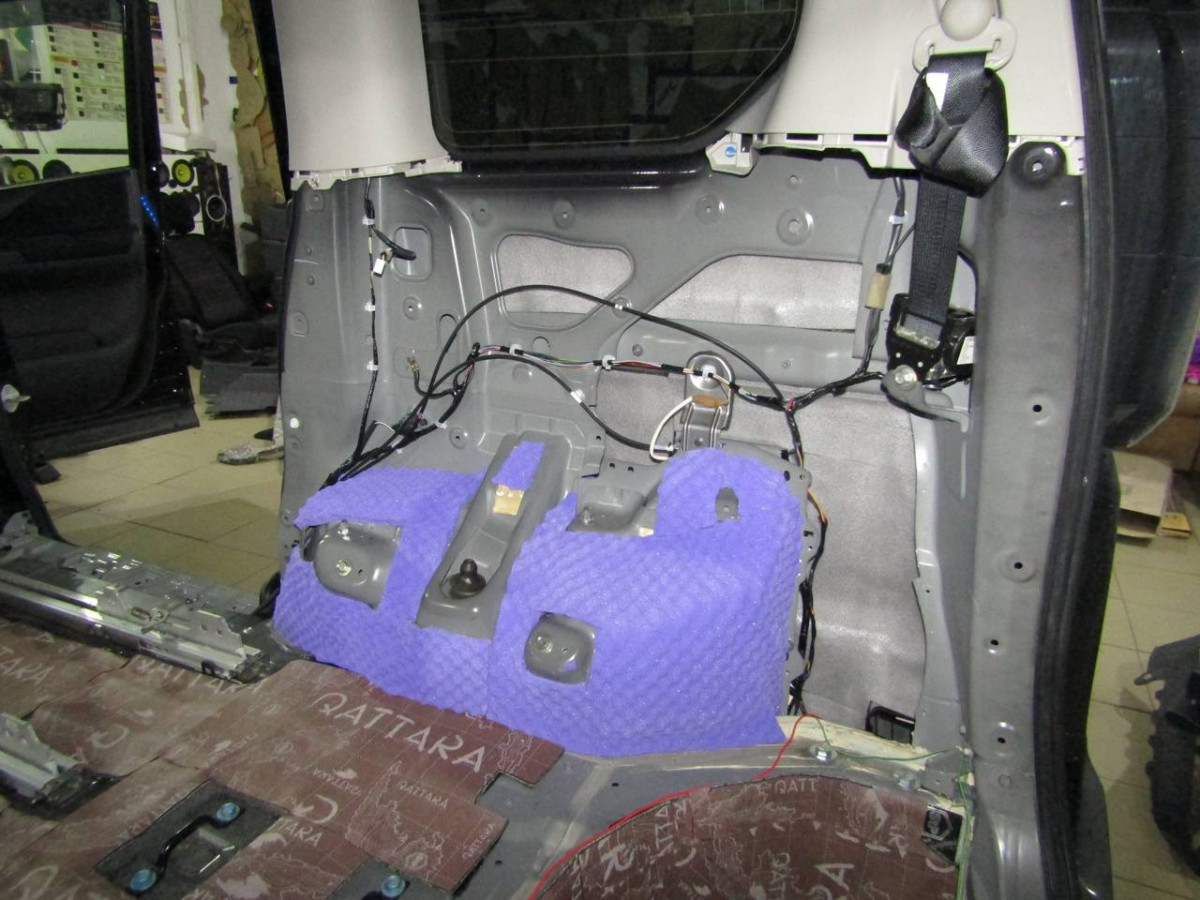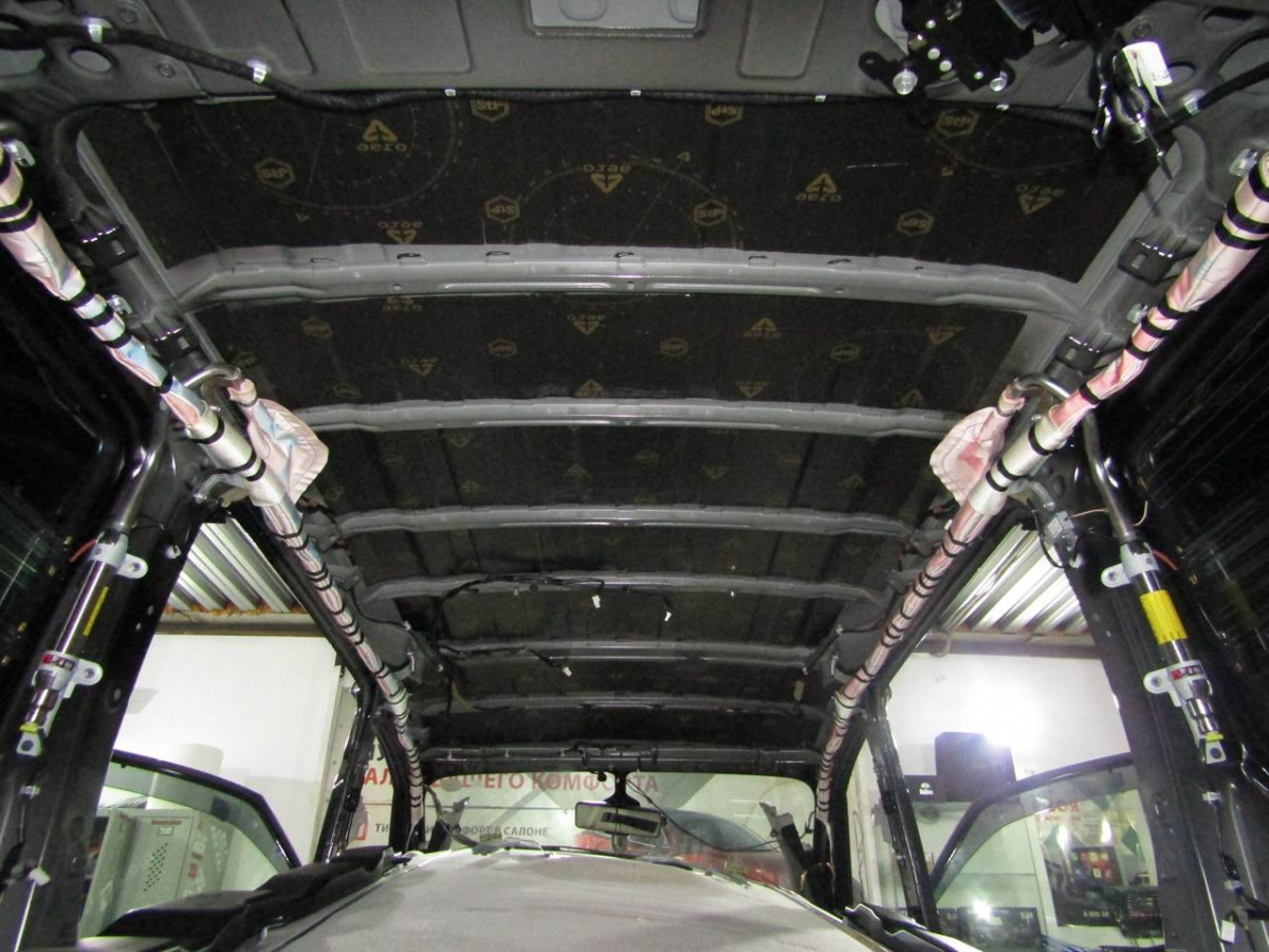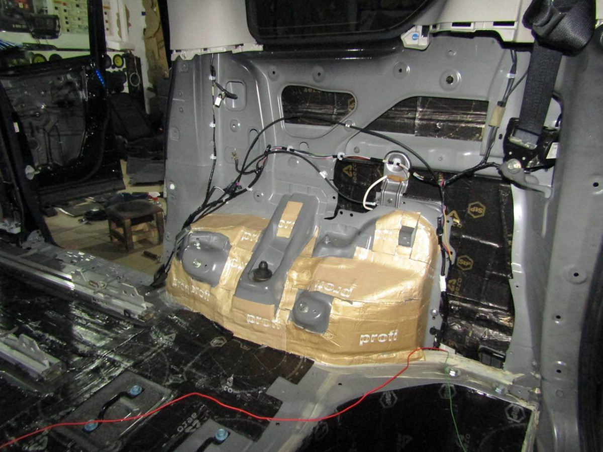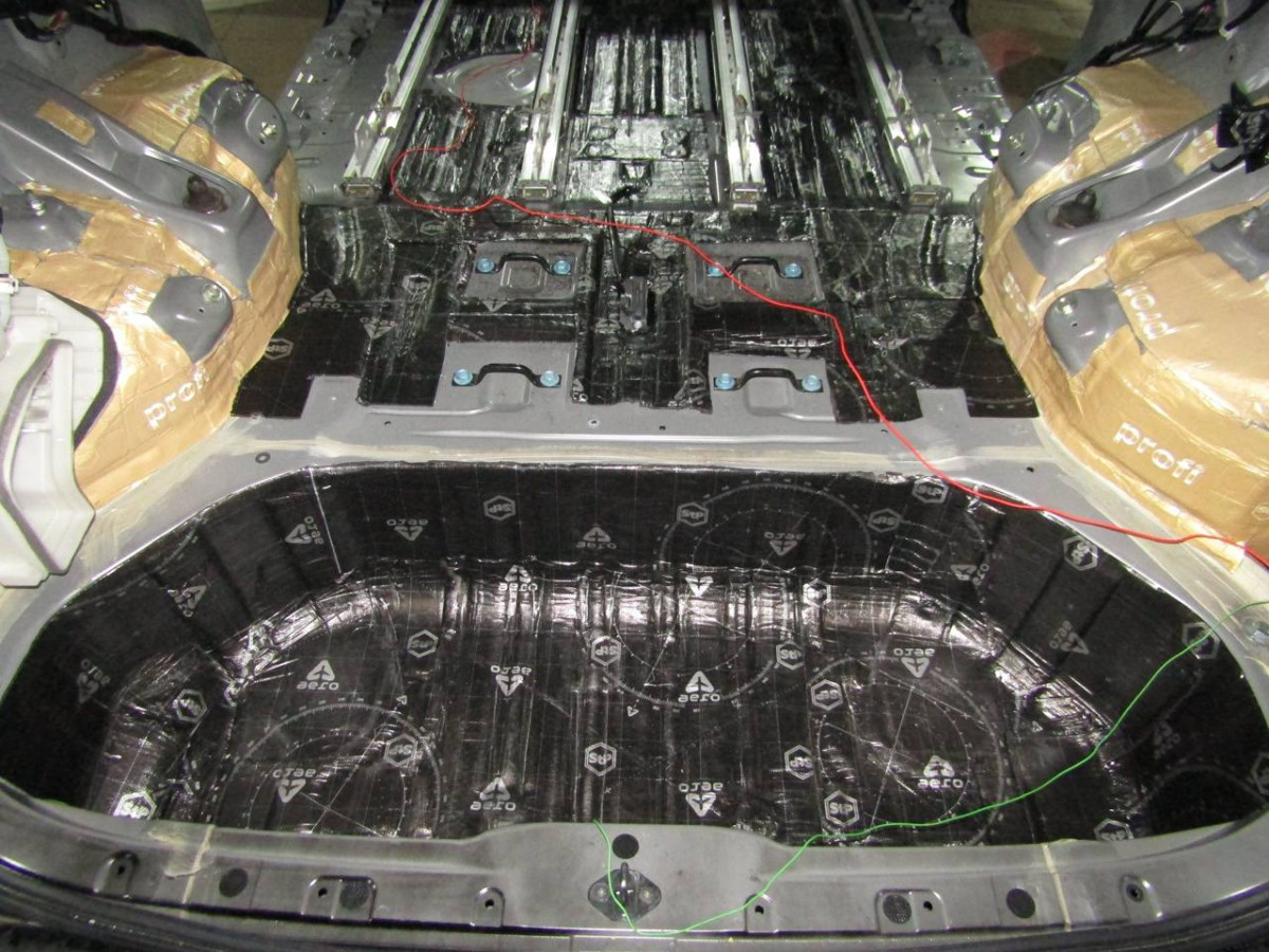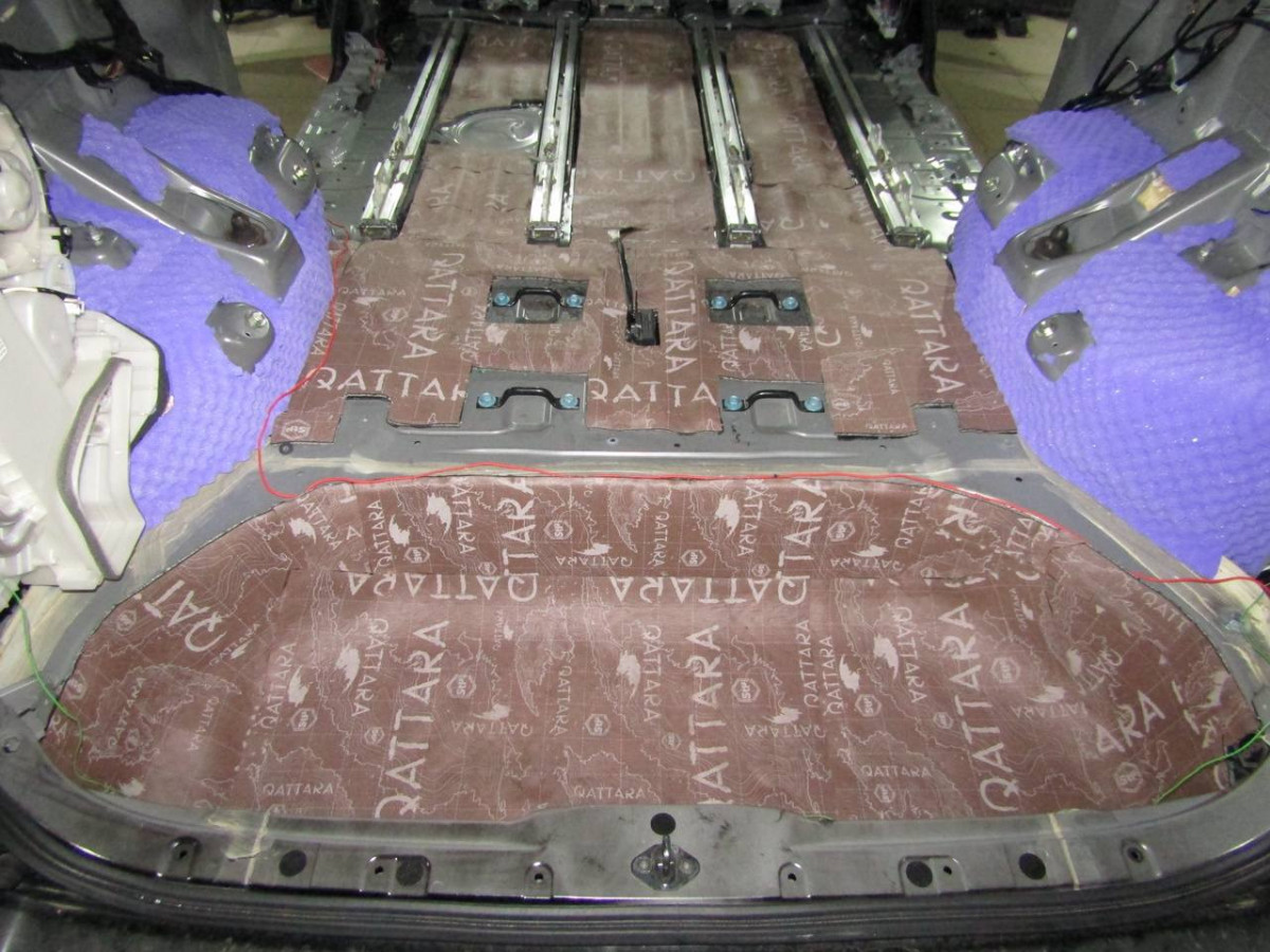Первый слой шумоизоляции делается из STP Profi Plus. Он предназначен специально для обработки участков, подверженных сильным вибрациям. Материал эффективно гасит колебания за счет увеличенной плотности. Под задние сиденья устанавливается антивибрационный материал STP Aero +. Для поглощения звуковых волн используется STP Qattara.