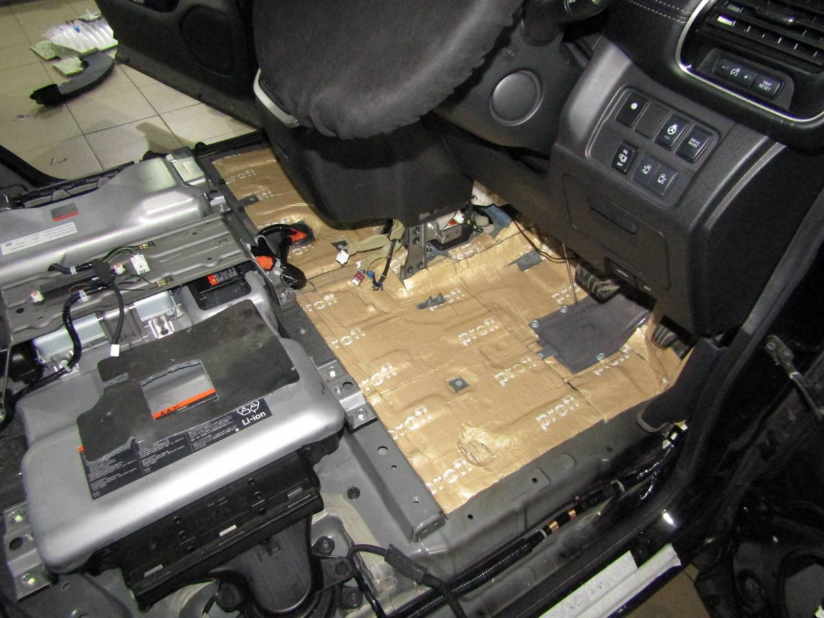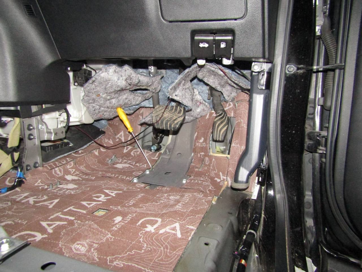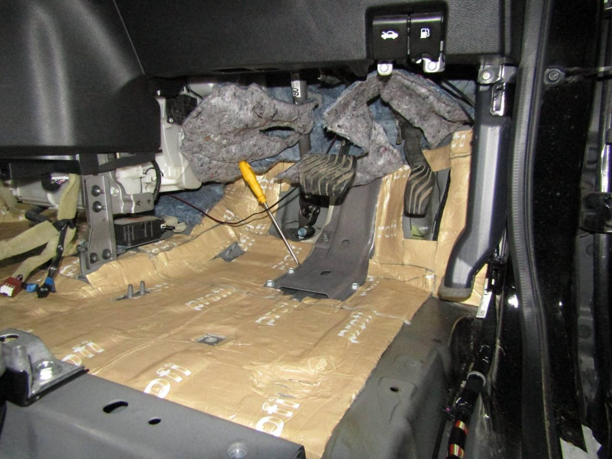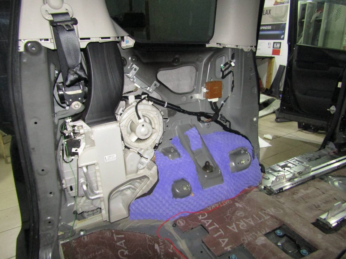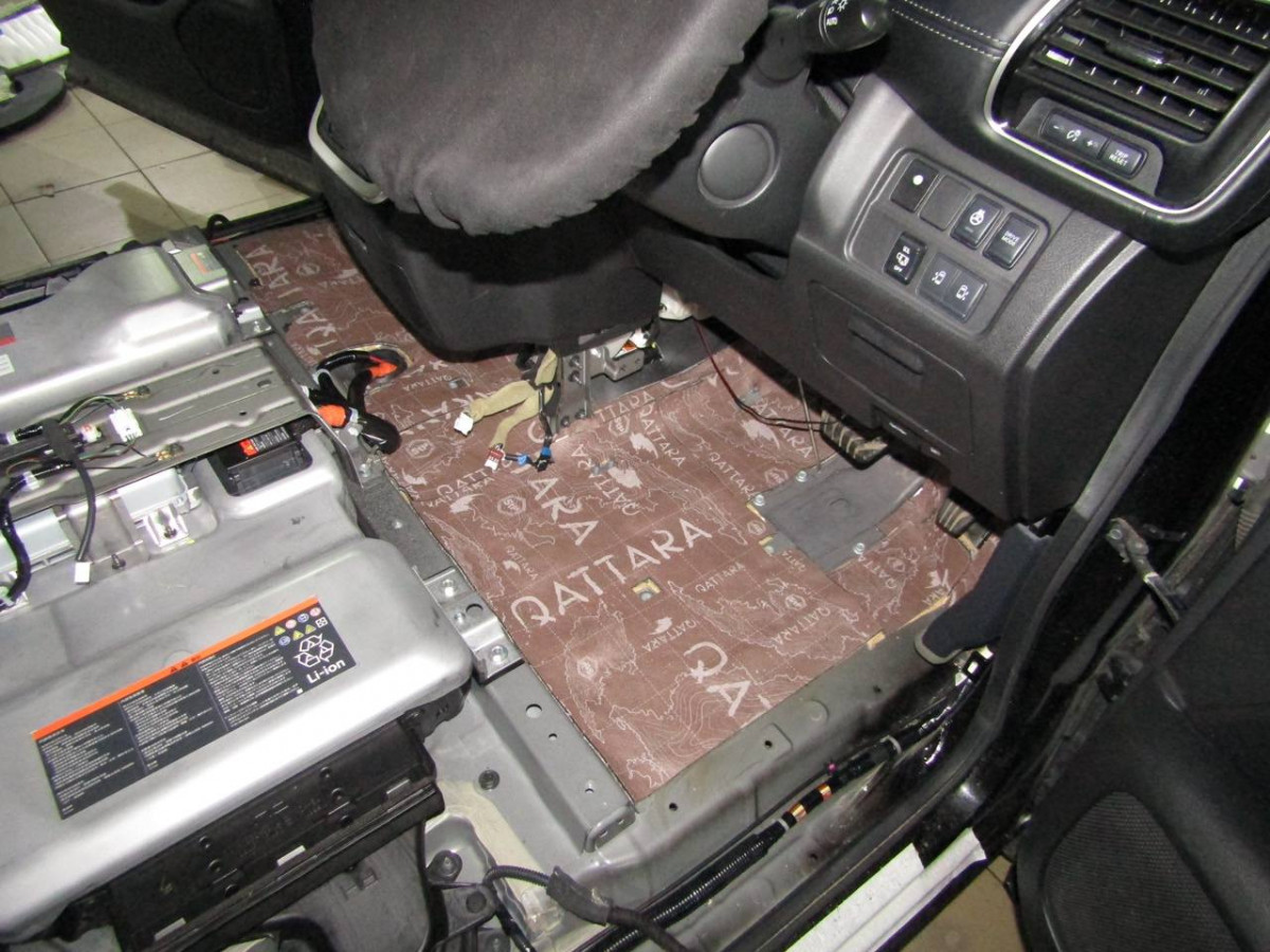 Первый слой шумоизоляции делается из STP Profi Plus. Он предназначен специально для обработки участков, подверженных сильным вибрациям. Материал эффективно гасит колебания за счет увеличенной плотности. Под задние сиденья устанавливается антивибрационный материал STP Aero +. Для поглощения звуковых волн используется STP Qattara.