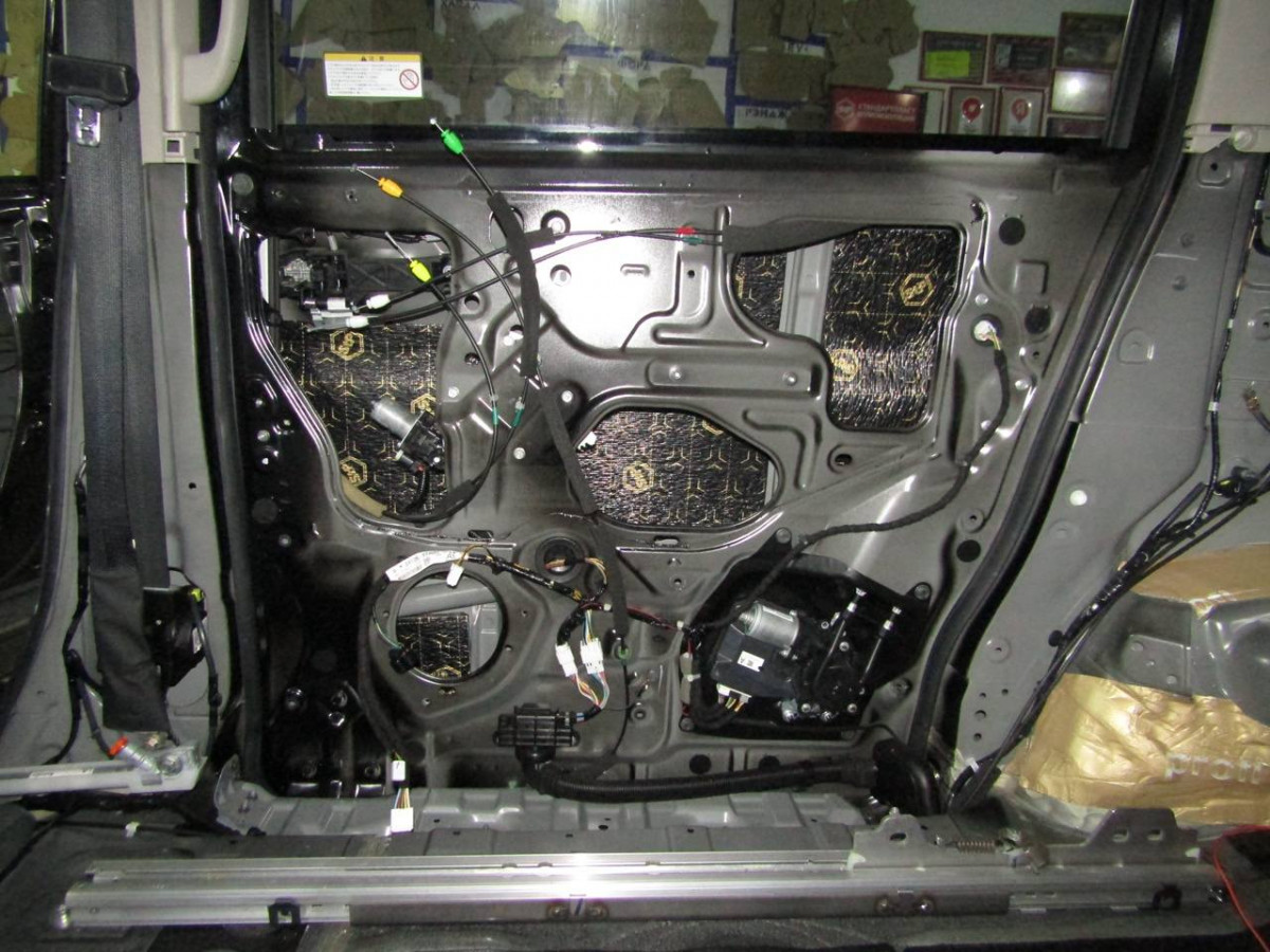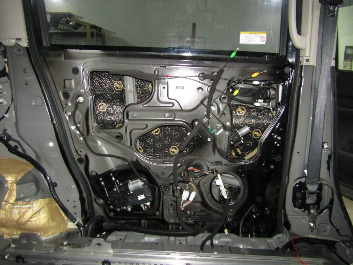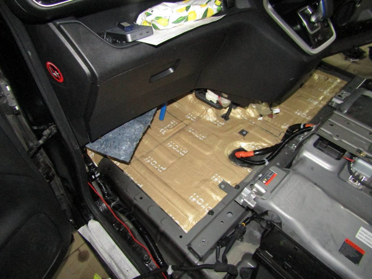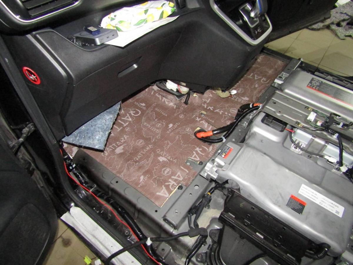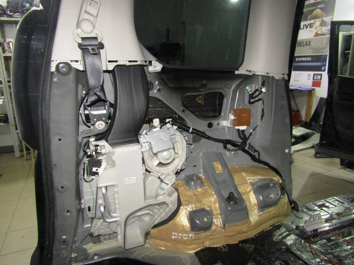 Первый слой шумоизоляции делается из STP Profi Plus. Он предназначен специально для обработки участков, подверженных сильным вибрациям. Материал эффективно гасит колебания за счет увеличенной плотности. Под задние сиденья устанавливается антивибрационный материал STP Aero +. Для поглощения звуковых волн используется STP Qattara.