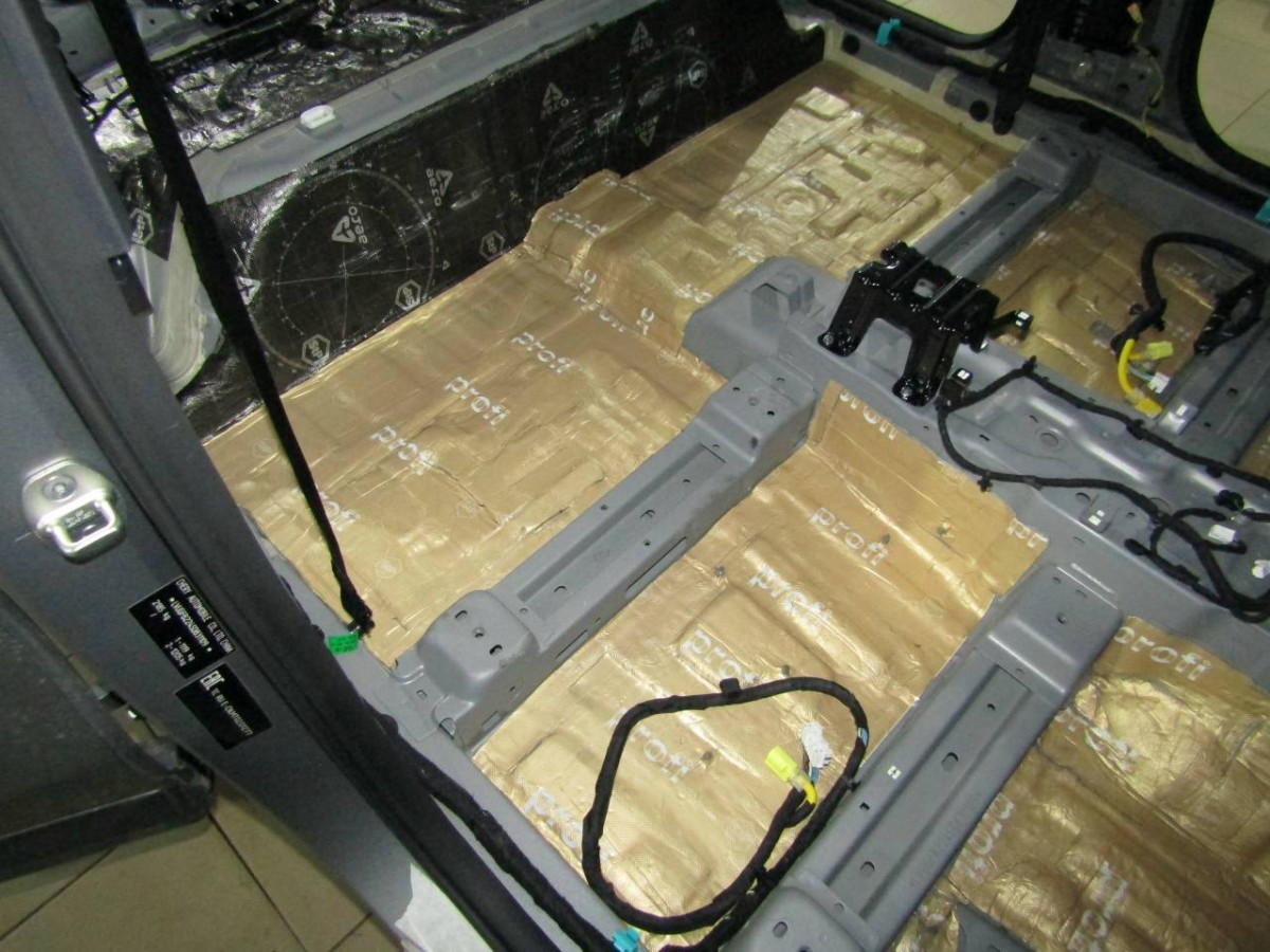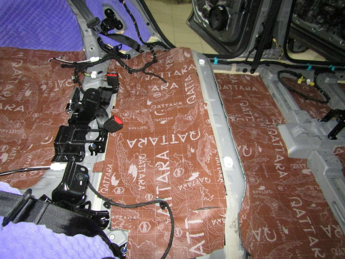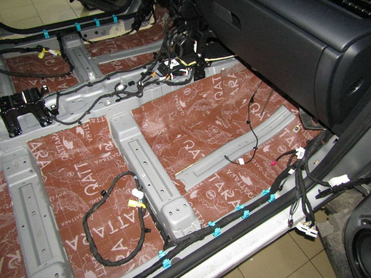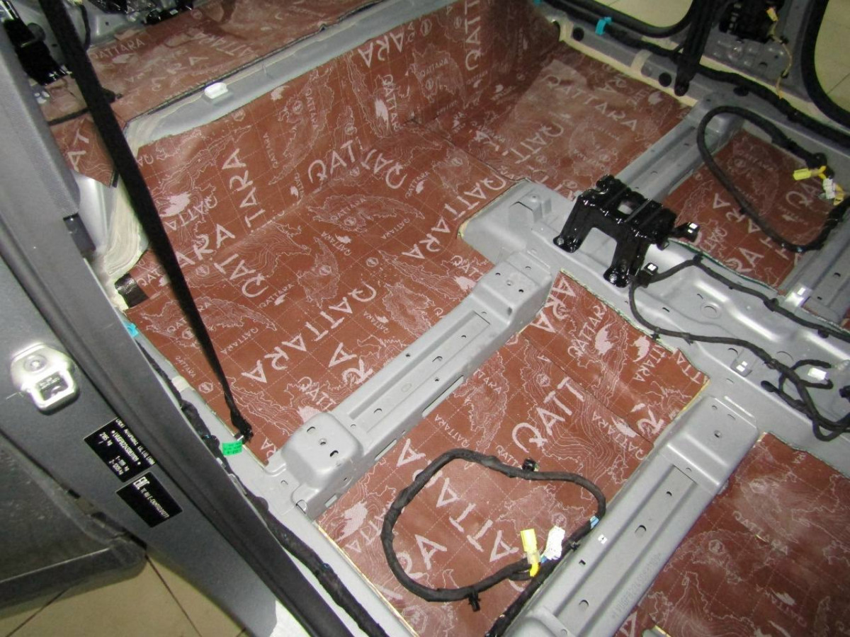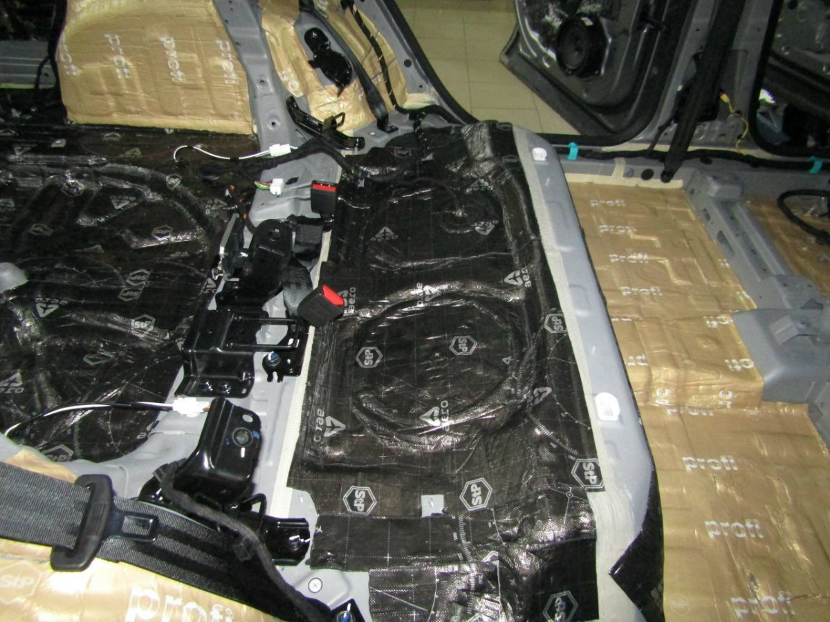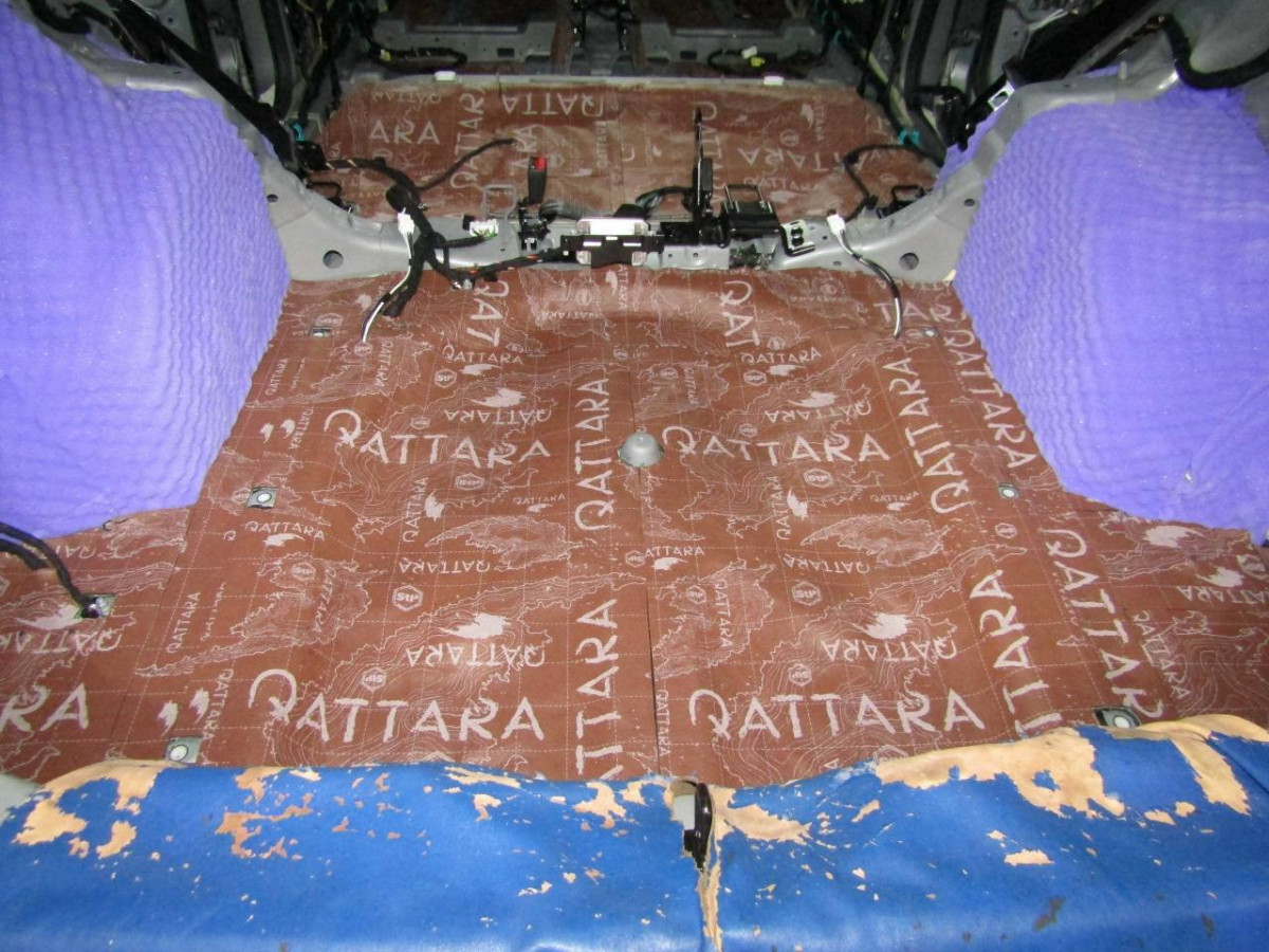Первый слой шумоизоляции делают из STP ProFi Plus, считающегося одним из самых эффективных вибродемпферов. Материал сохраняет свойства даже при повышенной влажности и низких температурах. Для формирования второго слоя используется STP Qattara, сочетающие в себе свойства звукоизолятора и звукопоглотителя.