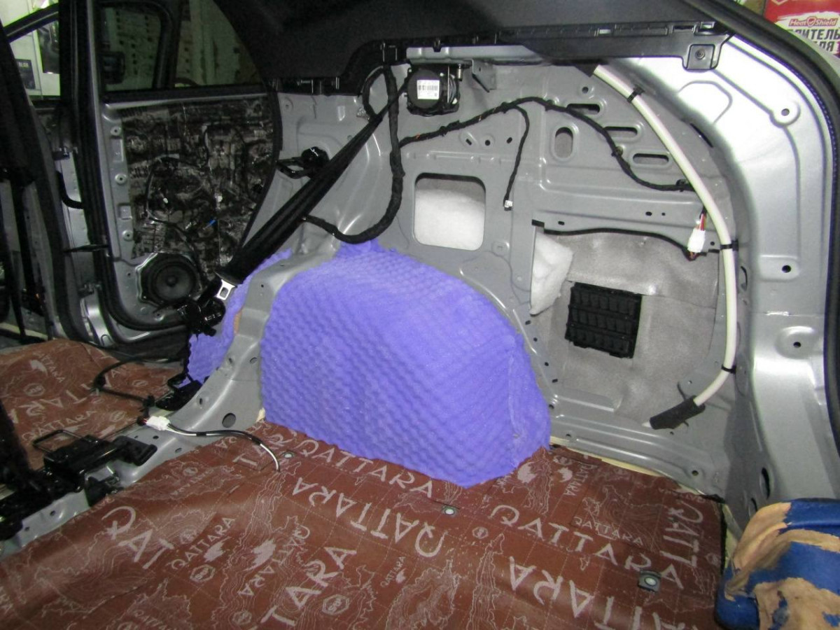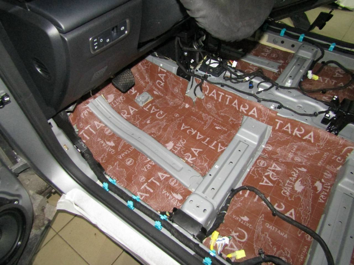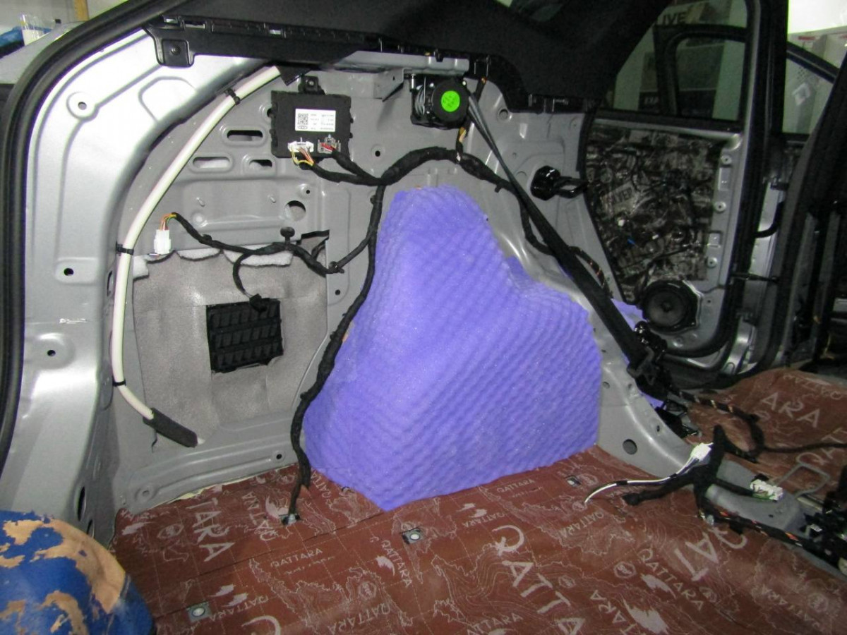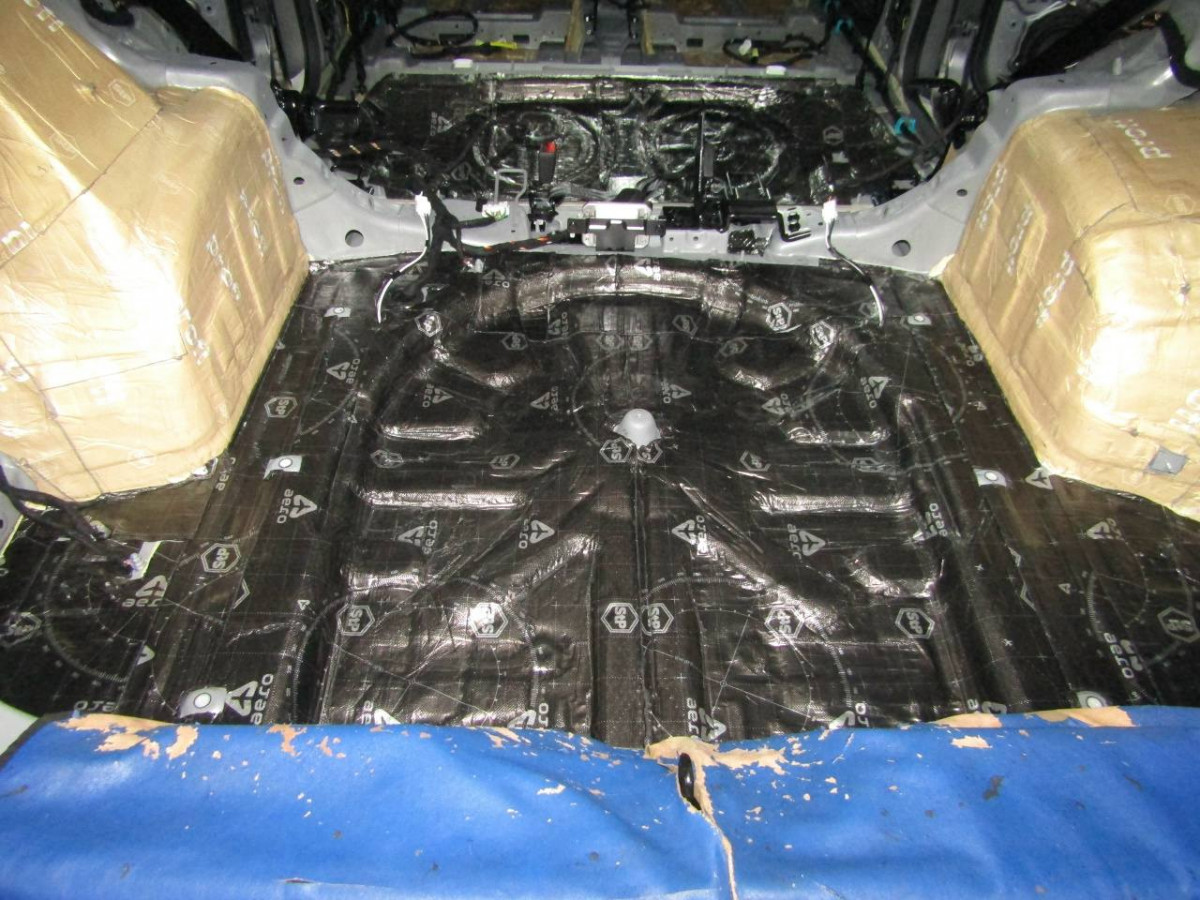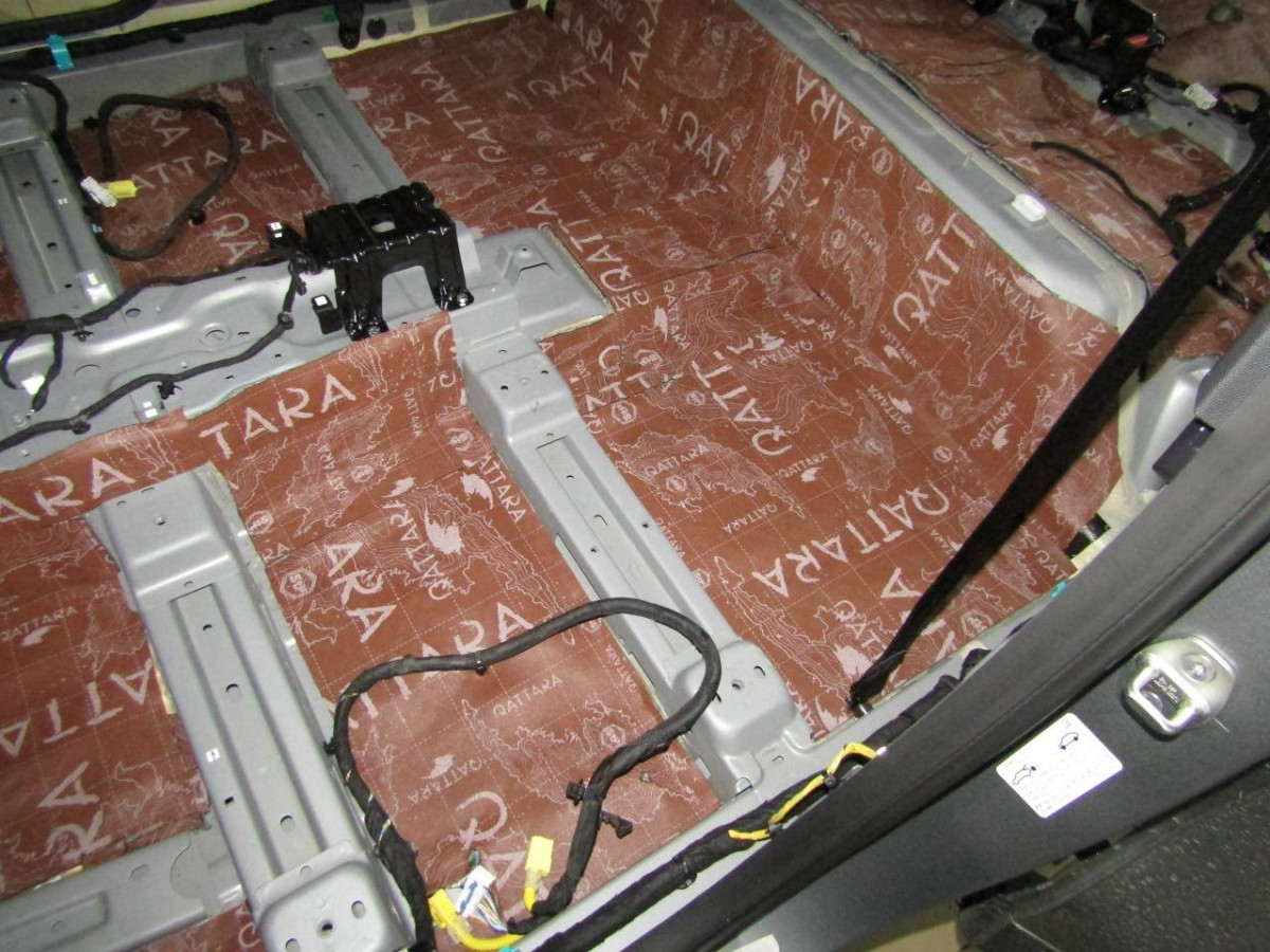 Первый слой шумоизоляции делают из STP ProFi Plus, считающегося одним из самых эффективных вибродемпферов. Материал сохраняет свойства даже при повышенной влажности и низких температурах. Для формирования второго слоя используется STP Qattara, сочетающие в себе свойства звукоизолятора и звукопоглотителя.