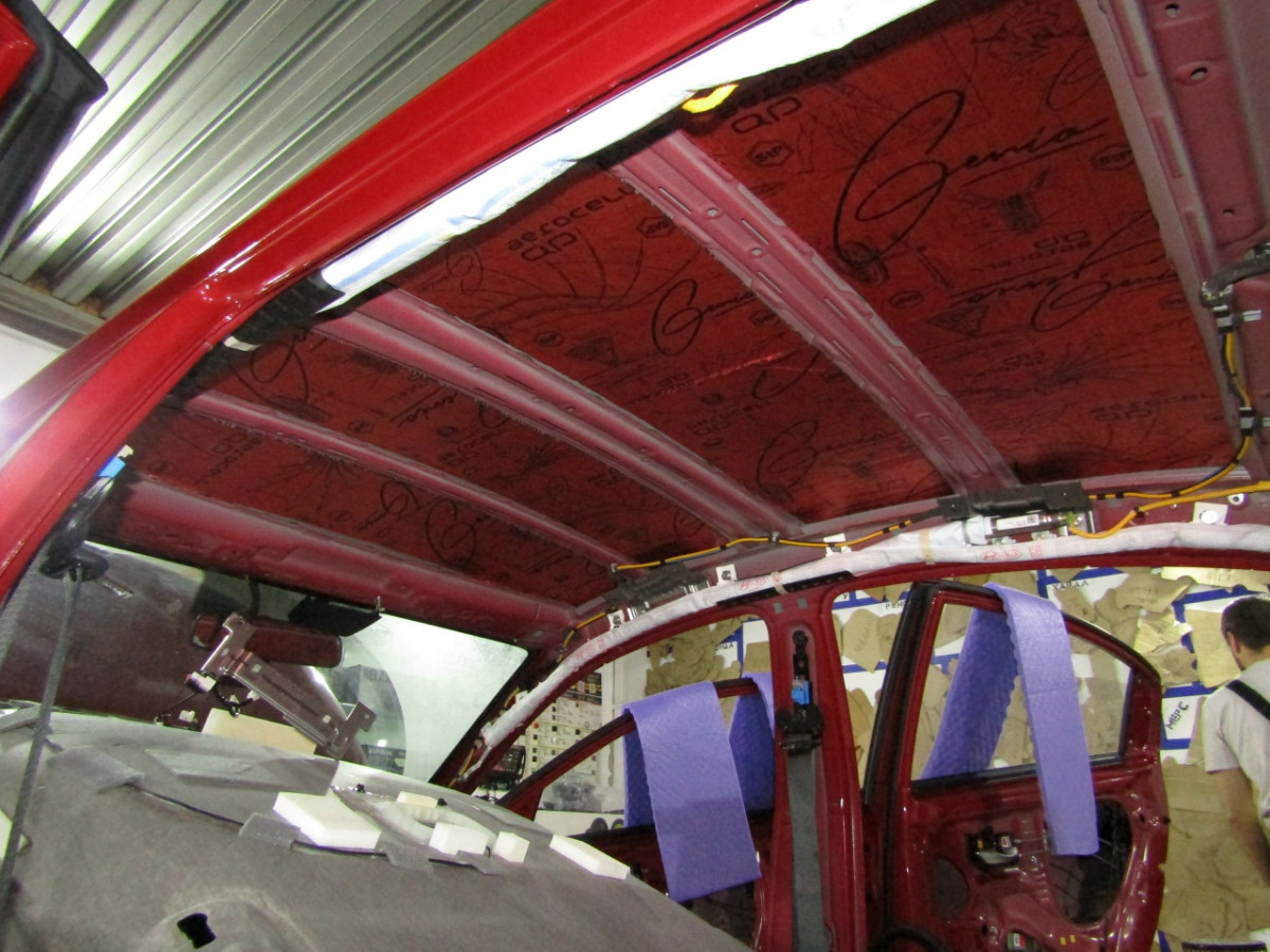 После демонтажа потолочной обшивки взгляд специалиста падает на практически пустую металлическую поверхность. Да, здесь есть виброизоляционный слой, однако он тонкий, неравномерный и неэффективный. Поэтому неудивительно, что все внешние звуки, например, шум дождя и града, обрушиваются на головы находящихся в автомобиле людей. Шумоизоляцию крыши нужно полностью переделывать.
