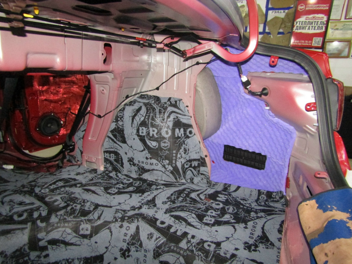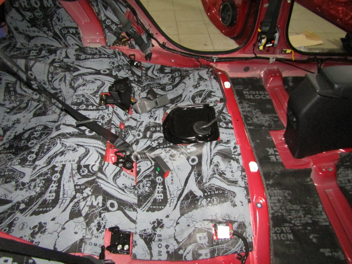Сначала арки тщательно обезжиривают и просушивают. Затем устанавливают материалы, которые будут бороться с вибрациями. Это STP Aerocell Intrigo. STP Bromo наклеивается поверх первого слоя. Он обладает звуко- и теплоизоляционными свойствами, поэтому защищает от проникновения шумов и холода.