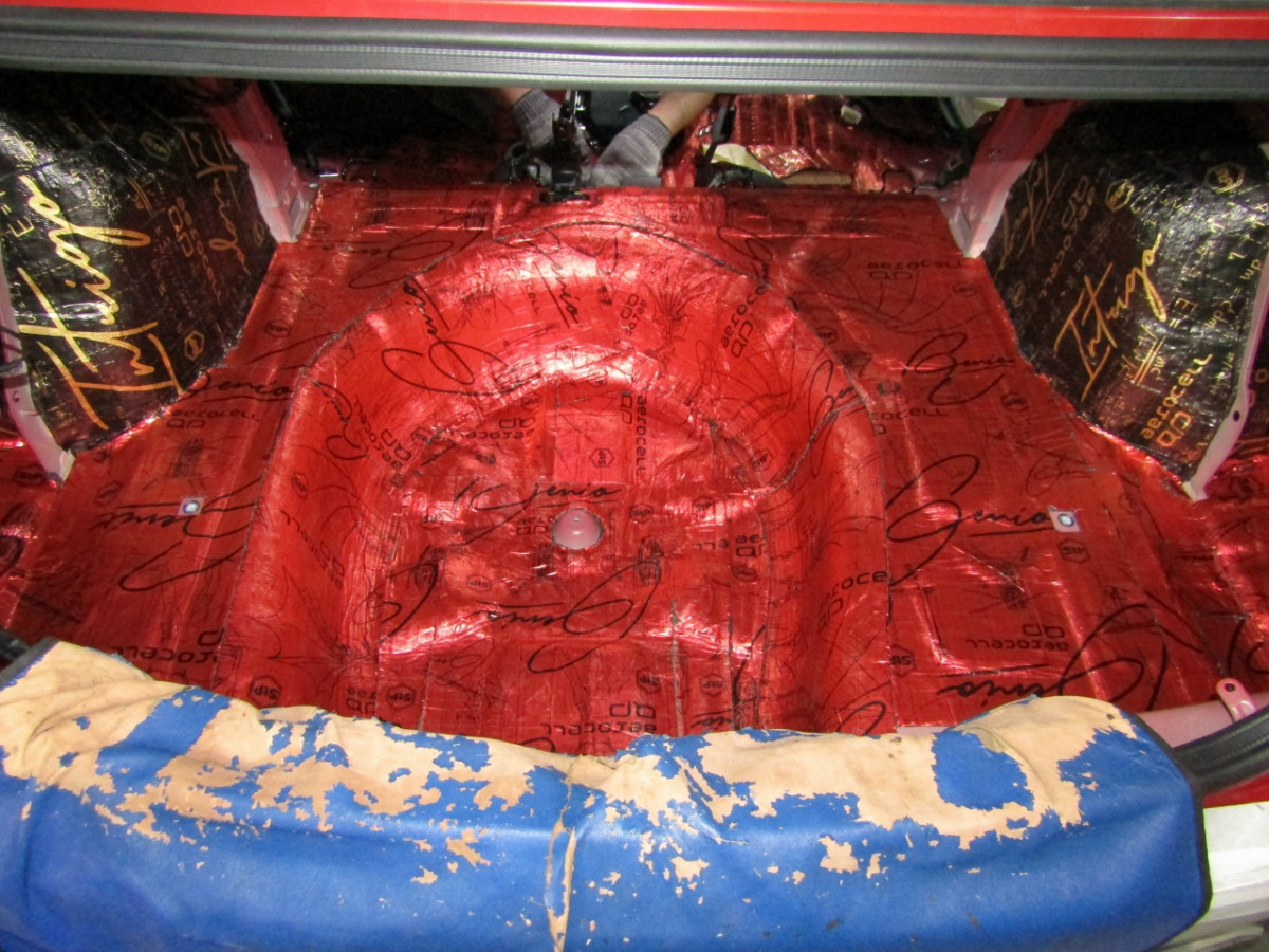 - Виброизоляционный слой. Для оклейки пола используется сразу 2 вибродемпфера – STP Aerocell Intrigo и STP Aerocell Genio. Первый устанавливается под задние сиденья, второй – на оставшиеся части днища.