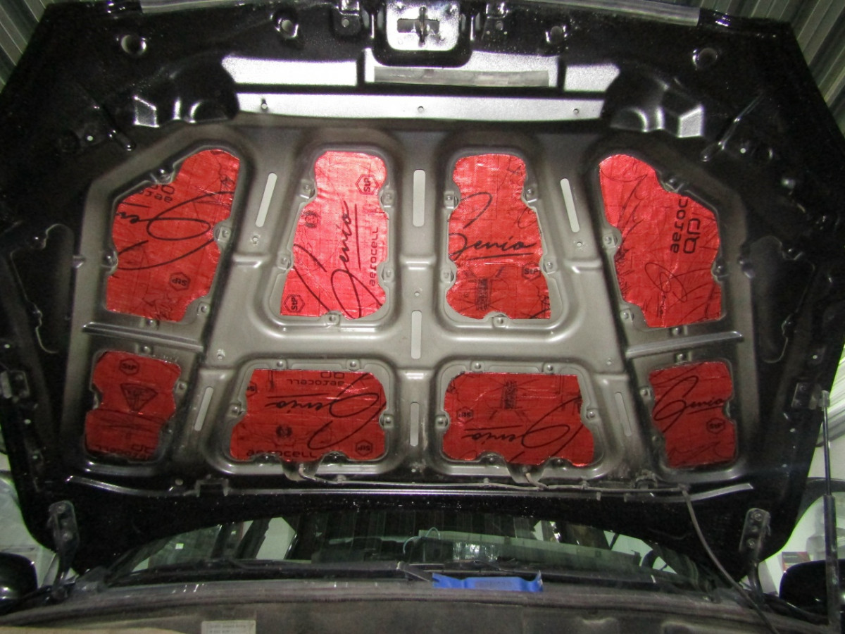 На крышку капота необходимо устанавливать антивибрационные и звукопоглощающие материалы. Из-за сложного рельефа листы необходимо заранее нарезать, после чего уложить между ребрами жесткости. Металл к монтажным работам мастера подготавливают по стандартной схеме. Затем они наносят STP Aerocell Genio. Это легкий материал, который не оказывает лишней нагрузки на конструкцию.