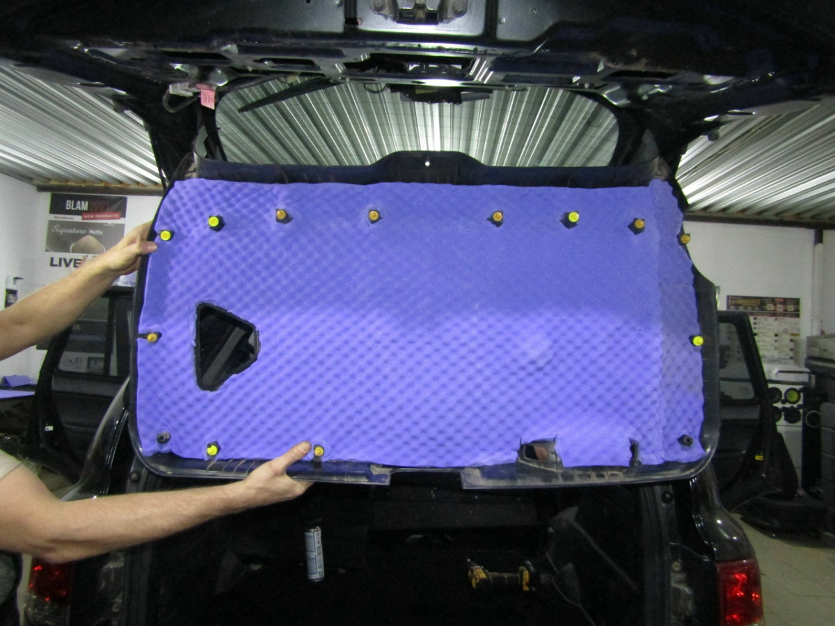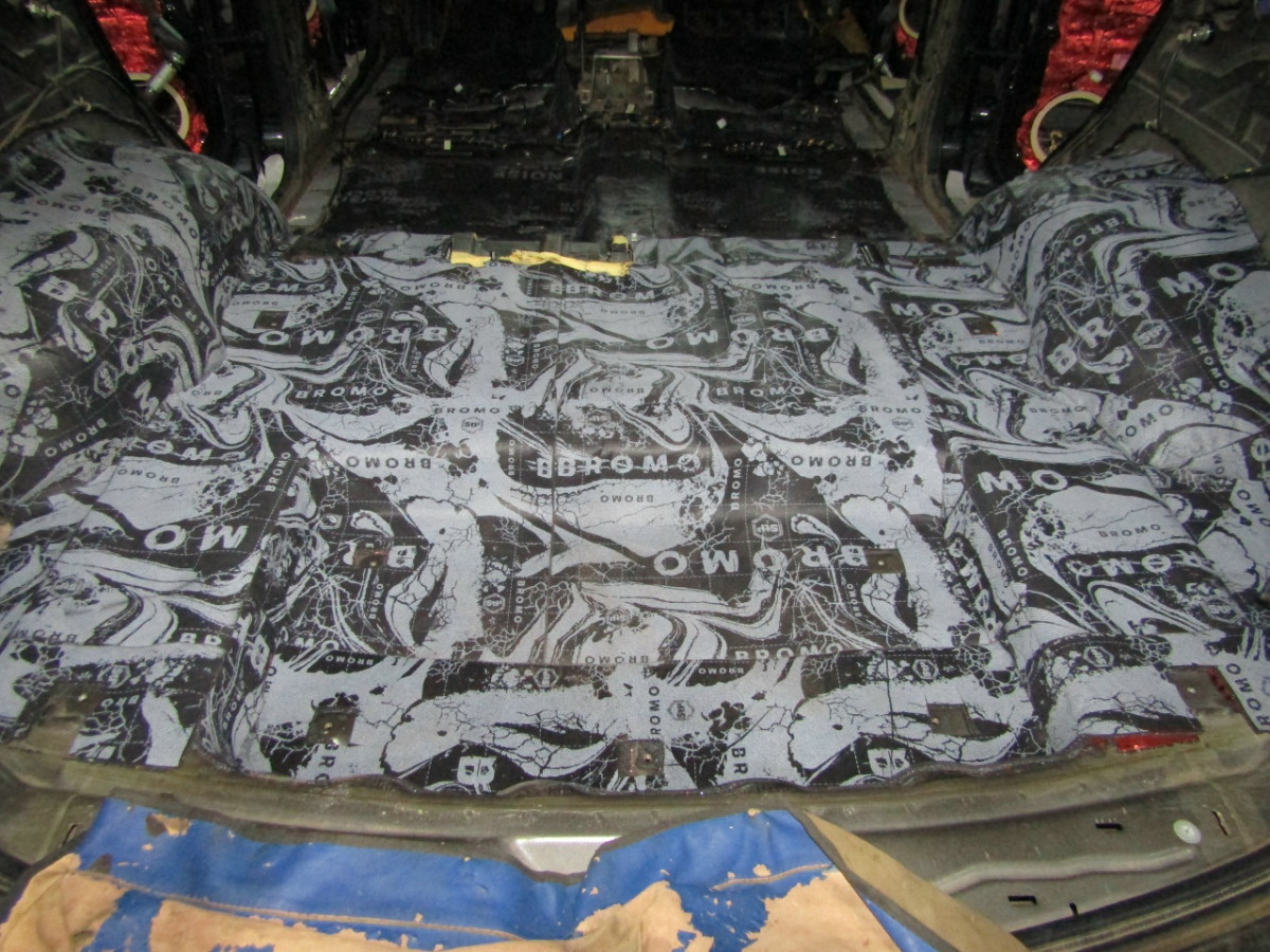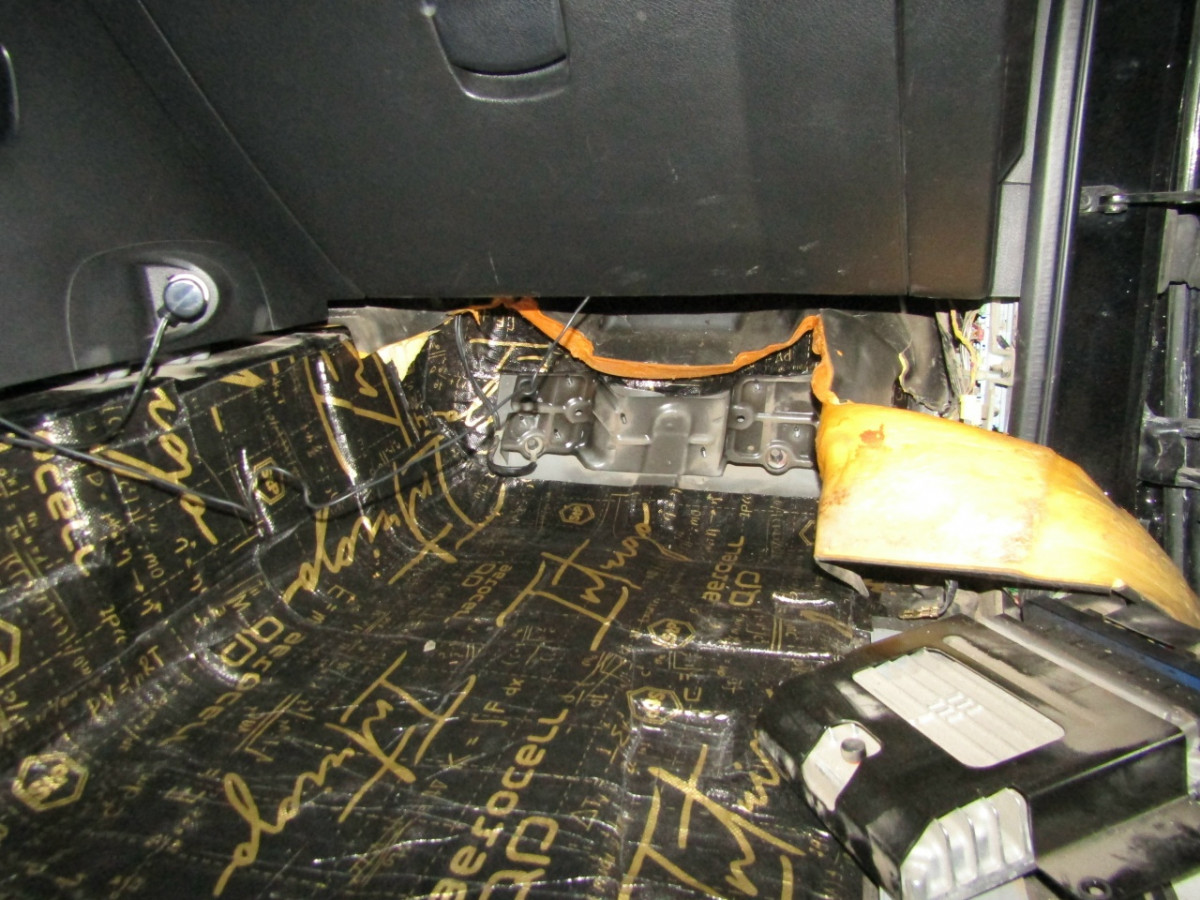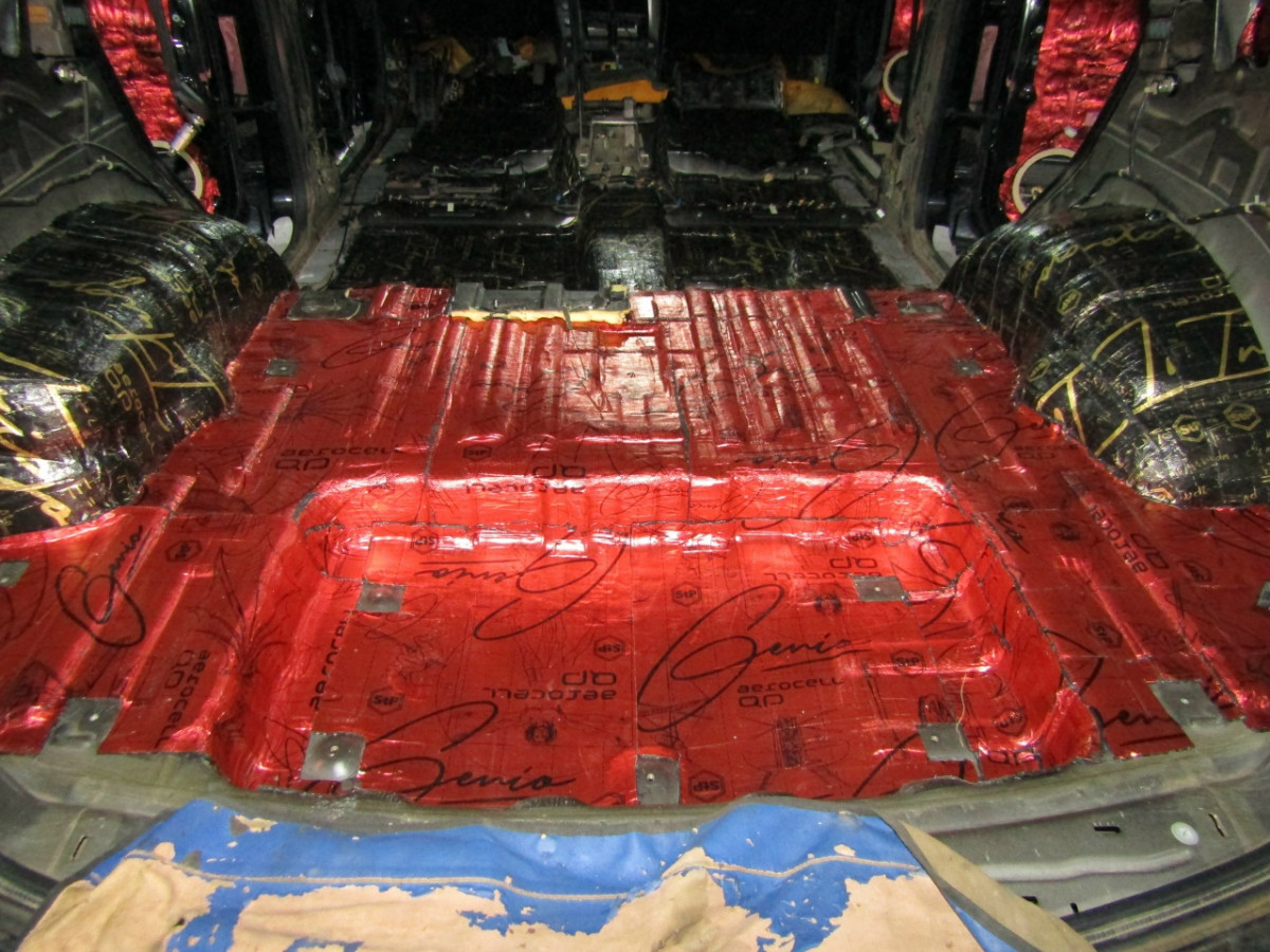 После уборки в багажнике, очищения и обезжиривания поверхностей на днище наносится эффективный антивибрационный материал STP Aerocell Genio. Задние арки дополнительно проклеиваются STP Aerocell Intrigo. Он отлично справляется с подавлением сильных вибраций.