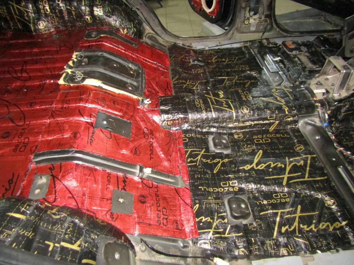 Первым слоем устанавливается STP Aerocell Intrigo. Его прикатывают к металлу, не оставляя пузырей. Так материал будет подавлять значительную часть вибраций, которым подвержен пол автомобиля. Следующий слой делается из STP Noise Block.