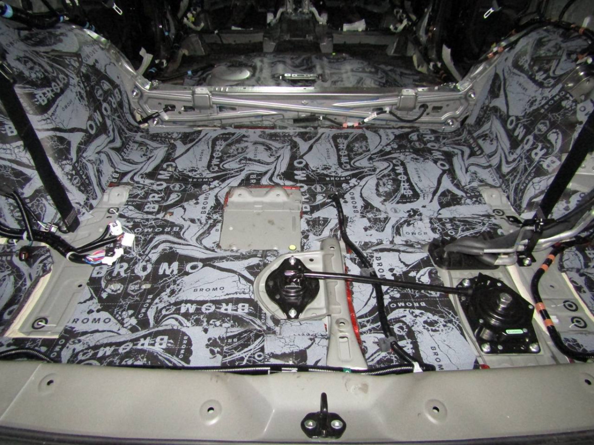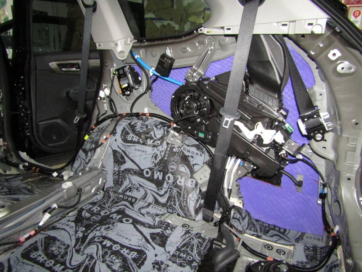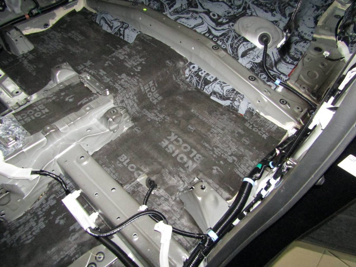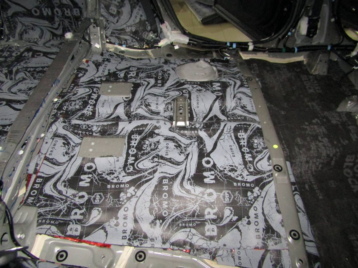 Делается второй слой из многофункционального материала STP Bromo. Дополнительно используется премиальный шумопоглотитель Biplast Premium толщиной 15 мм на задние арки и крышку багажника, устраняющий реверберации.
