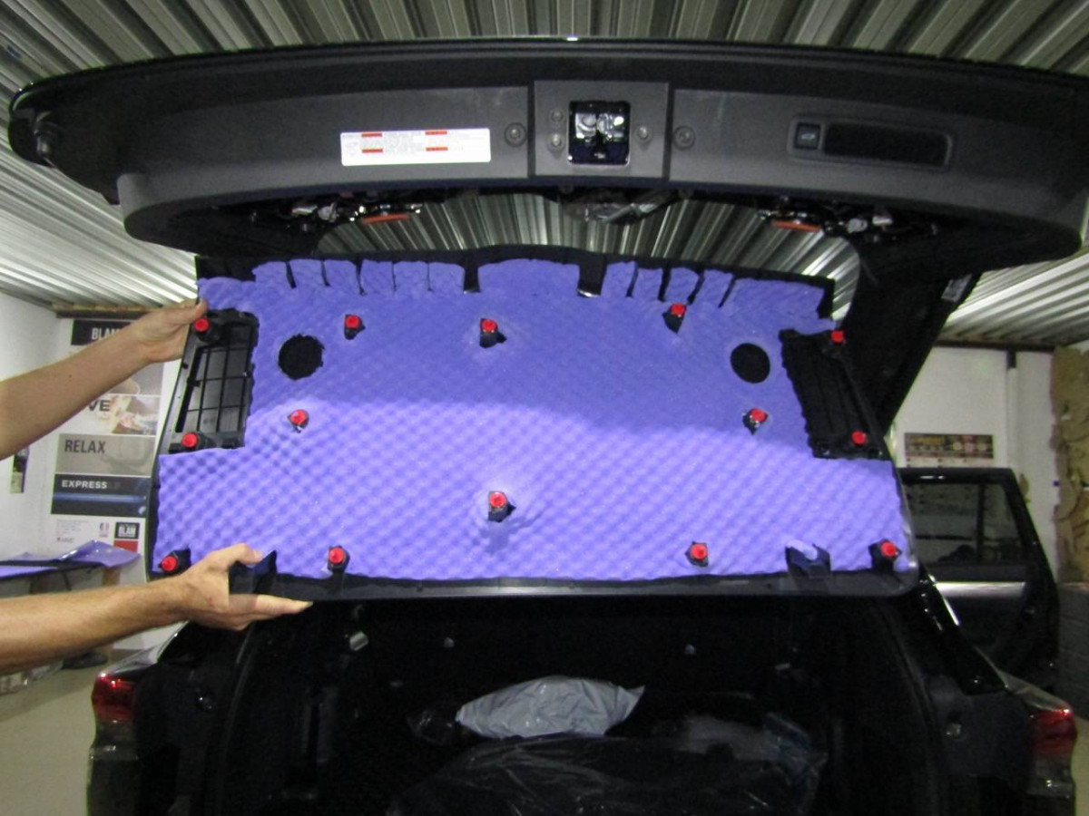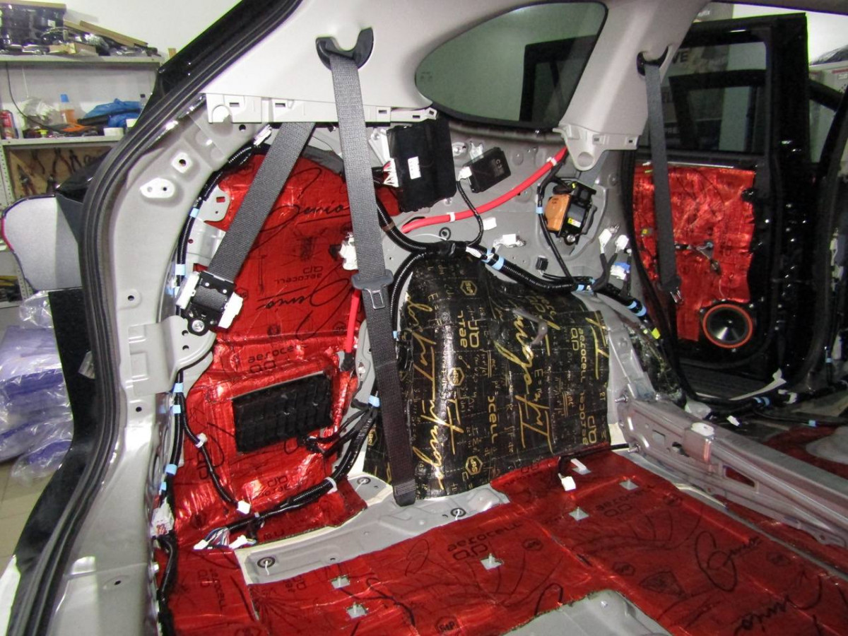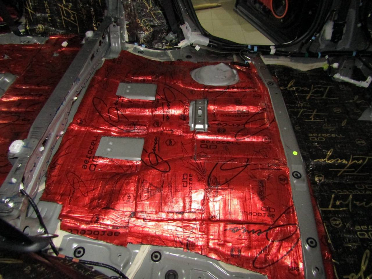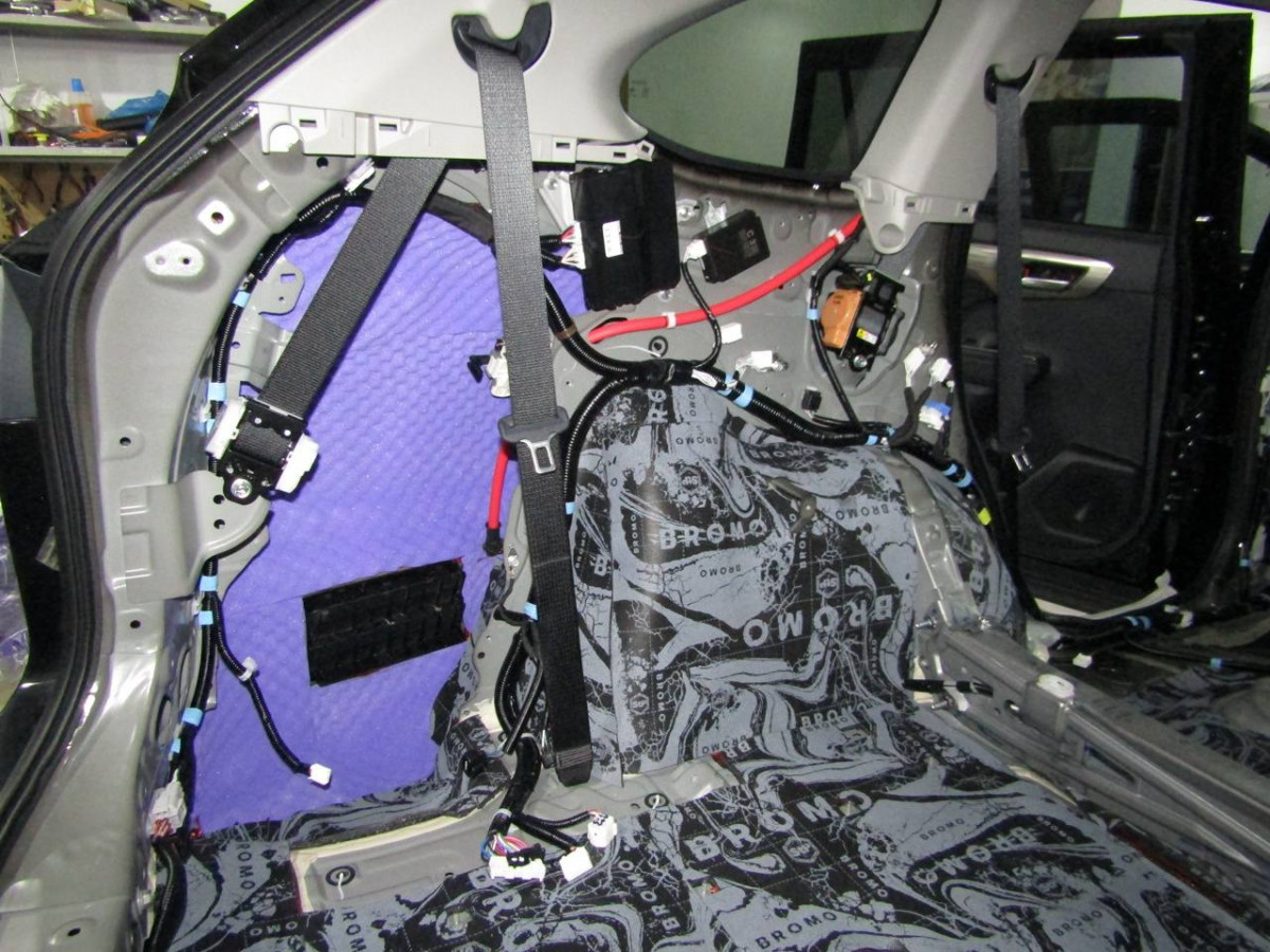 Делается второй слой из многофункционального материала STP Bromo. Дополнительно используется премиальный шумопоглотитель Biplast Premium толщиной 15 мм на задние арки и крышку багажника, устраняющий реверберации.