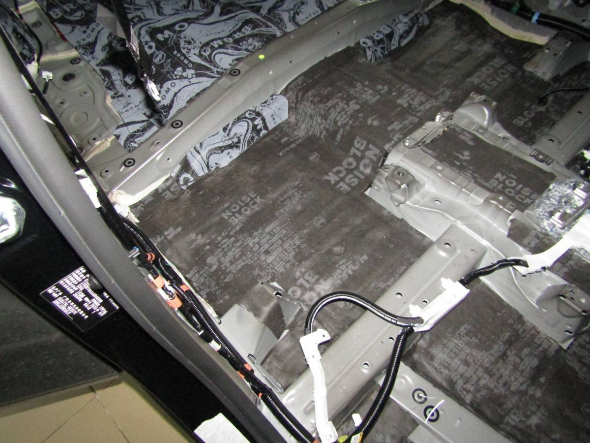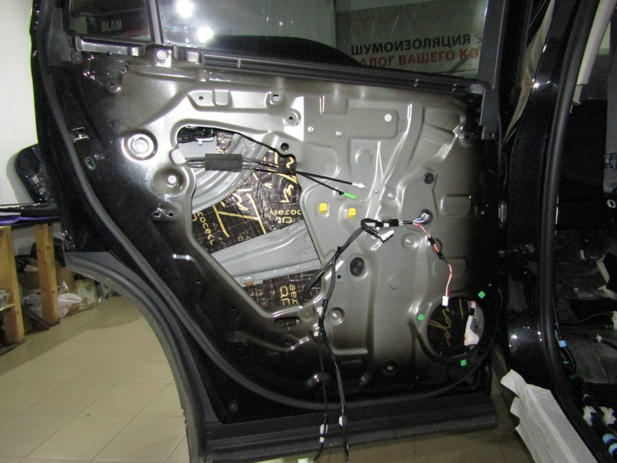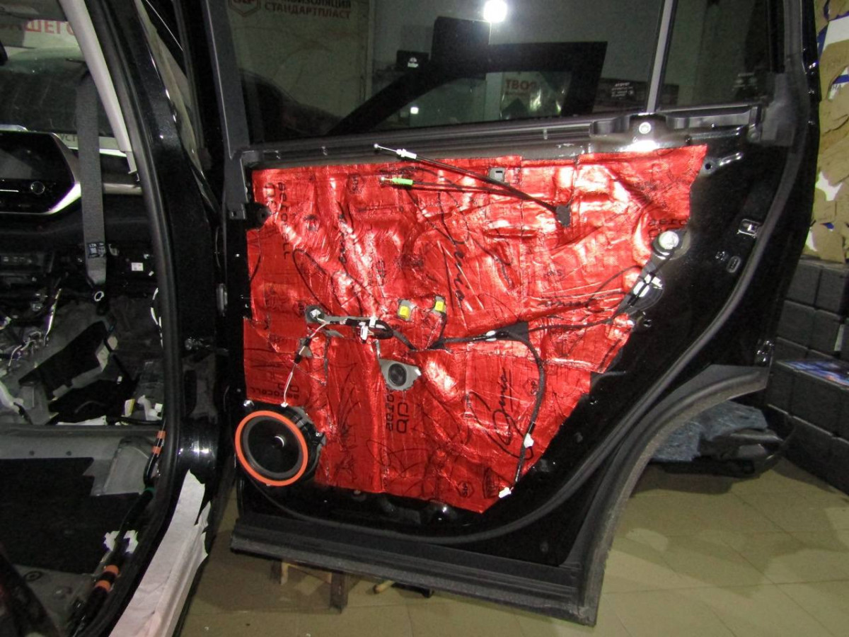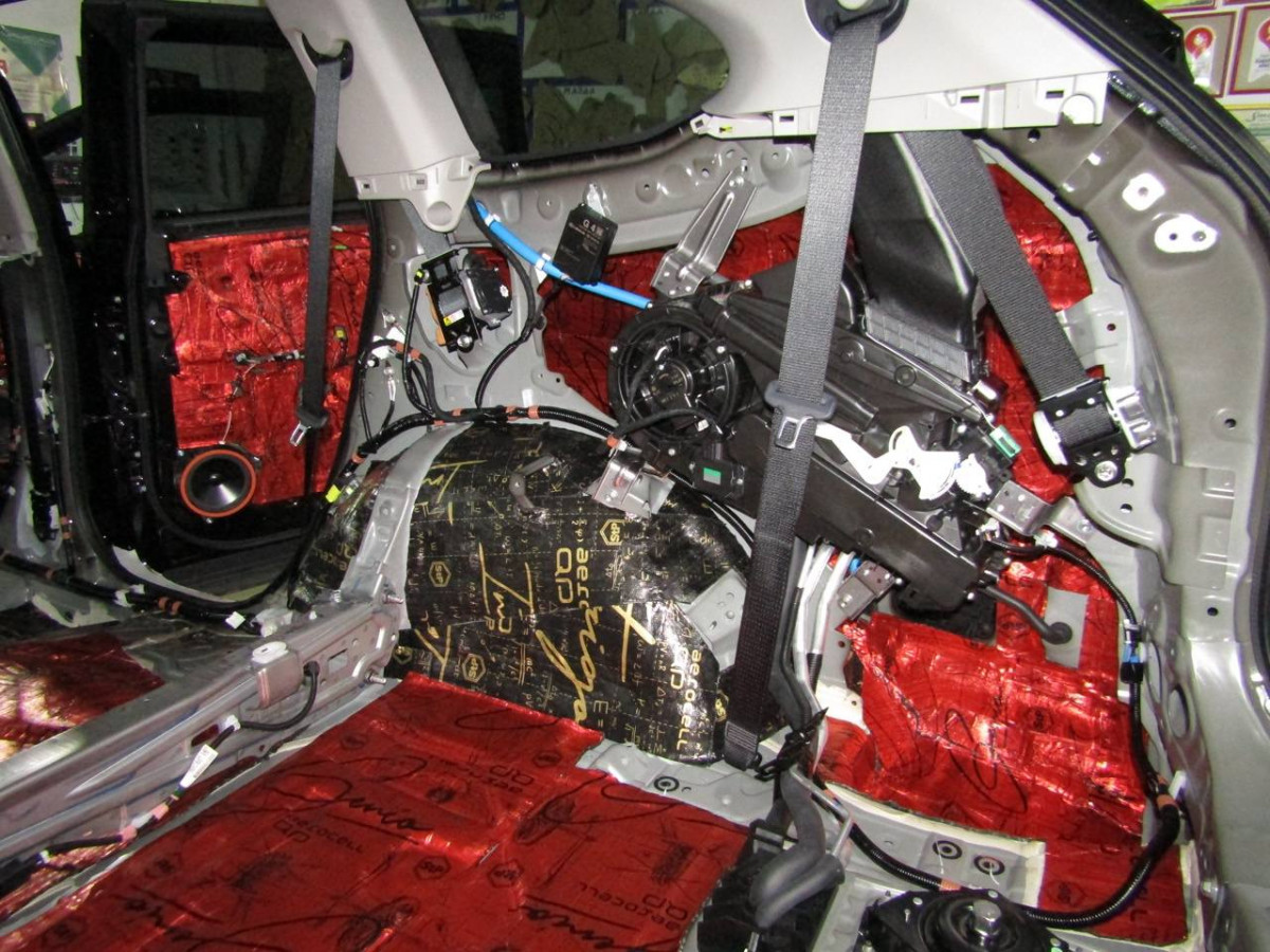 Делается второй слой из многофункционального материала STP Bromo. Дополнительно используется премиальный шумопоглотитель Biplast Premium толщиной 15 мм на задние арки и крышку багажника, устраняющий реверберации.