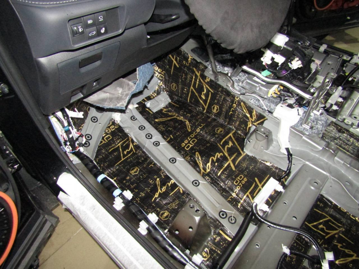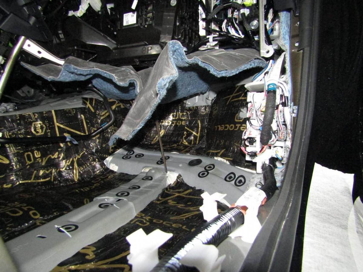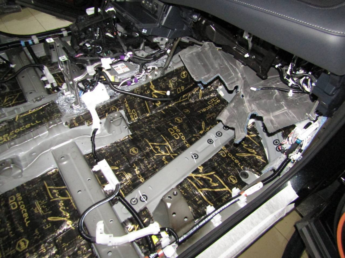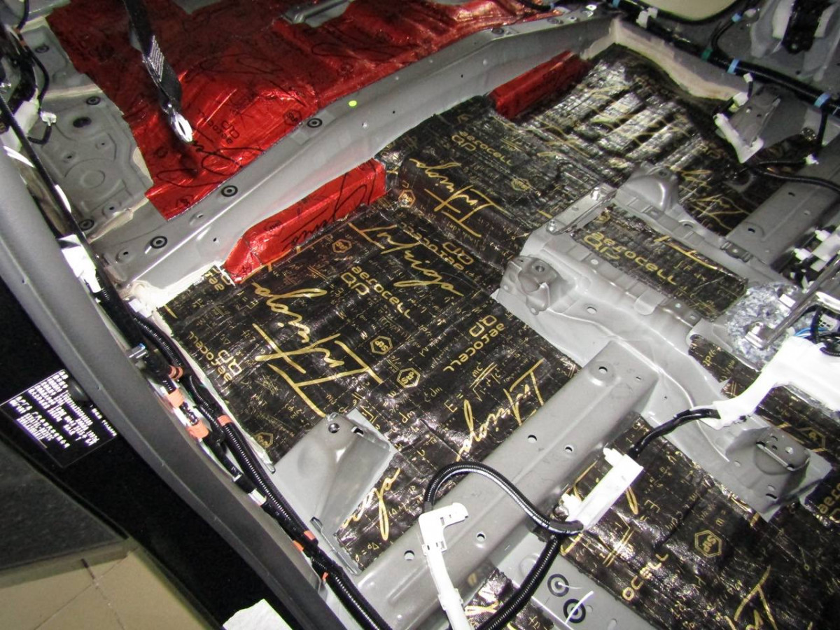 Из-за вибрации днища в салоне возникает шум. Установив шумоизоляционные материалы на пол, вы сделаете автомобиль более комфортабельным. Здесь используется плотный вибродемпфер STP Aerocell Intrigo. Толстый материал надежно защищает даже от самых сильных вибраций. Пол под задними сиденьями закрывается STP Aerocell Genio.