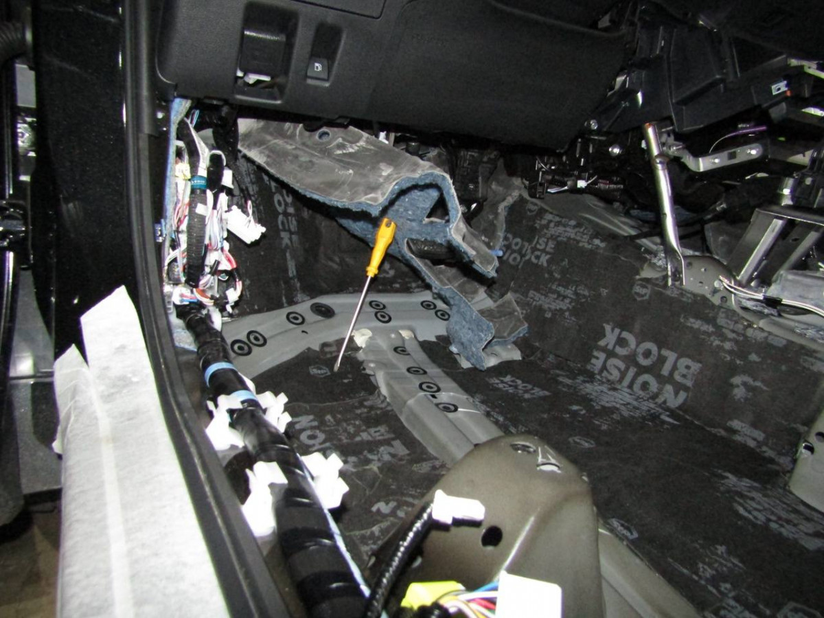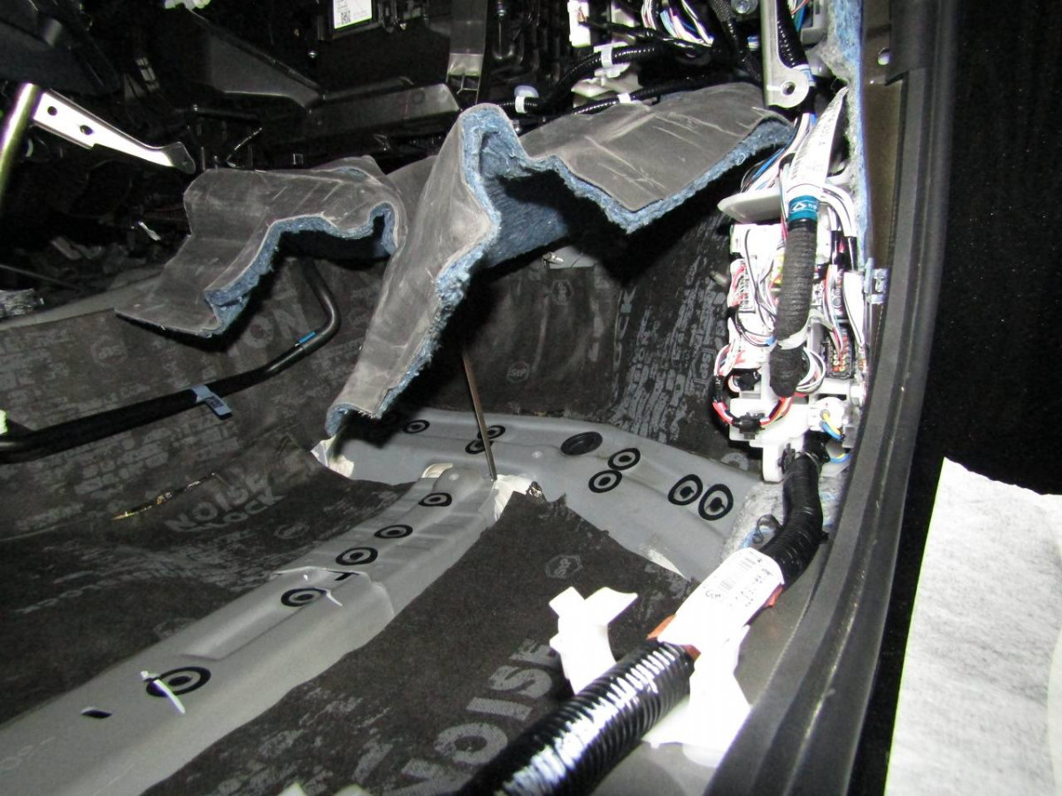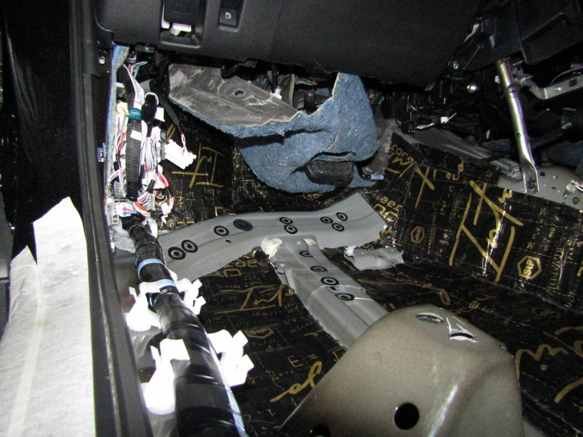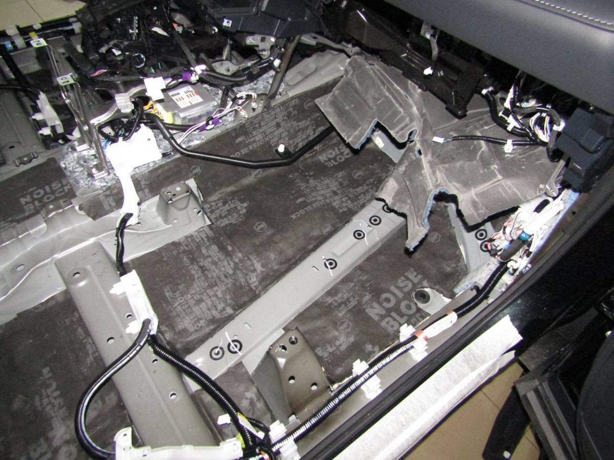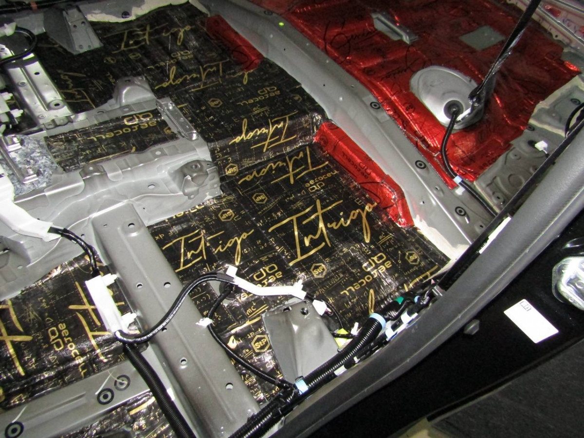 Из-за вибрации днища в салоне возникает шум. Установив шумоизоляционные материалы на пол, вы сделаете автомобиль более комфортабельным. Здесь используется плотный вибродемпфер STP Aerocell Intrigo. Толстый материал надежно защищает даже от самых сильных вибраций. Пол под задними сиденьями закрывается STP Aerocell Genio.