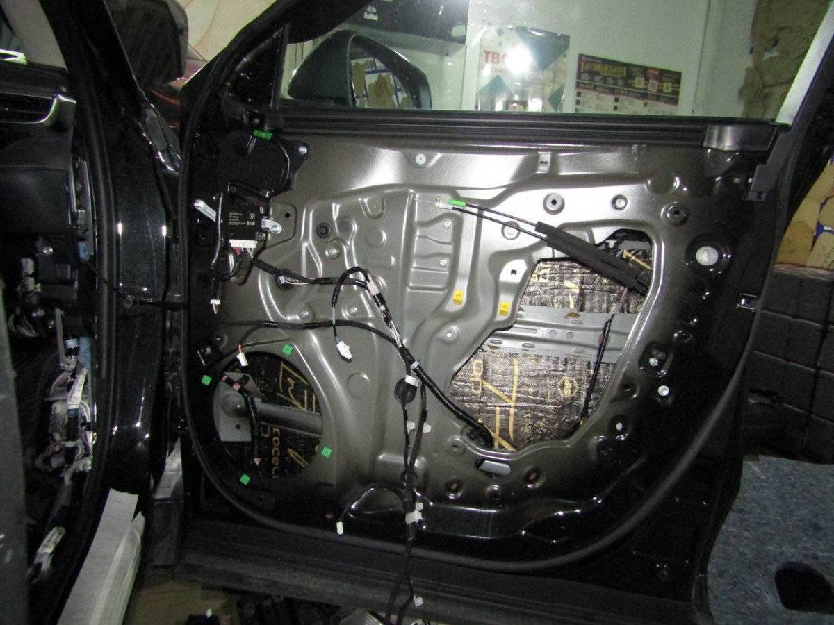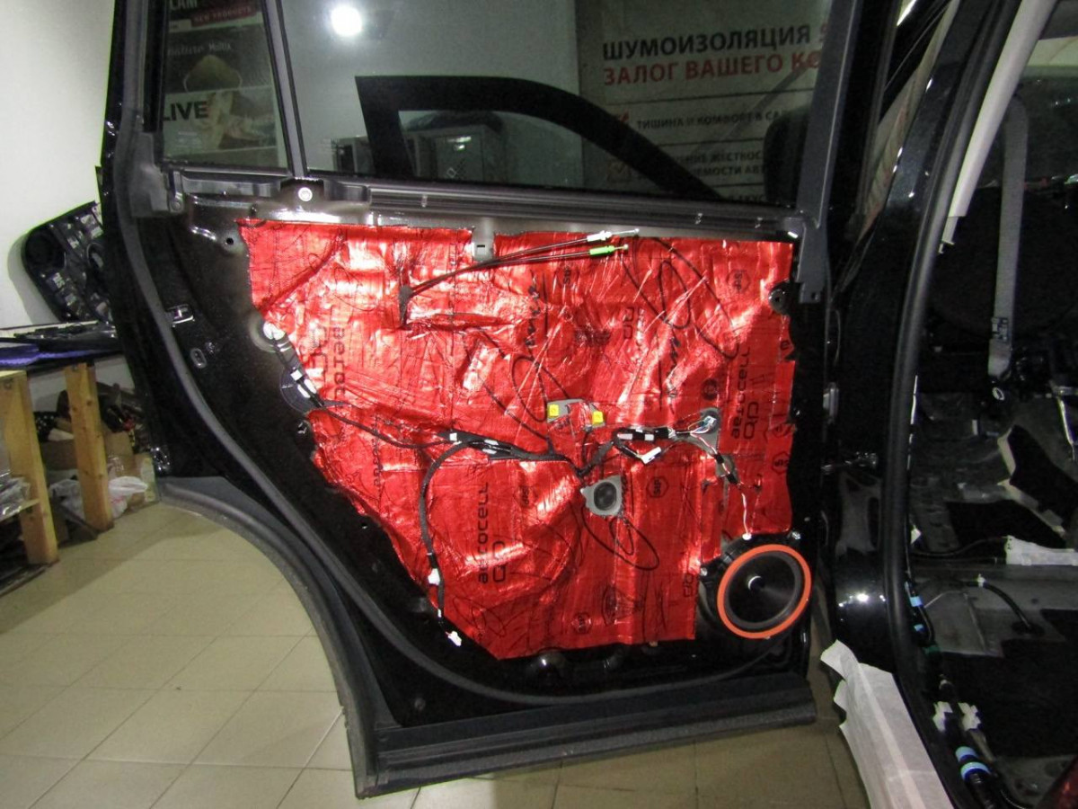 На металлическую часть двери первым наносится тонкий и легкий STP Aerocell Intrigo. Этот материал обладает шумоизоляционными, герметизирующими и антикоррозийными свойствами. Благодаря структуре, материал защищает и от посторонних звуков, и от холода. Для закрытия лишних технологических отверстий применяется STP Aerocell Genio. На последнем этапе шумоизоляции устанавливается Biplast Premium.