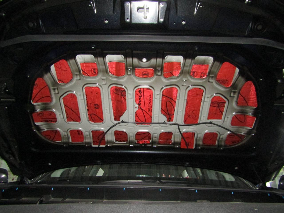 При комплексной шумоизоляции обязательно оклеивают крышку капота, что помогает избавиться от громких шумов, издаваемых двигателем. На этом этапе также используются вибродемпферы и звукопоглотители. На области между ребрами жесткости наносится STP Aerocell Genio, из которого выкраиваются фрагменты нужных размеров и форм. Листы толщиной 4 мм прочно фиксируются на поверхностях и активно подавляют шумы.